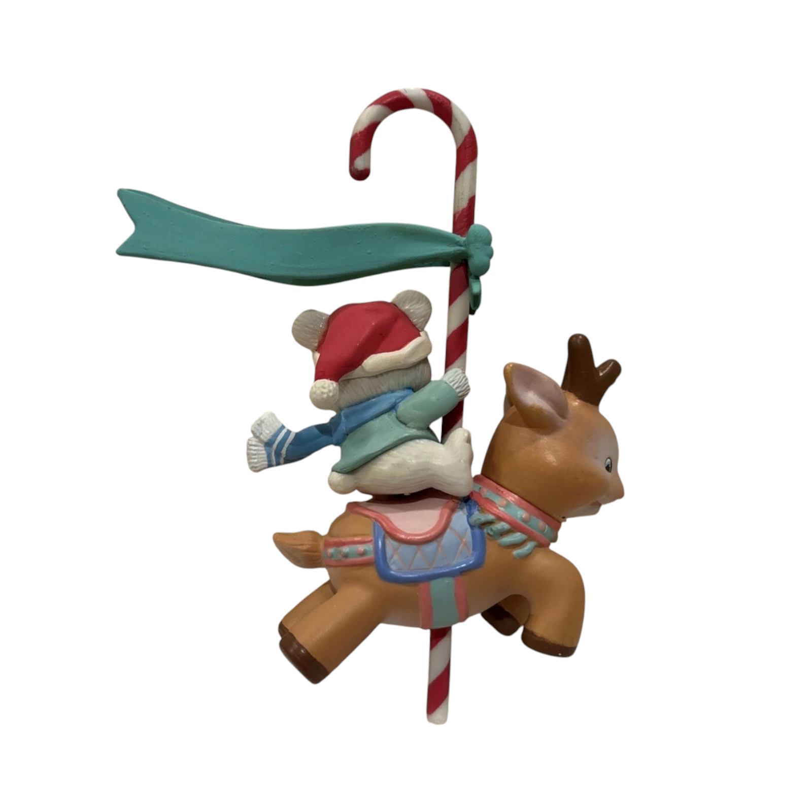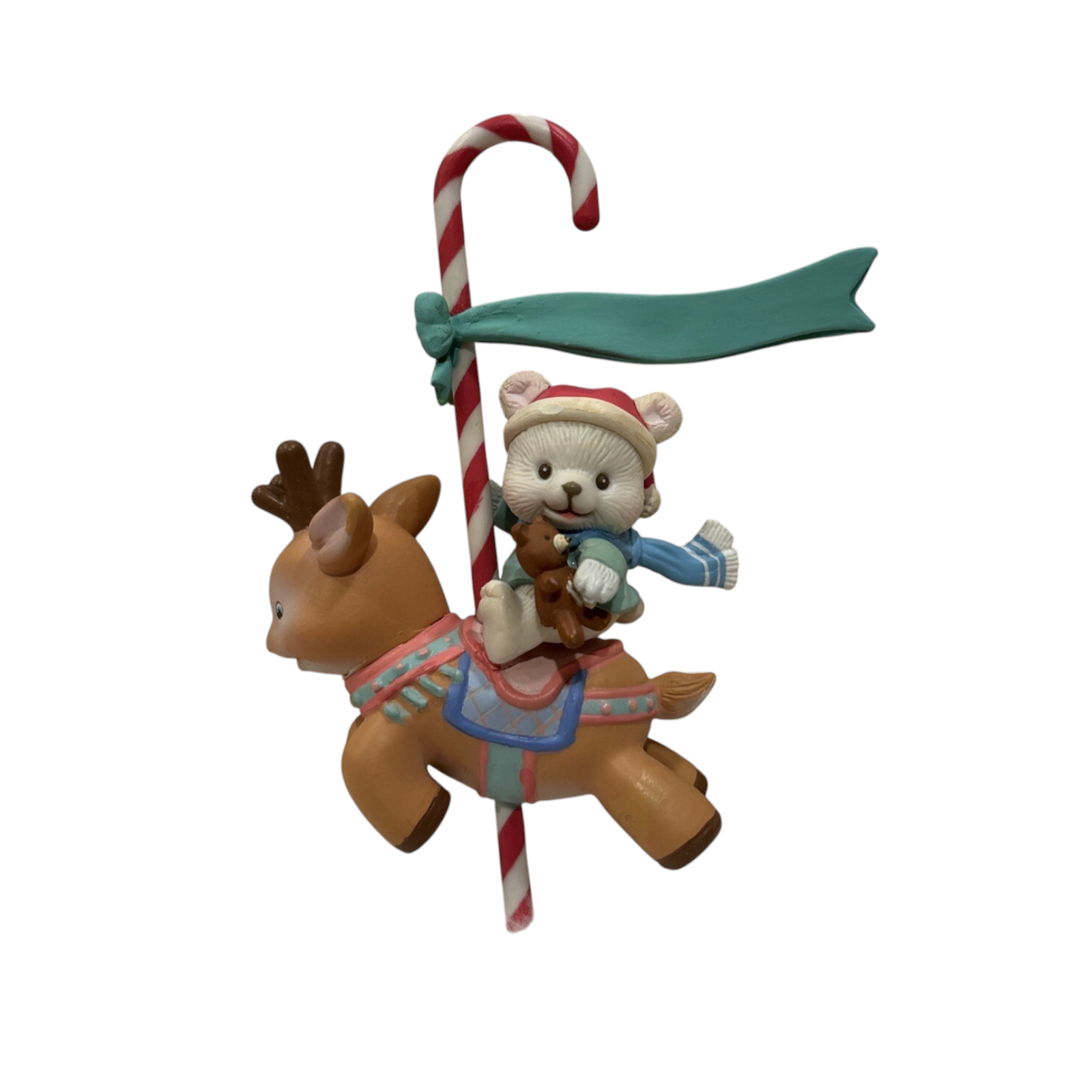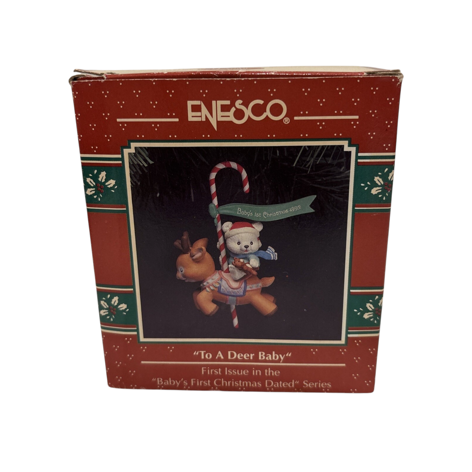 Celebrate the sweetness of winter with the 1992 Enesco “To a Deer Baby” ornament, item 587168. This heartwarming design features an adorable polar bear tenderly presenting a tiny reindeer toy, symbolizing love and the joy of giving. Hand-painted in soft pastel hues with charming facial detail, it reflects Enesco’s craftsmanship and sentimental holiday artistry of the early 1990s. A wonderful collectible for animal lovers and vintage ornament enthusiasts, this piece brings warmth, nostalgia, and gentle whimsy to any Christmas tree.