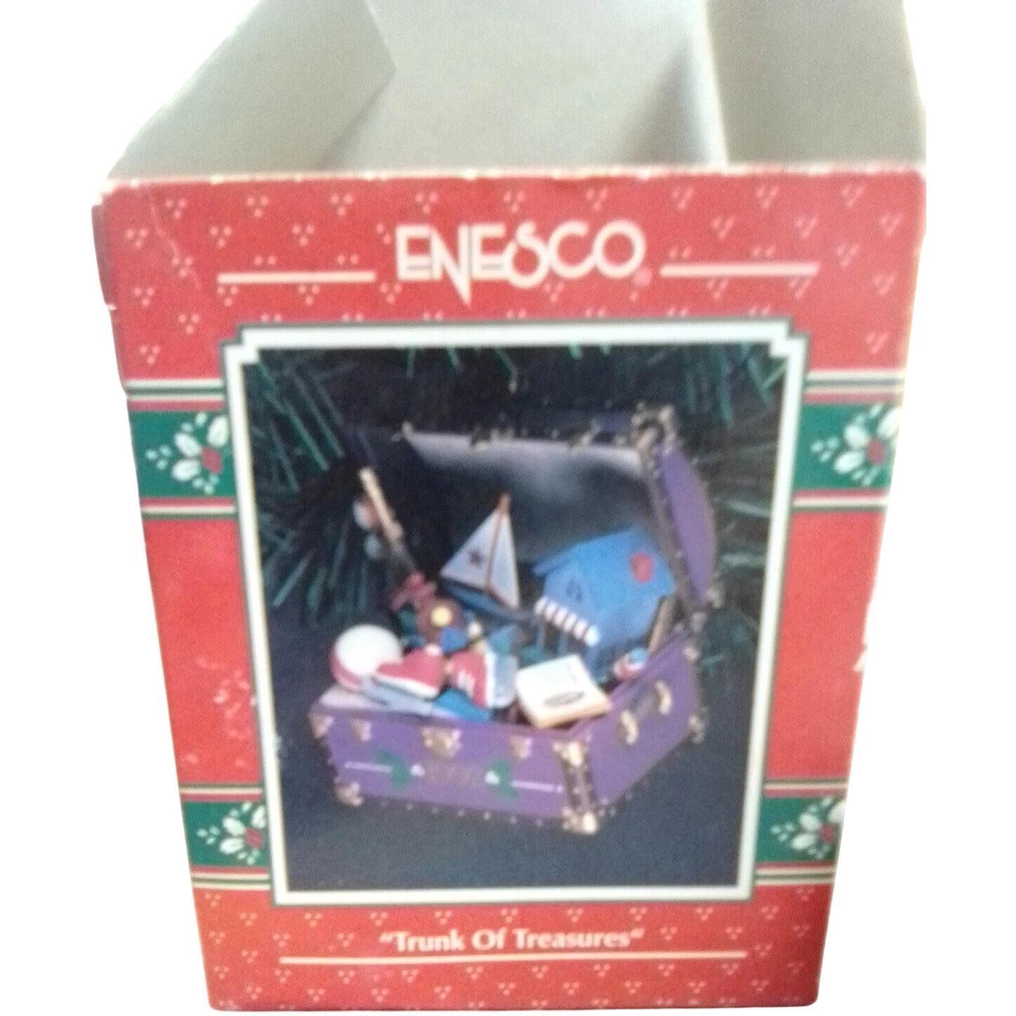 Celebrate the wonder of discovery with the 1992 Enesco “Trunk of Treasures” ornament, item 588636. This charming collectible features a playful elephant opening a festive treasure trunk filled with holiday surprises and toys. Hand-painted in warm pastel tones with intricate detailing, it reflects Enesco’s 1990s craftsmanship and heartwarming storytelling style. A delightful piece for animal lovers, collectors, or anyone who cherishes nostalgic ornaments, this piece brings curiosity, color, and Christmas joy to any tree or festive display.