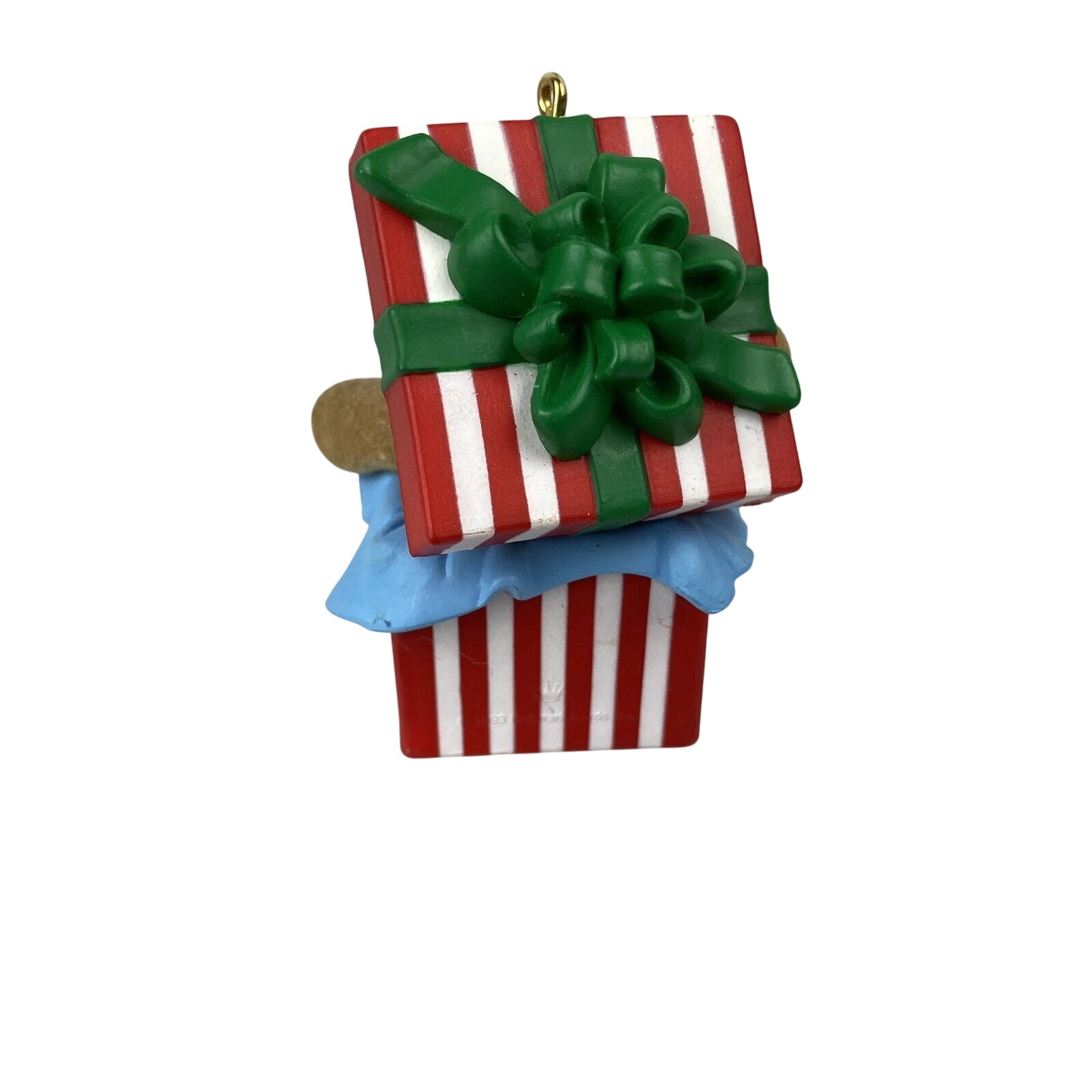 Celebrate the sweetness of childhood with this 1993 A Child’s Christmas ornament. A fluffy teddy bear playfully pops out of a wrapped present, perched atop a classic Keepsake box—capturing both wonder and surprise. The box includes personalization instructions offering “6 Ways to Personalize,” making it a deeply meaningful gift for family or keepsake collections. This piece typically includes the original box and hangs effortlessly on the tree—no batteries, cords, or extra accessories required.