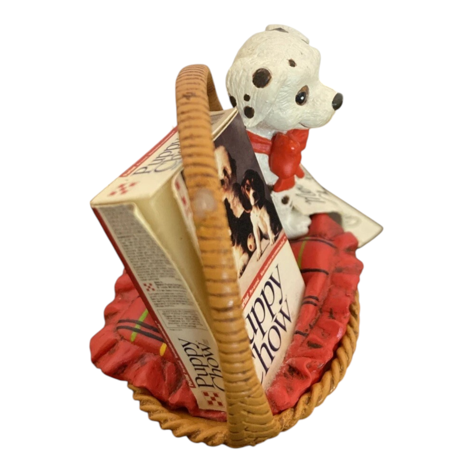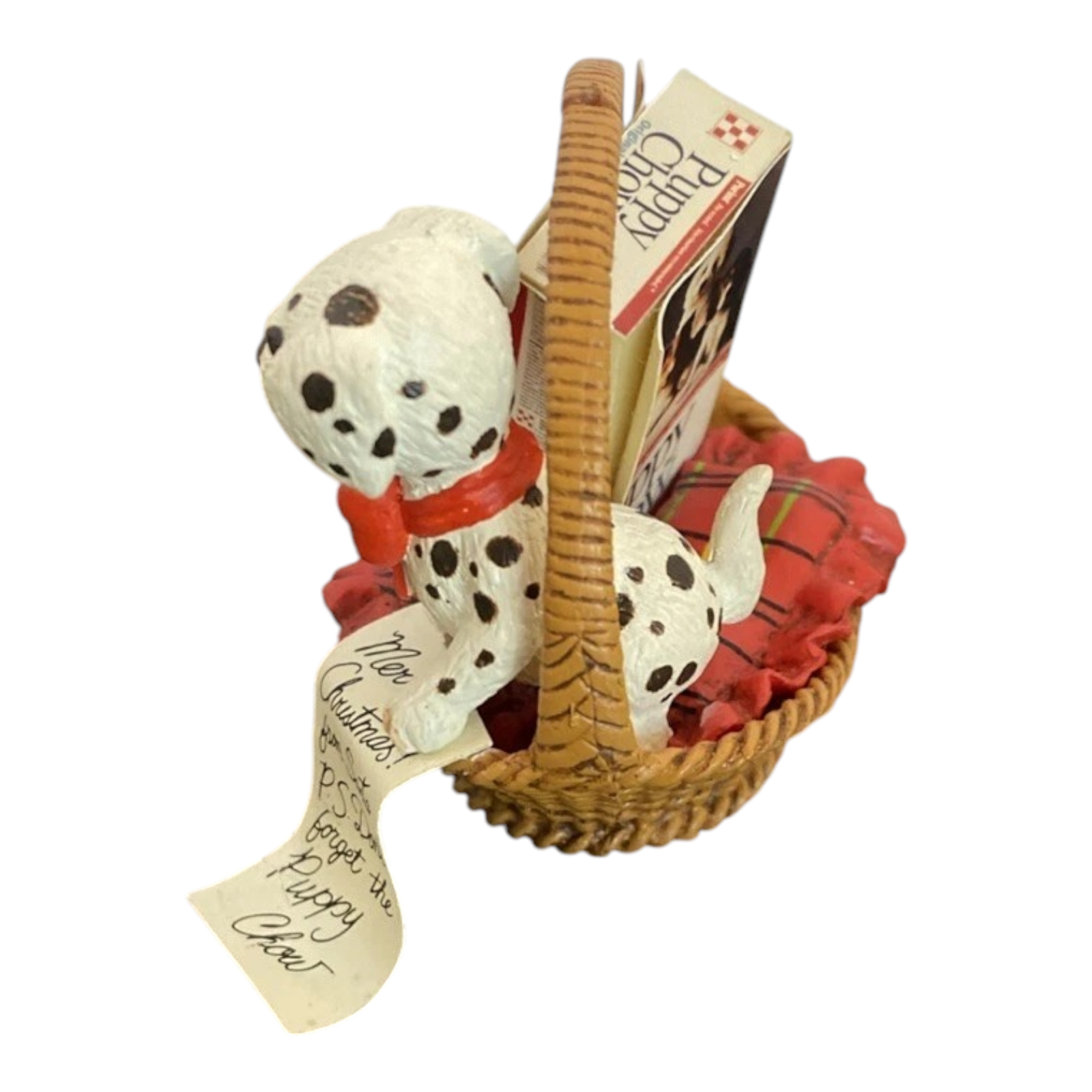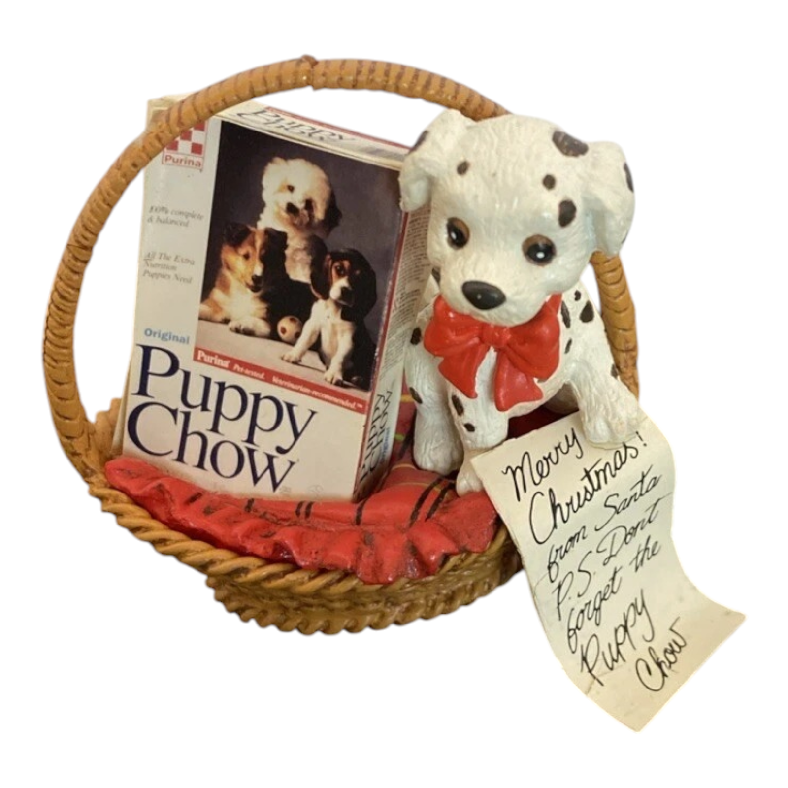Celebrate holiday warmth and canine charm with this 1993 Puppy Chow themed ornament by Enesco, featuring an adorable Dalmatian puppy nestled inside a festive themed basket complete with Puppy Chow branding. The hand-painted molded plastic piece evokes delight and nostalgia — licensed from the Purina brand — making it a fun and collectible addition to any tree or dog-lover’s décor. Its vibrant multicolor detailing and festive messaging combine charm, brand licensing and holiday appeal into a memorable keepsake.