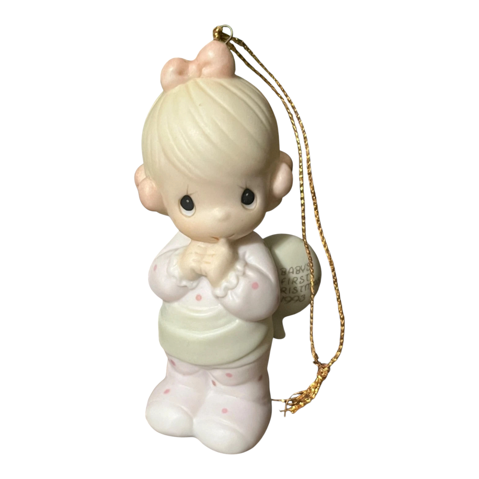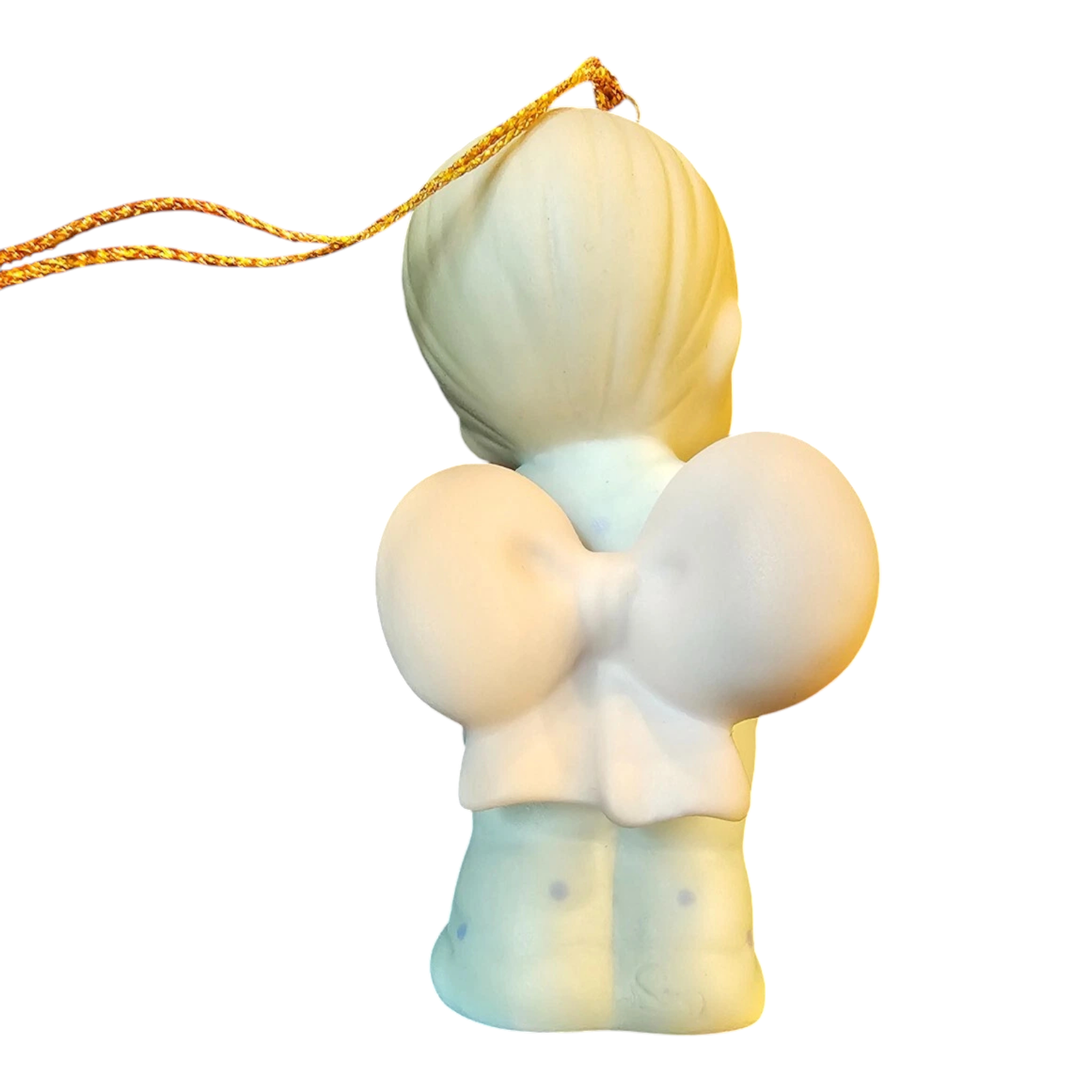Celebrate a baby’s inaugural holiday in heartwarming style with the 1993 Baby Boy’s First Christmas ornament, model #530859, from Precious Moments’ coveted Baby’s First Christmas series. This delicate porcelain hanging ornament features a cherubic baby boy in soft blue pajamas, nestled in a blanket wrap and holding a festive sign that reads “Baby’s First Christmas 1993.” The pastel tones, fine detailing, and signature Precious Moments eyes add a gentle, nostalgic charm to this keepsake piece.