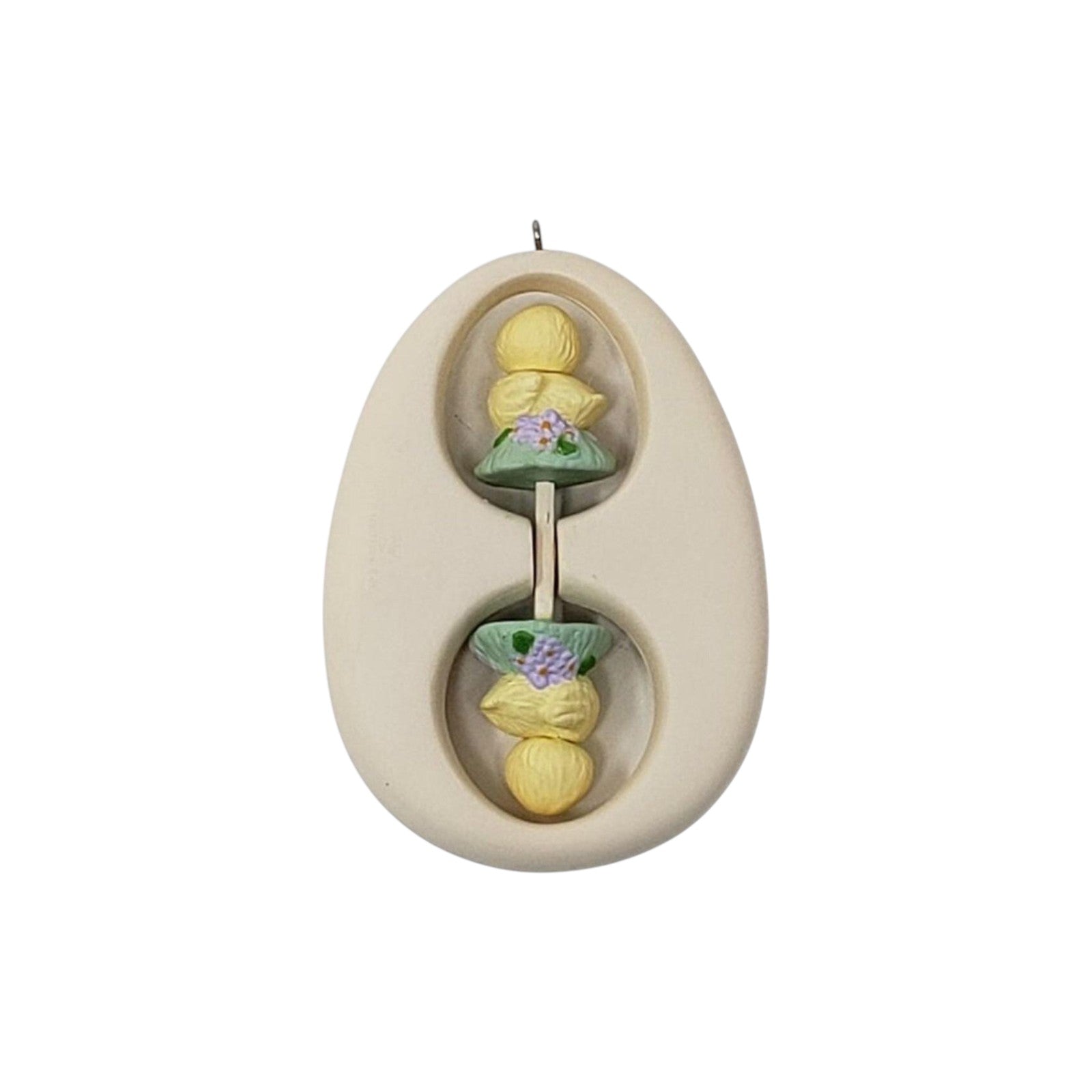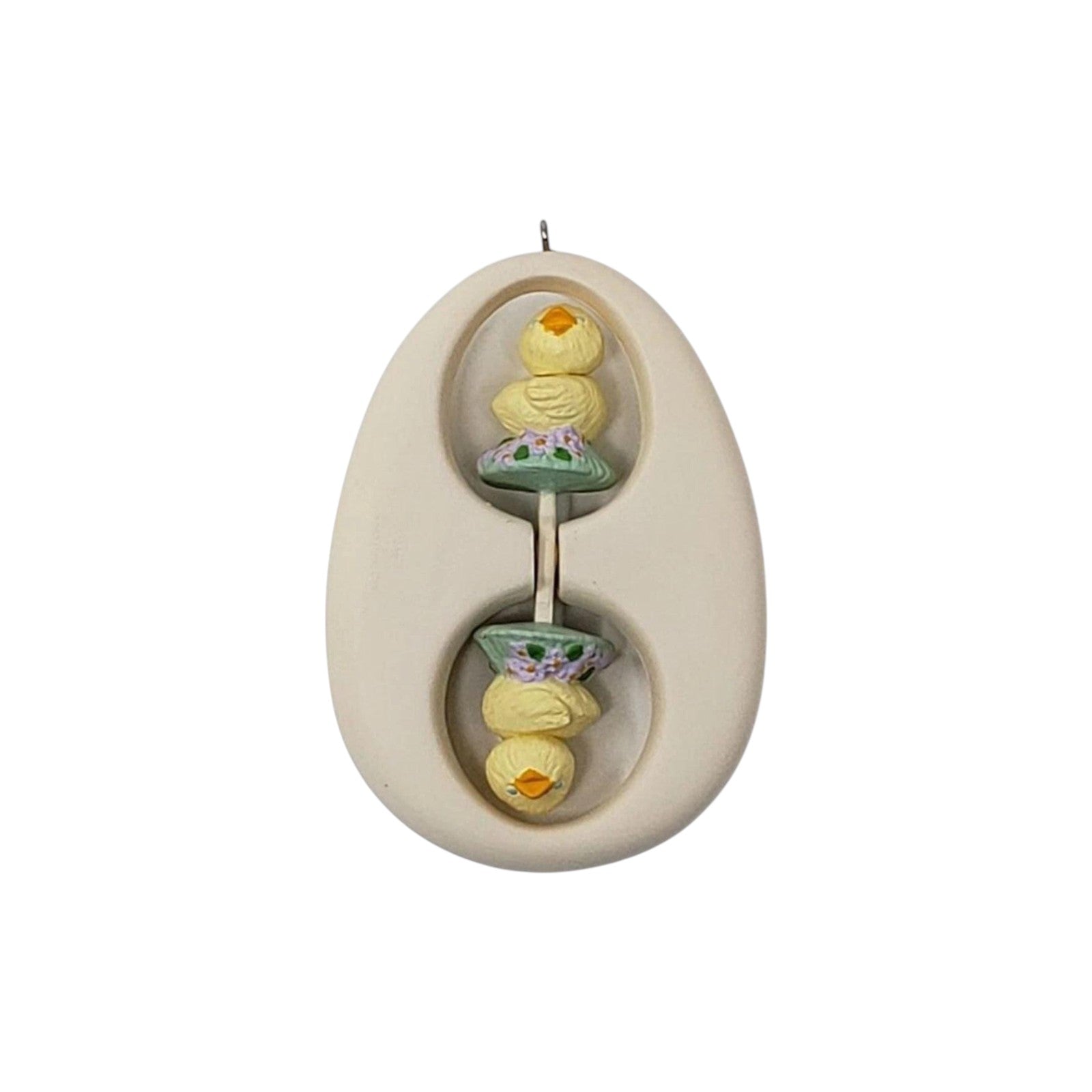 This delightful 1993 Twirl‑About™ miniature features a cute yellow chick balanced inside an egg-shaped frame—push the ornament gently and watch the chick spin around as spring magic. The egg is adorned with pastel floral accents and stamped with "1993." Included: original keepsake box, hanging cord, and tag—collector-grade condition. Decorative only: no lights, sound, or power needed.