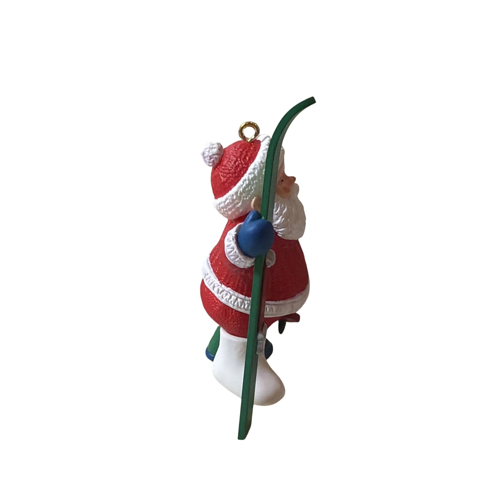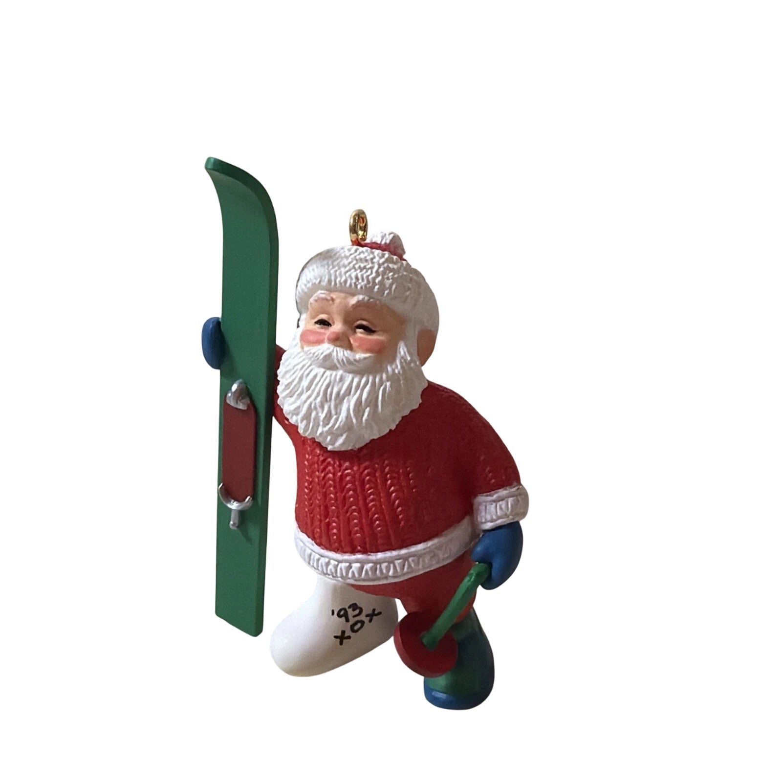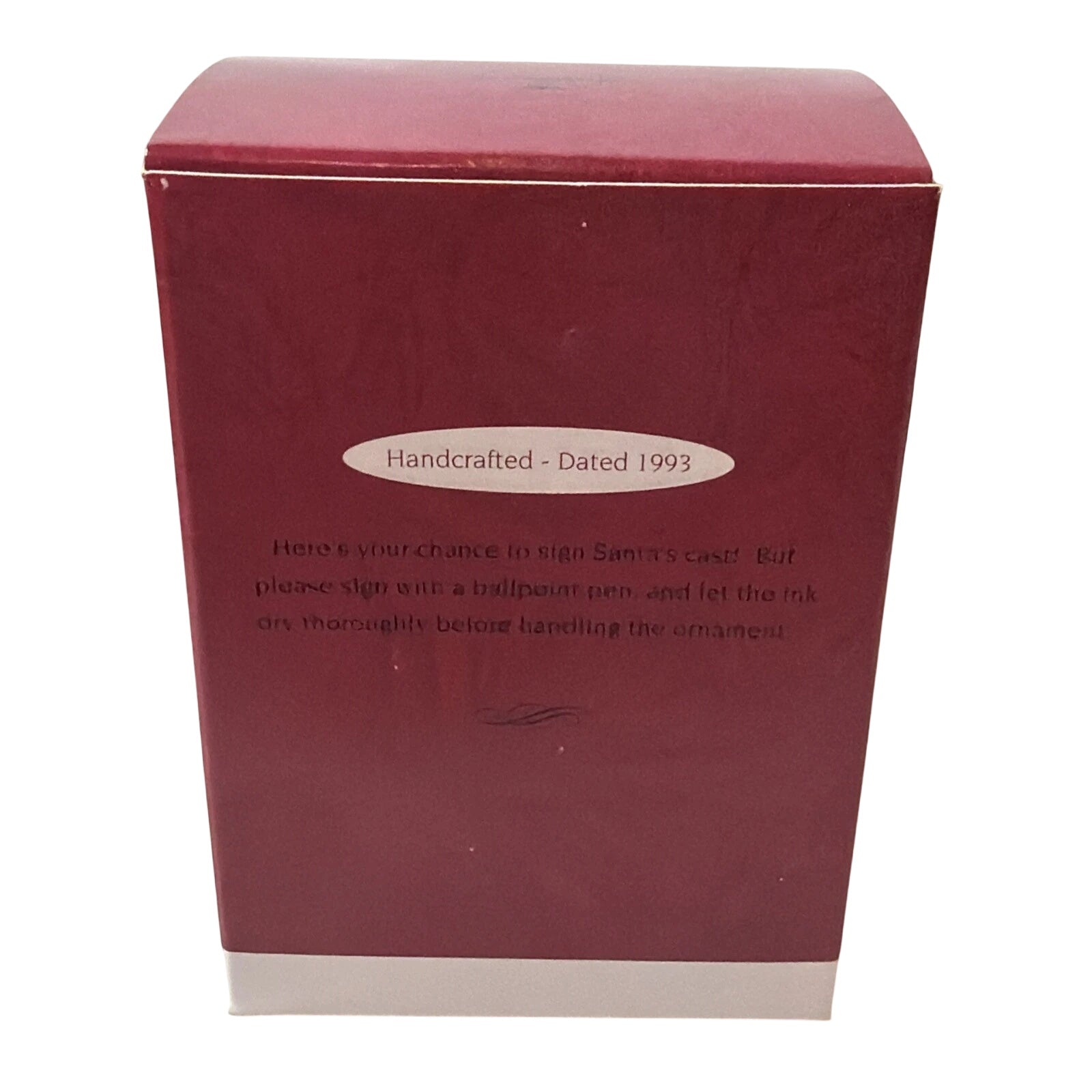 Take a playful pause with 1993 Christmas Break, featuring Santa taking a winter break—literally! This humorous keepsake shows Santa seated with skis in hand and a cast on his leg engraved ’93, hinting at a skiing mishap. Designed by Ed Seale, he stands about 3″ tall. The ornament arrives mint in its original box, complete with hanging loop and tag—no power or batteries needed. A whimsical favorite perfect for collectors and Santa lovers.