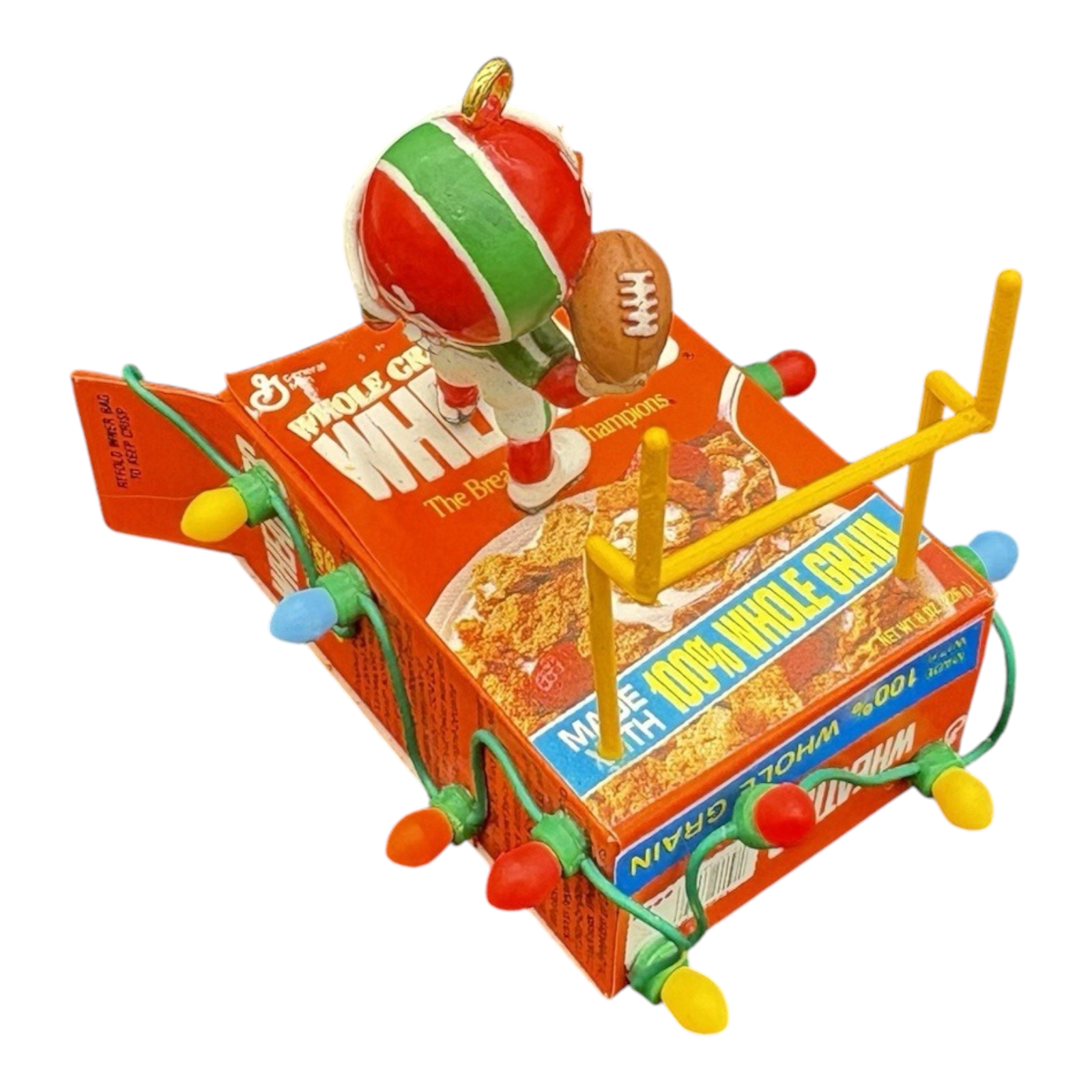 Celebrate game day and the holidays in one with this sporty 1993 “Christmas Kicks” ornament from Enesco’s licensed Wheaties collection. The piece features a football player in festive green-and-red uniform standing atop a Wheaties cereal box platform, with holiday lights and goal-post accents surrounding him. As the third issue in the “Breakfast of Champions” series, this collectible combines sports-memorabilia styling with seasonal charm. The hand-painted plastic/resin design carries strong nostalgia for both football fans and ornament collectors alike.