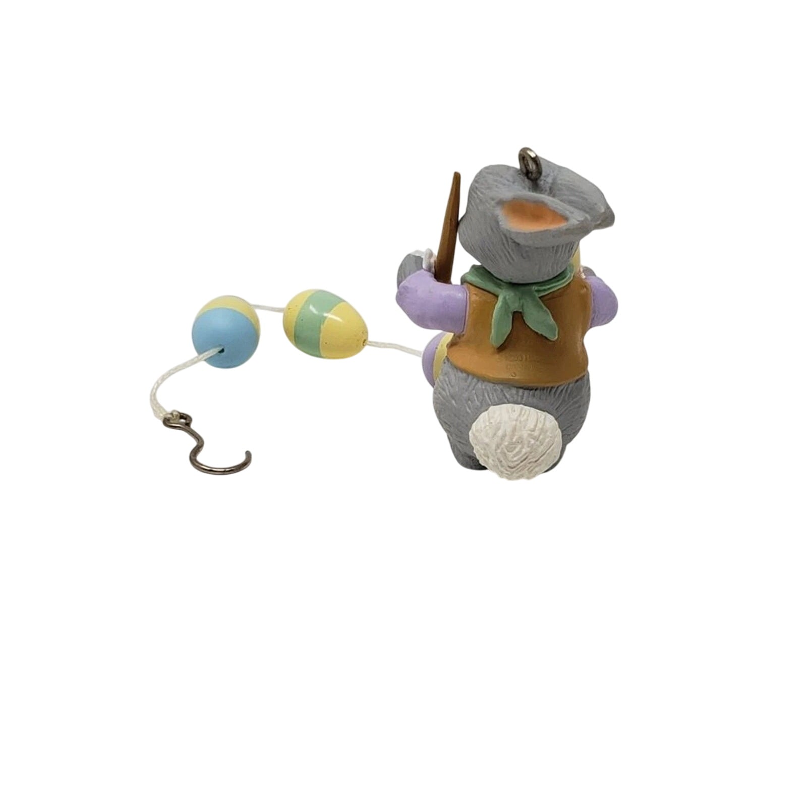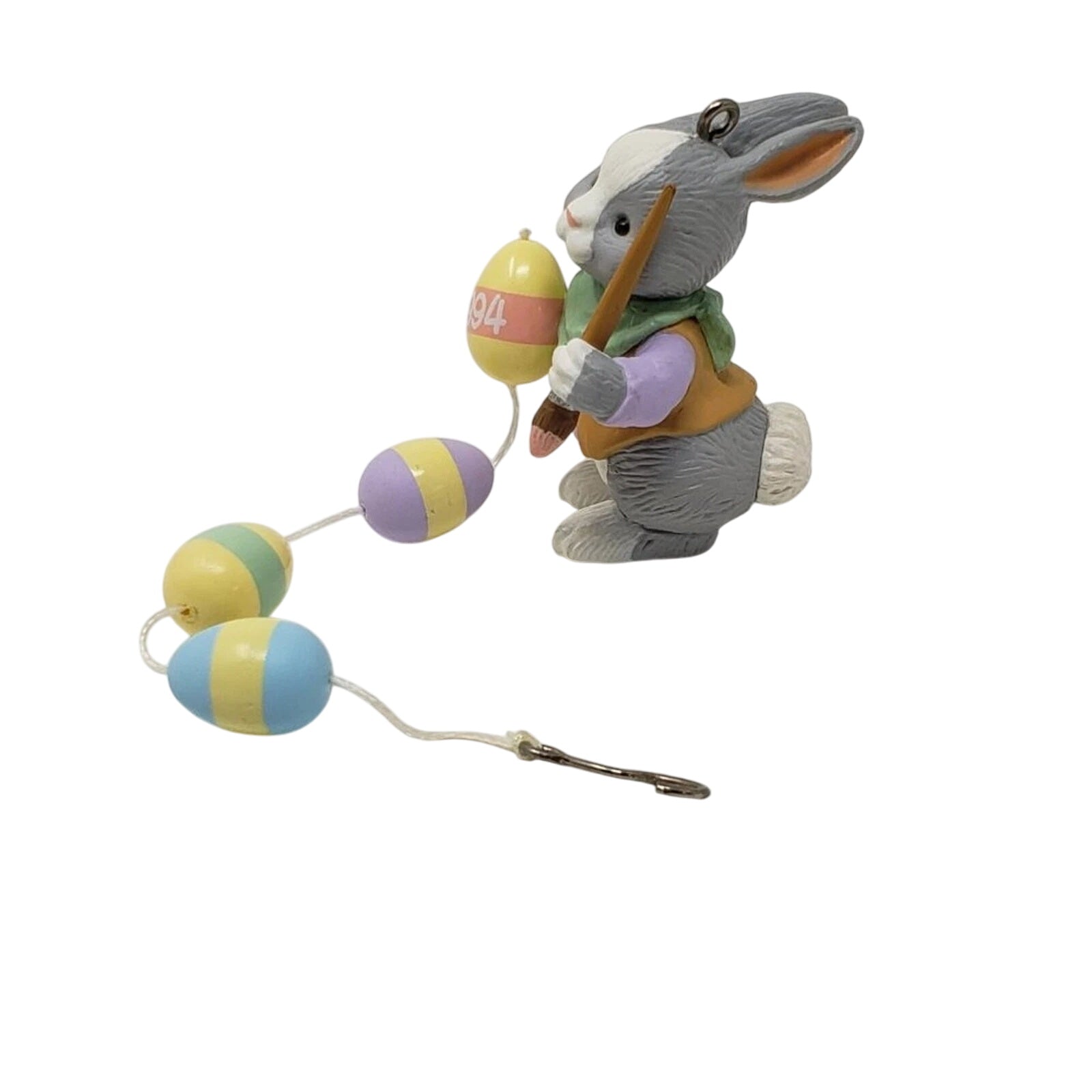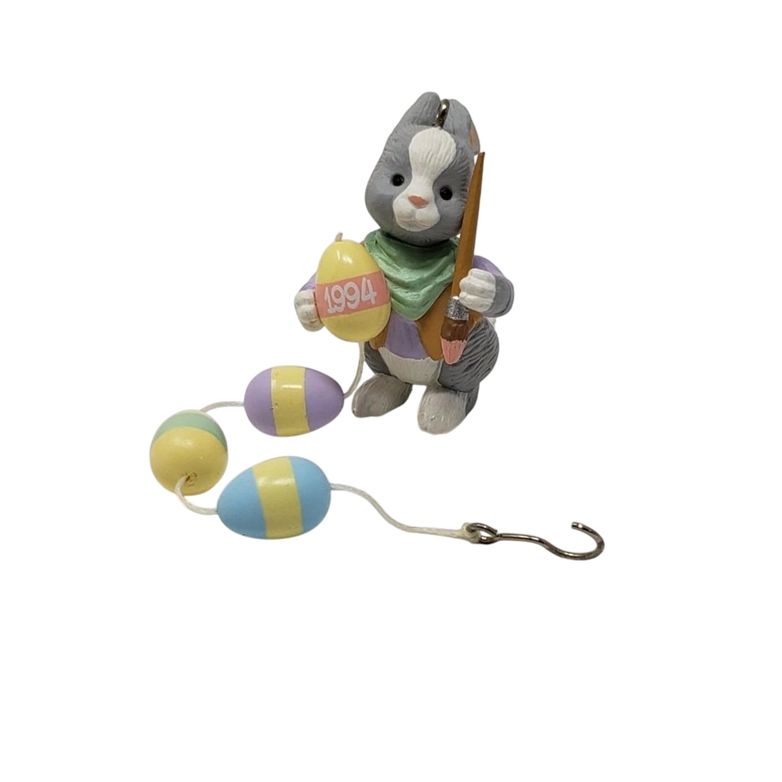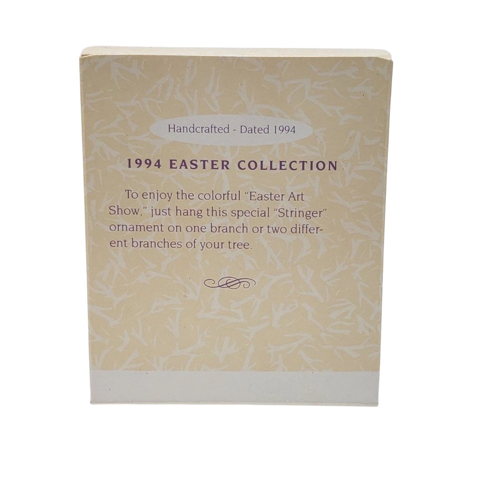 Celebrate creative springtime spirit with the 1993 Easter Art Show bunny ornament—a delightful keepsake featuring a bunny artist painting pastel‐decorated eggs suspended on a small stringer. The bunny holds a paintbrush and an egg marked with the year, draped over a tiny egg string. Packaged mint in its original Easter-themed box, often with tags or tissue intact, this miniature piece adds whimsical charm to your seasonal decor. No batteries, cords, or lights are required—simply hang and enjoy its artistic flair.