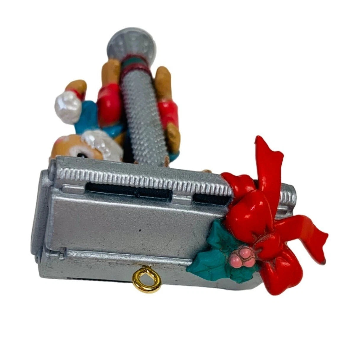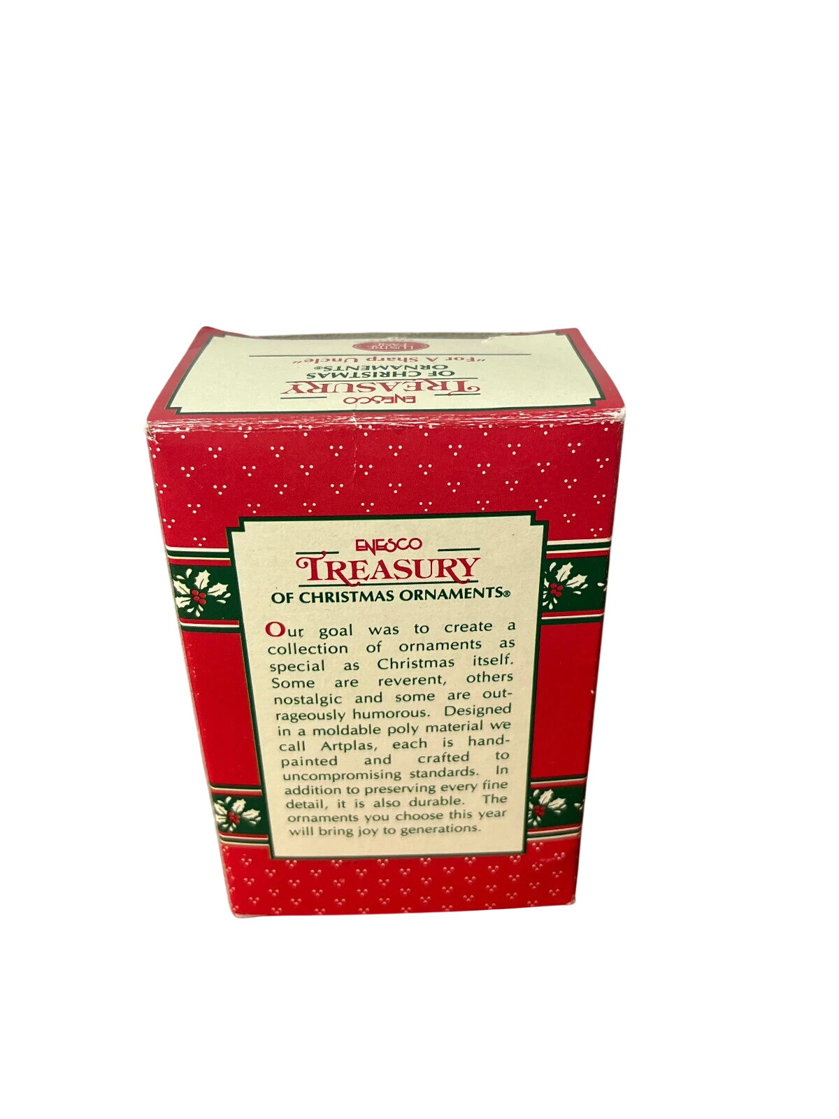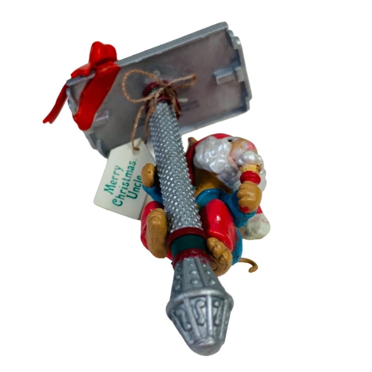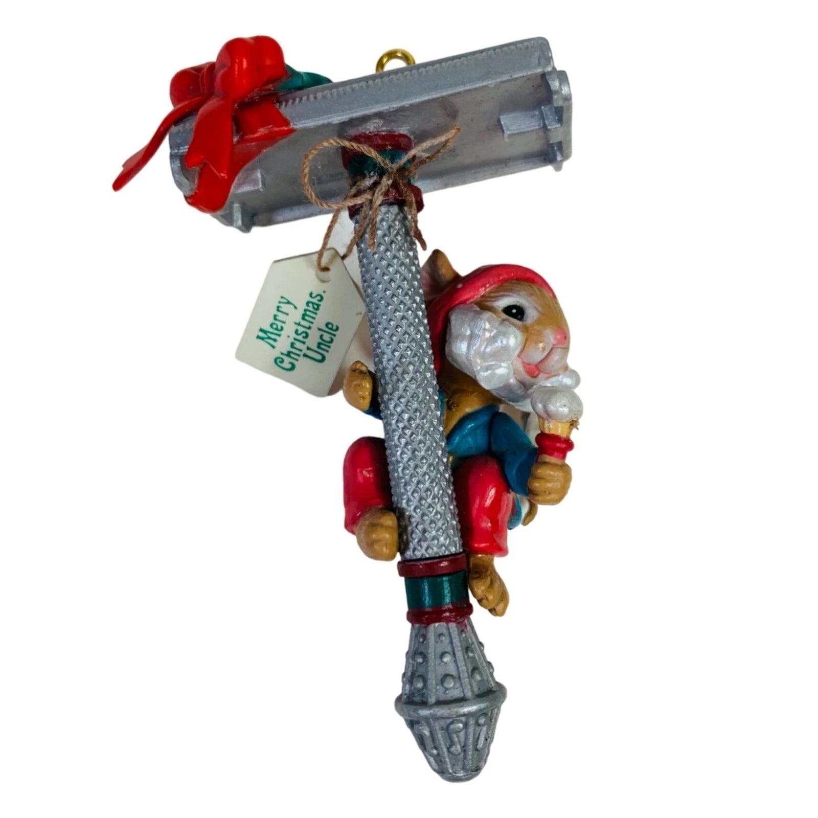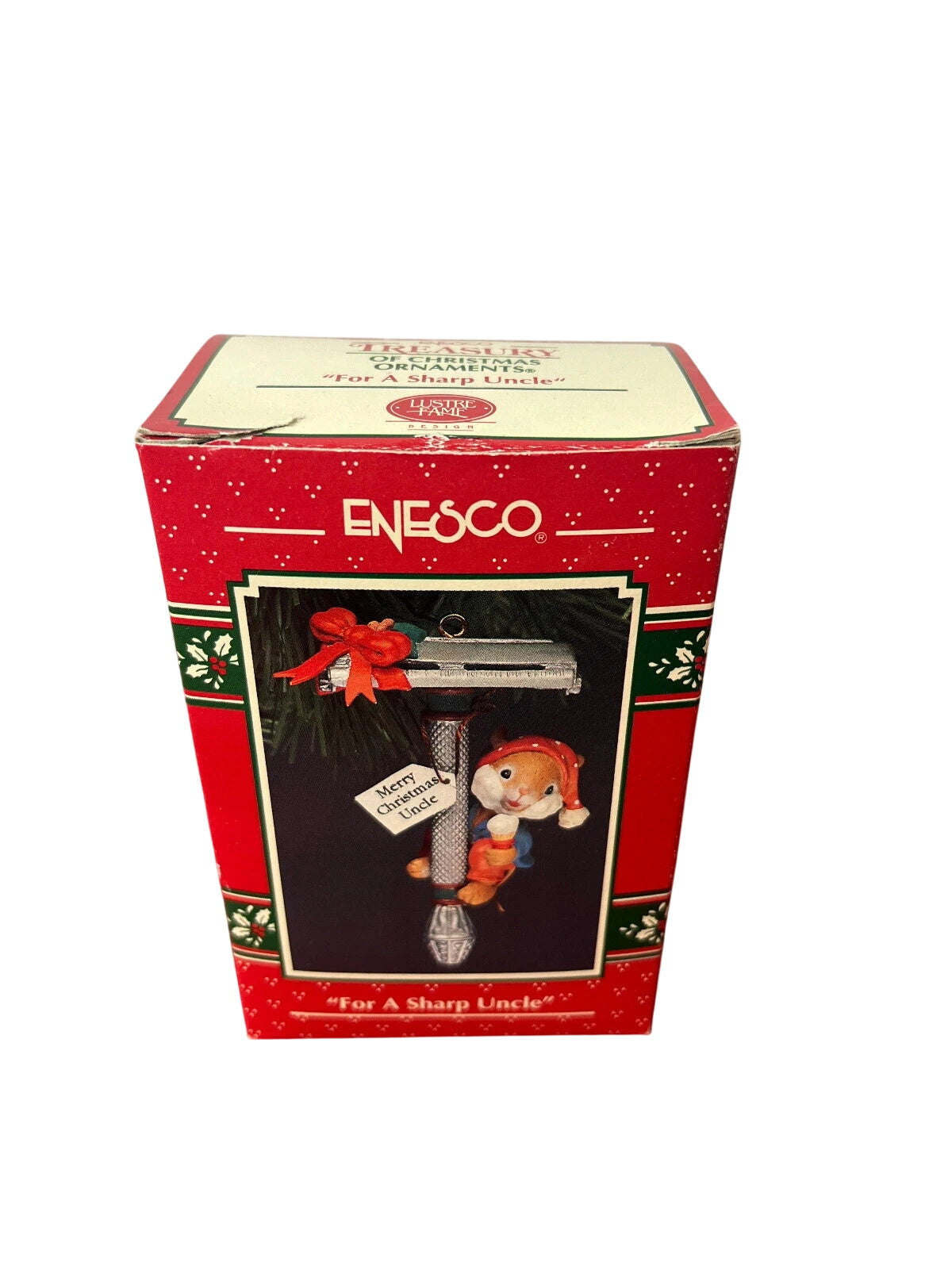 Celebrate your uncle’s sharp sense of humor (and maybe his razor-sharp style) with this playful 1993 Enesco ornament. It features a cheerful little mouse perched on a vintage straight-razor, holding a gift tag addressed to “Uncle,” in bright hand-painted detail. Molded plastic construction gives it a vintage charm with fun holiday whimsy, making it a perfect gift or humorous addition to a family-themed tree. With its quirky motif and collectible appeal, it works well for uncle-gifts, holiday décor collectors and fans of Enesco’s Treasury of Christmas line.