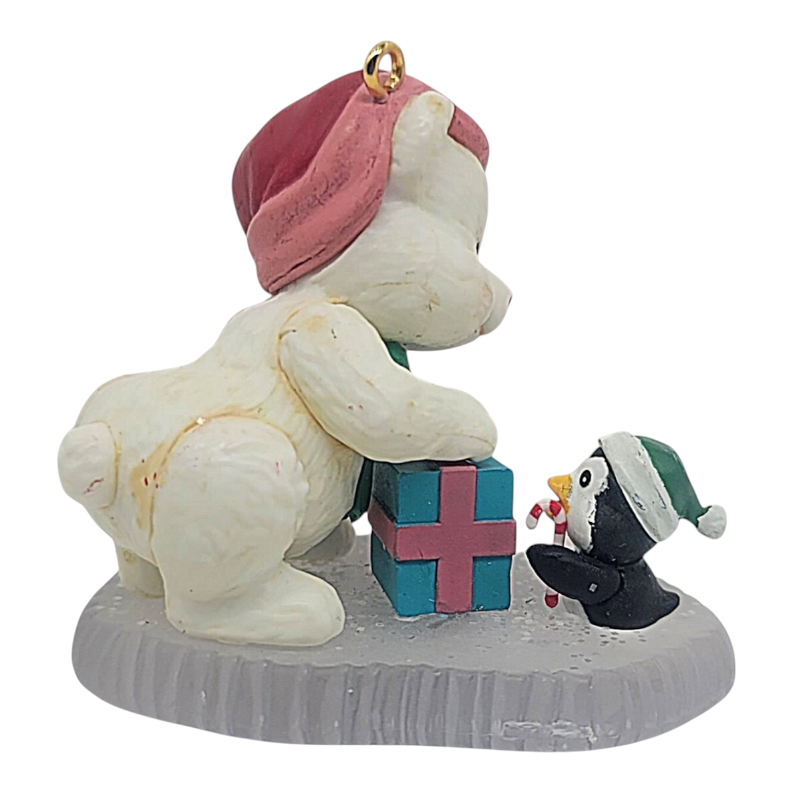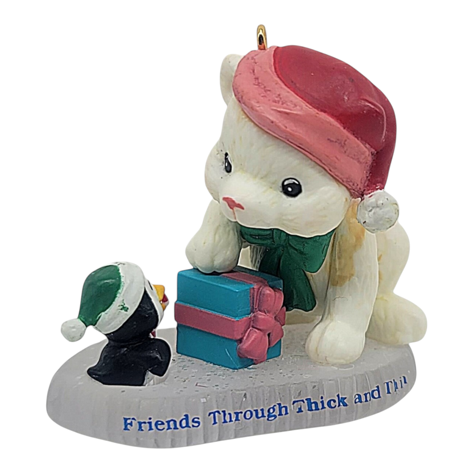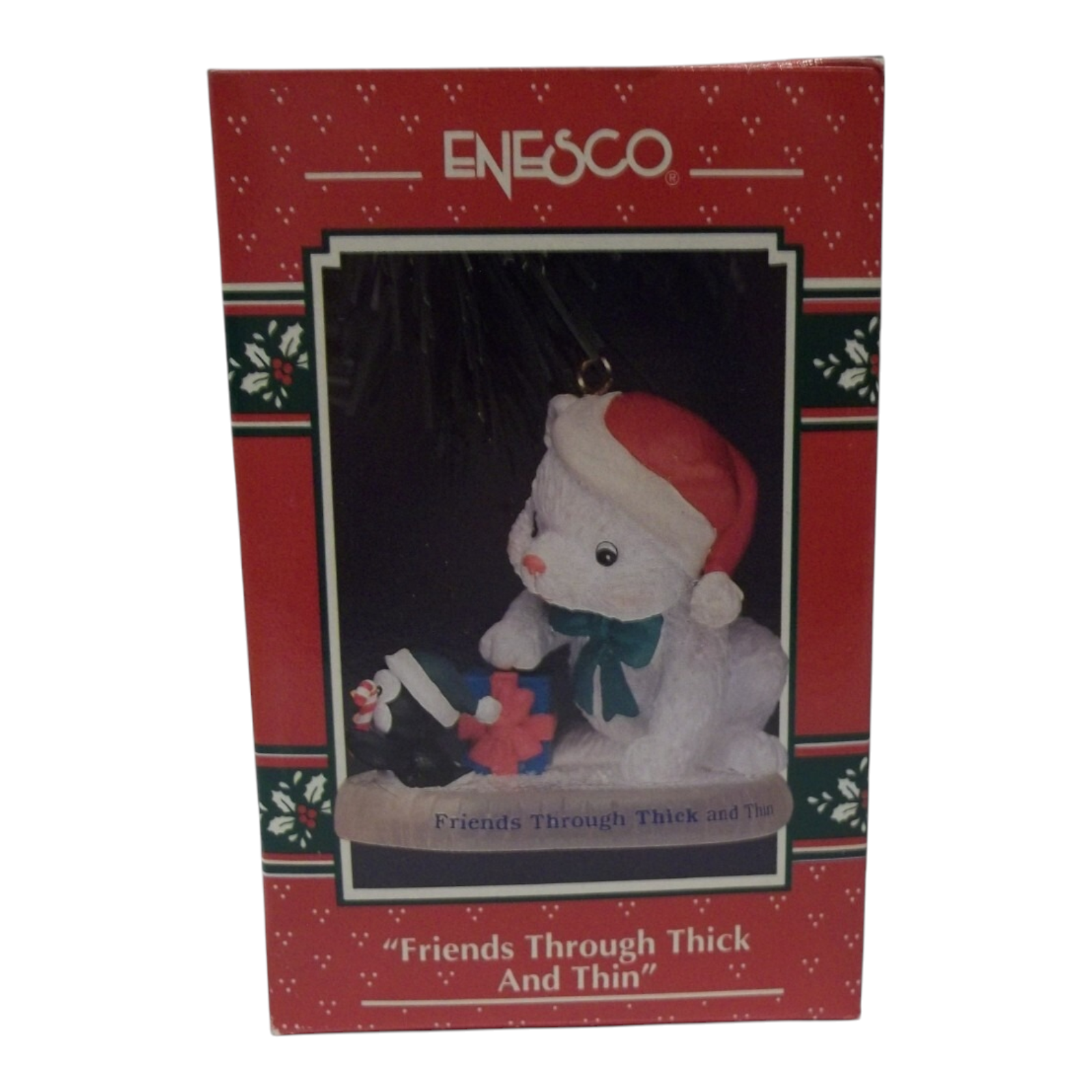 Celebrate the strength of true friendship with the 1993 Enesco “Friends Through Thick and Thin” ornament. This charming collectible features two polar bears bundled together in cozy scarves, joyfully sharing a moment in the snowy North. Hand-painted in soft whites, blues, and pastels, it beautifully captures Enesco’s warmth, craftsmanship, and storytelling charm. A heartfelt keepsake for friends or collectors of animal-themed ornaments, this piece symbolizes loyalty, laughter, and the comfort of togetherness — even in the chilliest season.