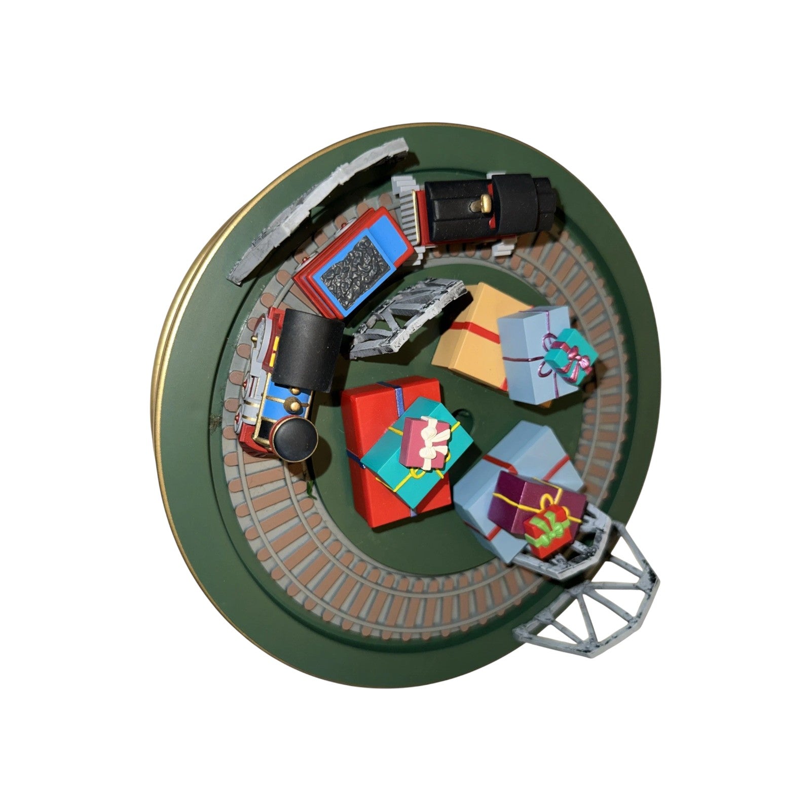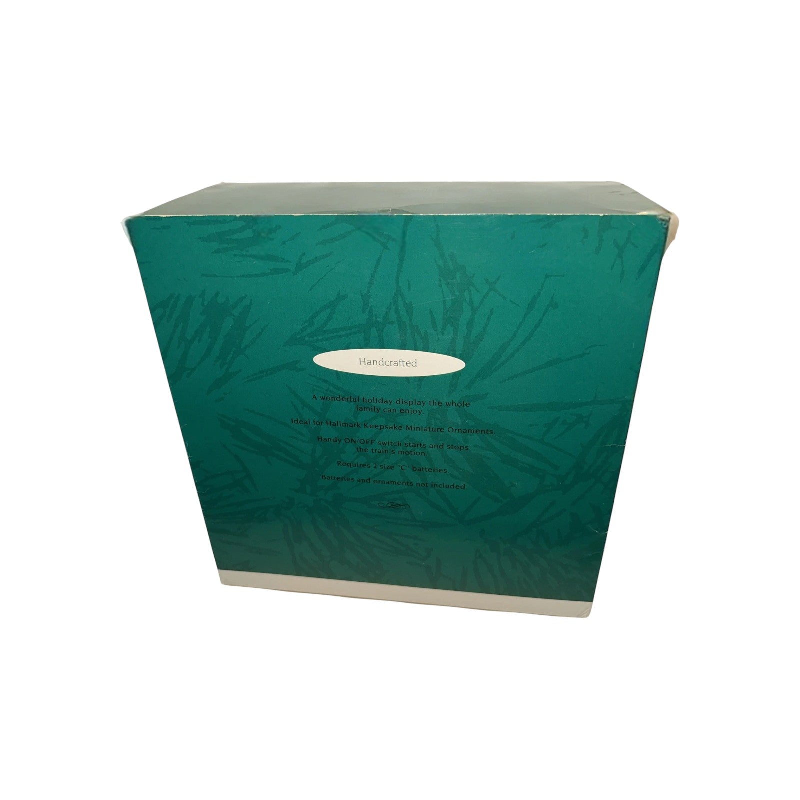 Bring nostalgic holiday charm into your home with the 1993 Holiday Express Miniature Tree Base, a delightful train-themed tabletop display by Hallmark in collaboration with Lionel. This motorized base features a miniature train that circles around a festive collection of wrapped gifts and two decorative bridges. Designed to hold a small tabletop tree, it arrives mint in its original box and includes the train mechanism. Requires` two C batteries (not included) to operate the revolving motion beneath your tree stand.