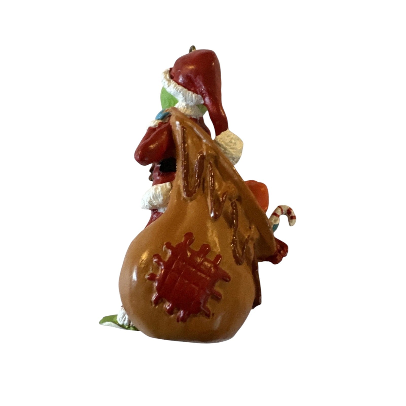 This licensed ornament from the 1993 collaboration between The Muppets and Carlton Cards features the beloved character Kermit the Frog dressed in a festive Santa outfit, carrying a jumbo toy sack and candy cane—bringing holiday cheer straight from the swamp to your tree. The molded plastic design is detailed with multi-color finish and character accuracy, making it a delightful piece for fans of The Muppets and vintage holiday collectibles alike. Its 1993 release date, combined with the recognizable branding and cheerful pose, adds strong collectible appeal for both pop-culture fans and ornament collectors.