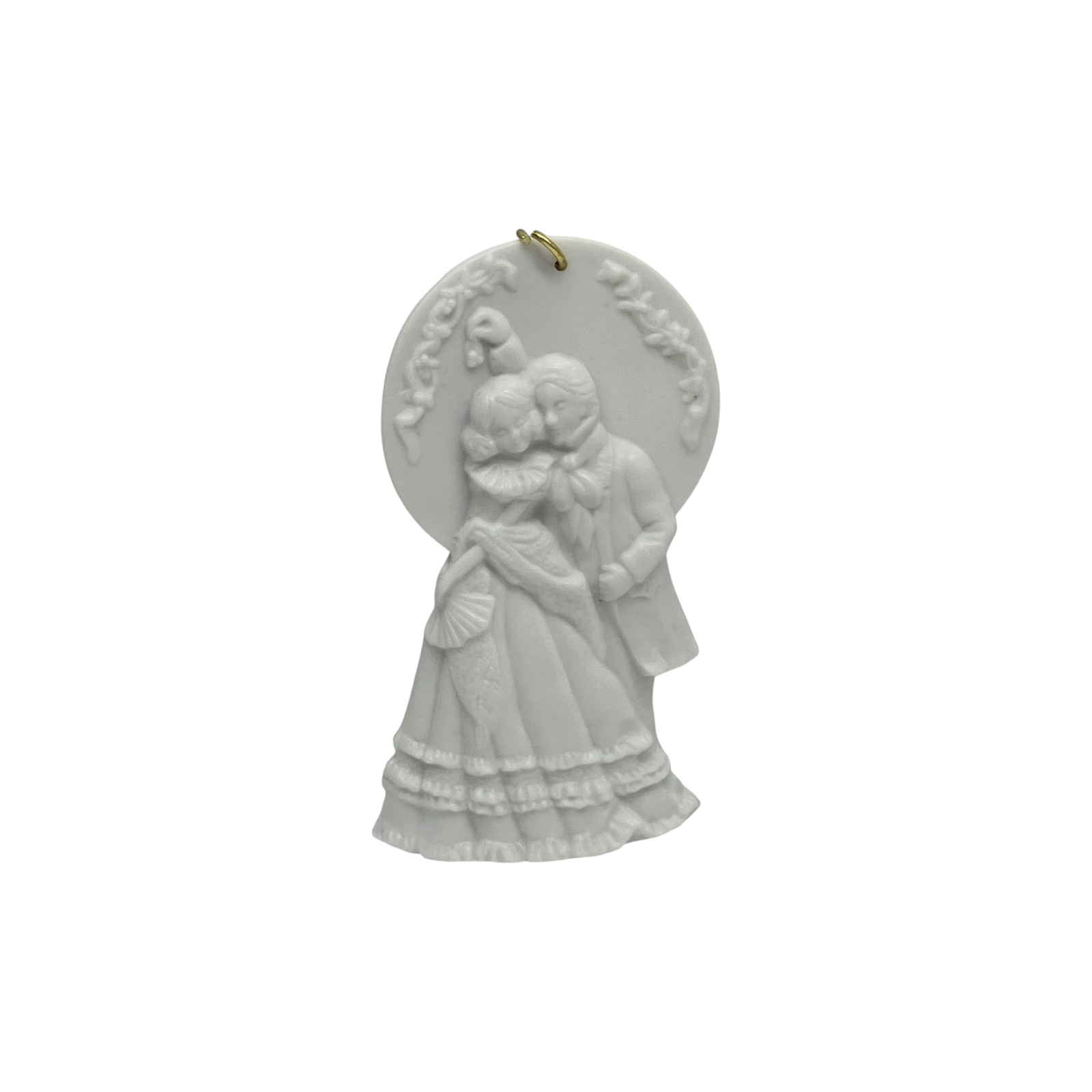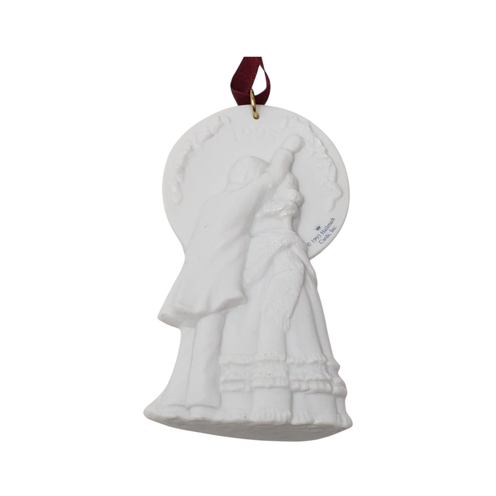 Step into a moment of timeless romance with the 1993 Mistletoe Kiss ornament from Hallmark’s exquisite Portraits in Bisque Collection. Sculpted from fine bisque porcelain by artist Sharon Pike, this delicate heirloom captures an affectionate embrace beneath mistletoe—rich in both sentiment and Victorian charm. Standing approximately 3.84″ tall, it features subtle sculptural detail and comes packaged in its original showcase box—ready for display without need for batteries or accessories