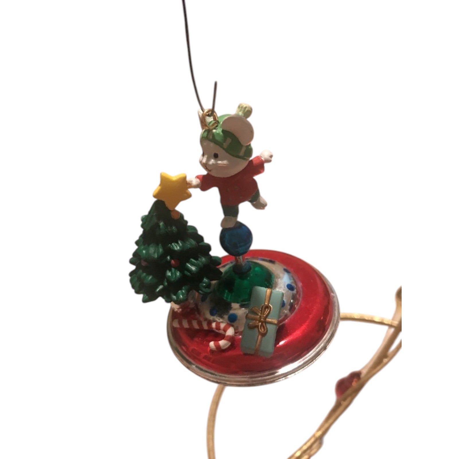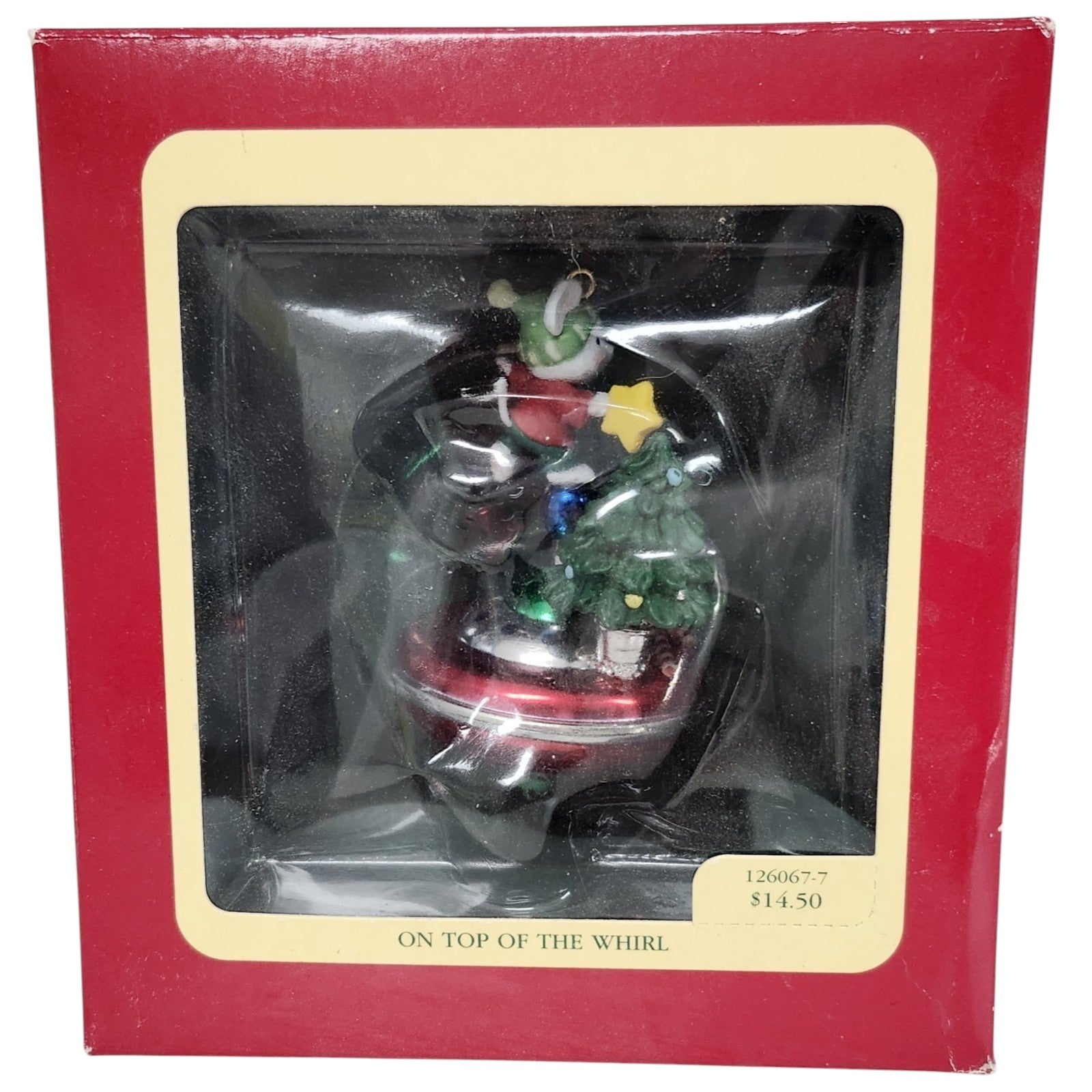 This 1993 “On Top of the Whirl (Mouse)” ornament captures a playful scene: a little mouse perched atop a spinning toy-top, surrounded by holiday treats including a tiny gift and a miniature Christmas tree. The piece is part of the Heirloom Collection and features hand-painted multicolored detail on molded plastic/resin, delivering both vintage charm and collector appeal. The whimsical design evokes childhood delight during the holiday season and adds a storybook feel to any tree or display. Ideal for collectors of animal-themed ornaments or Heirloom series pieces, this one stands out for its dynamic toy-top motif and festive accessories.