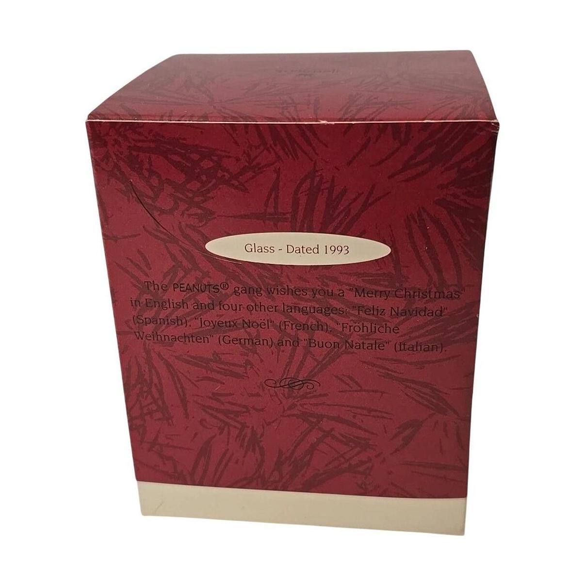 Bring classic Peanuts charm to your holiday décor with the 1993 Peanuts ornament—a vibrant silver glass ball featuring the entire Peanuts gang wishing “Merry Christmas” in multiple languages including English, French, Spanish, and German. Featuring Snoopy, Charlie Brown, Lucy, Linus, and more, this festive keepsake arrives mint-in-box, complete with its original ribbon hanger and packaging. Artist not noted by Hallmark. No batteries or cords needed—just hang and enjoy the cheerful multilingual greeting wrapped in nostalgic style.