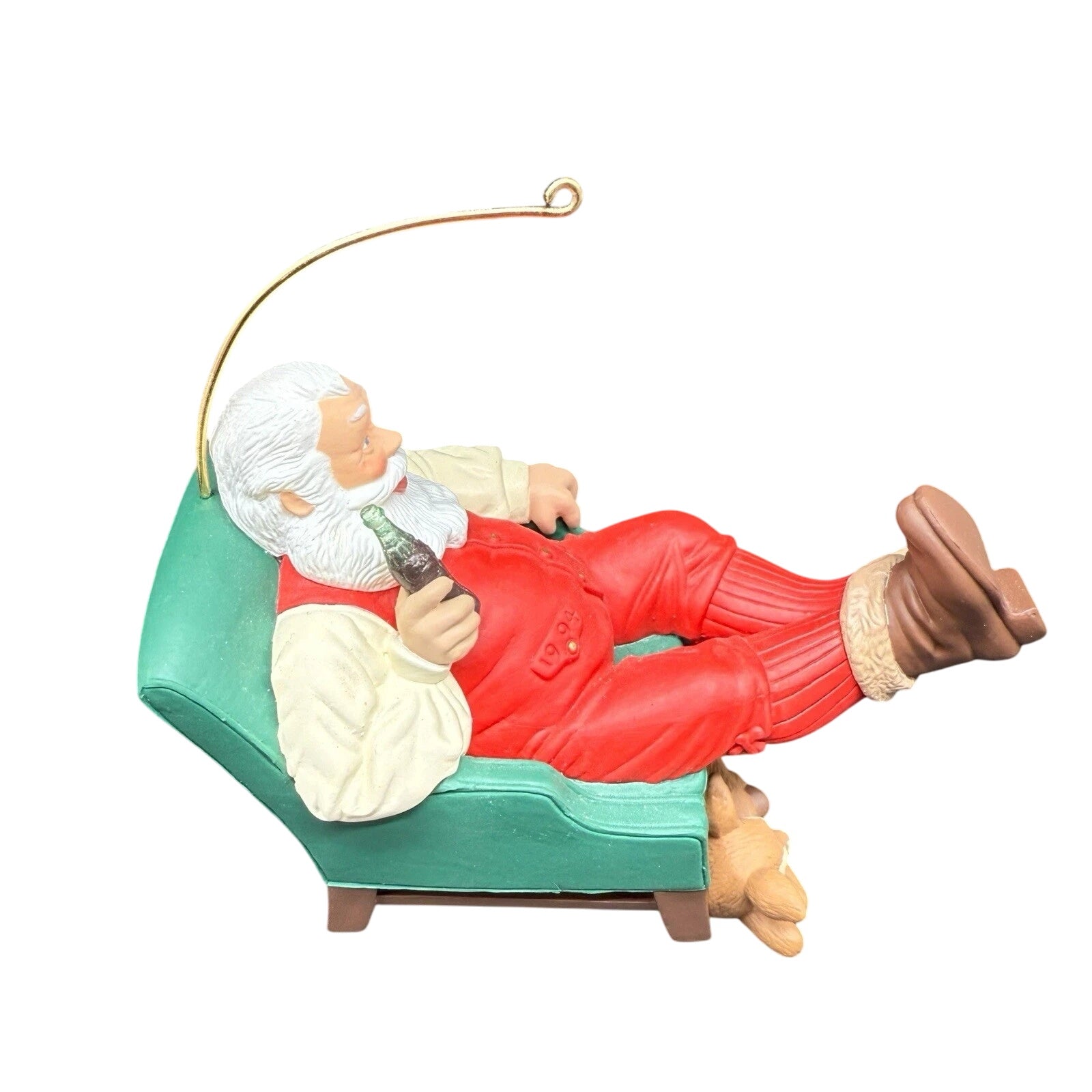 Kick back with this relaxing 1993 Relaxing Moment ornament—featuring Santa Claus reclining in a green armchair with a bottle of Coca‑Cola in hand, while a sweet baby deer rests at his feet. Crafted in vibrant painted resin and mixed materials, this whimsical keepsake by John “Collin” Francis brings cozy nostalgia to your holiday tree. It arrives mint in box with its original ribbon hanger. Just hang and enjoy—no batteries or cords required.