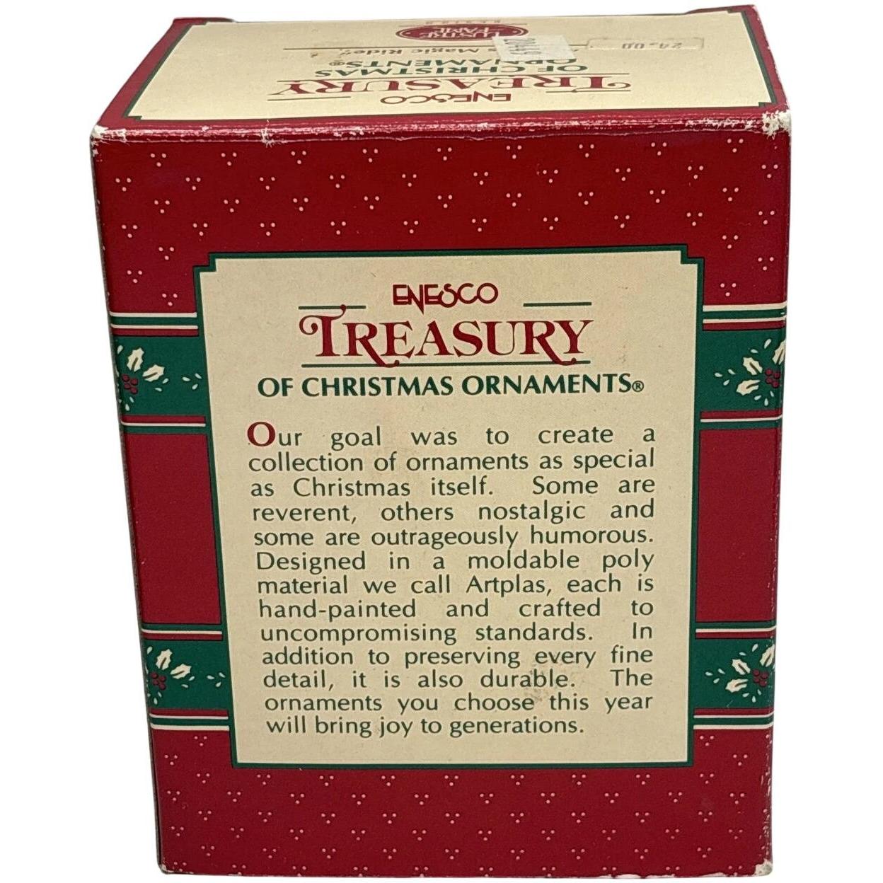 Take a trip through holiday wonder with the 1993 Enesco “Santa’s Magic Ride” ornament, item 582115. This enchanting collectible features Santa Claus soaring through the night sky in his sleigh, surrounded by gifts and festive sparkle. Hand-painted with rich reds, golds, and wintery accents, it showcases Enesco’s detailed 1990s craftsmanship and timeless Christmas spirit. Perfect for Enesco fans, Santa collectors, or lovers of nostalgic décor, this ornament captures the magic of Santa’s Christmas Eve journey and brings joy to any tree or holiday display.