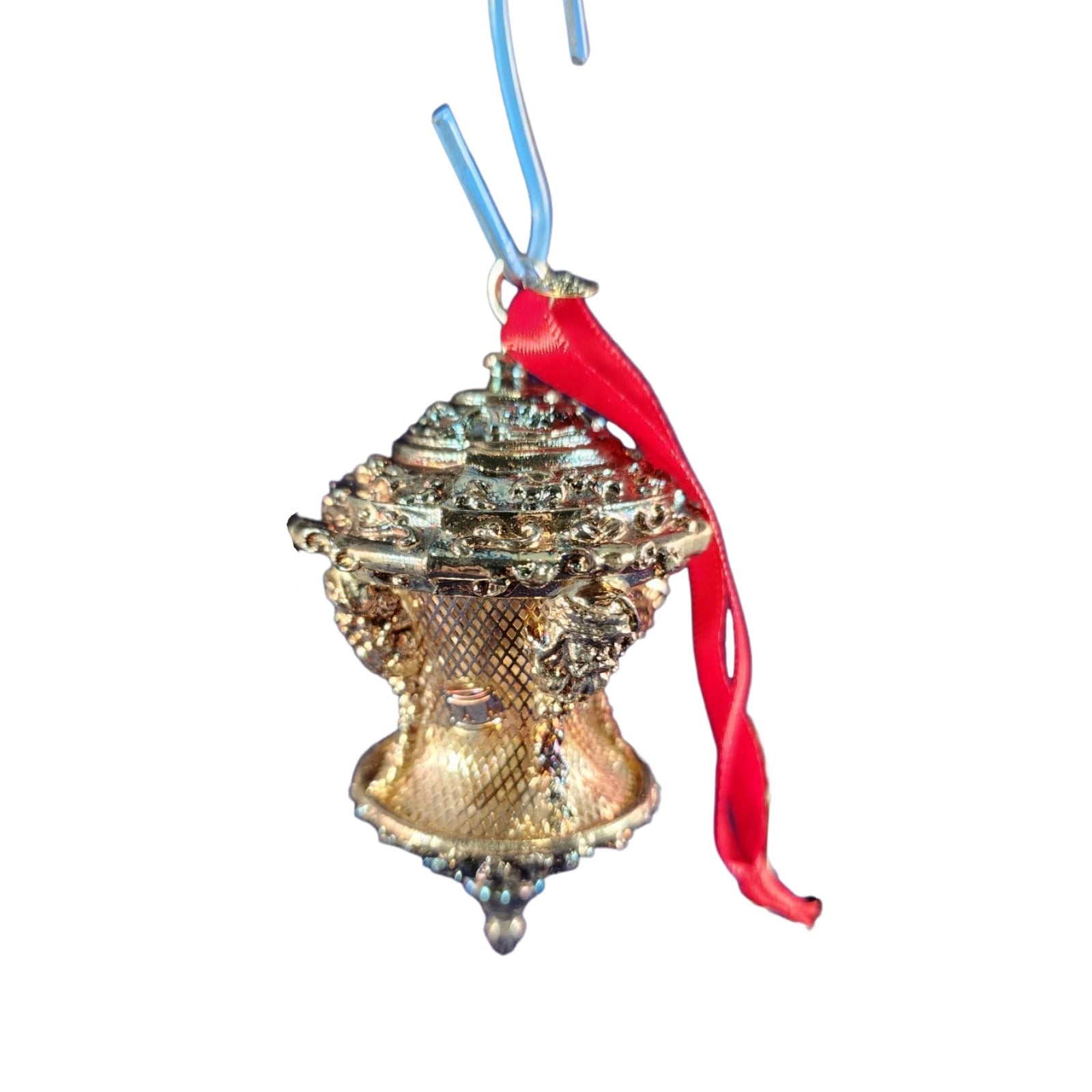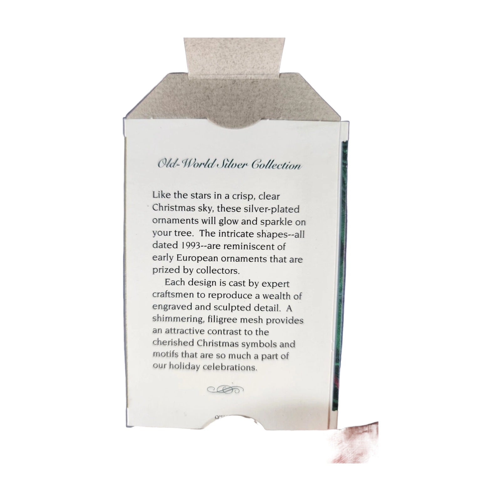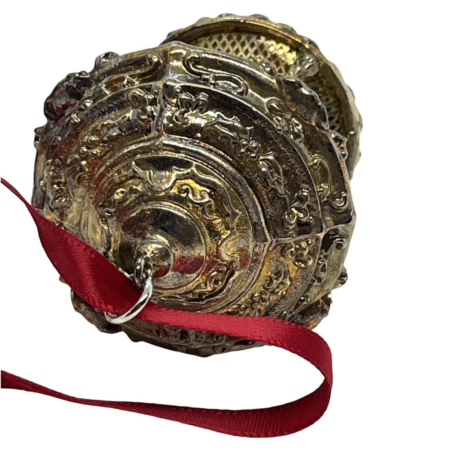 Elevate your holiday décor with this refined 1993 Silver Santa bell ornament from Hallmark’s prestigious Old World Silver Collection. Fashioned with delicate filigree mesh and silver plating, this miniature bell features Santa in detailed silhouette form and hangs elegantly by a rich red ribbon. Its craftsmanship echoes youthful European bells, capturing timeless elegance in a holiday keepsake. The original box is included, and no power or accessories are needed.