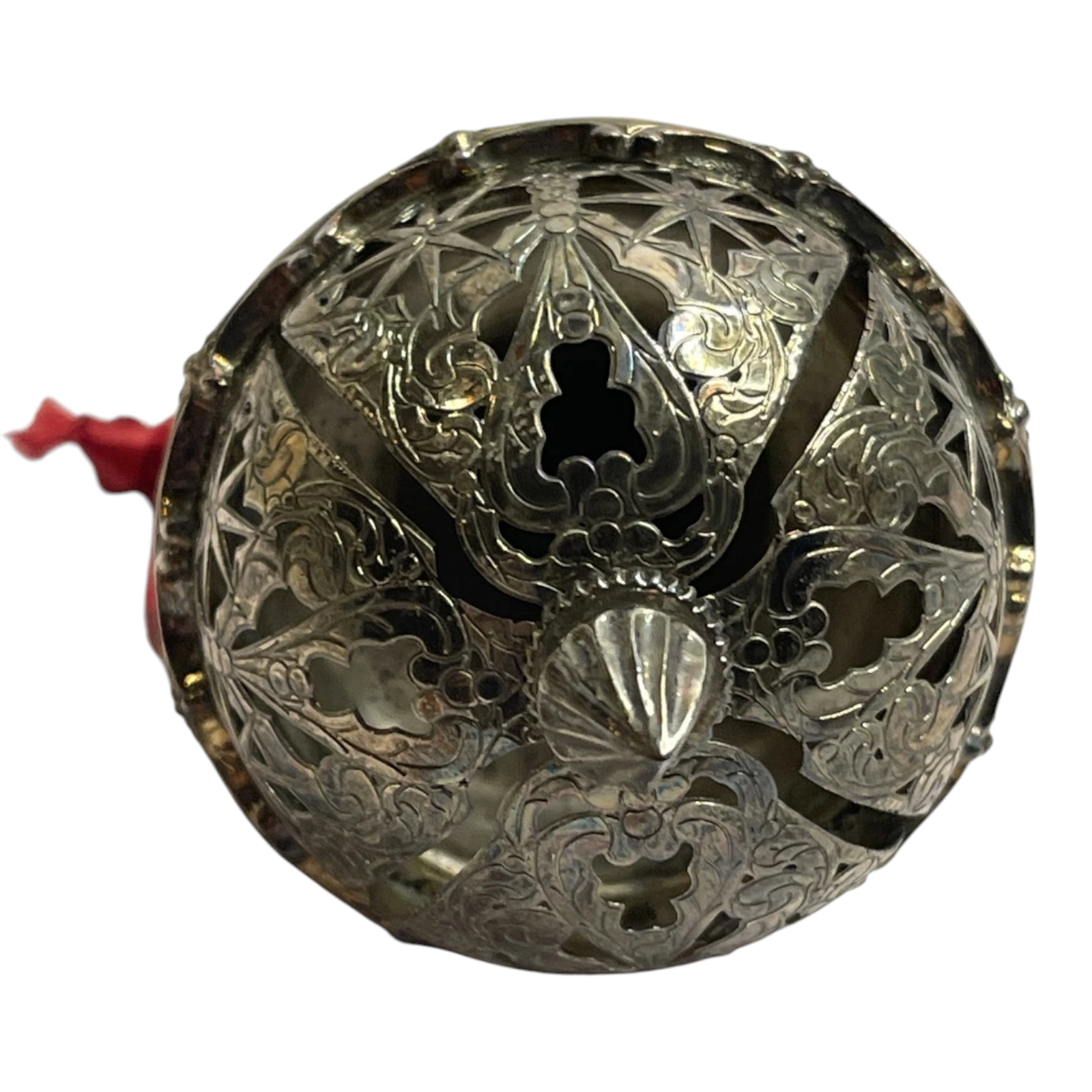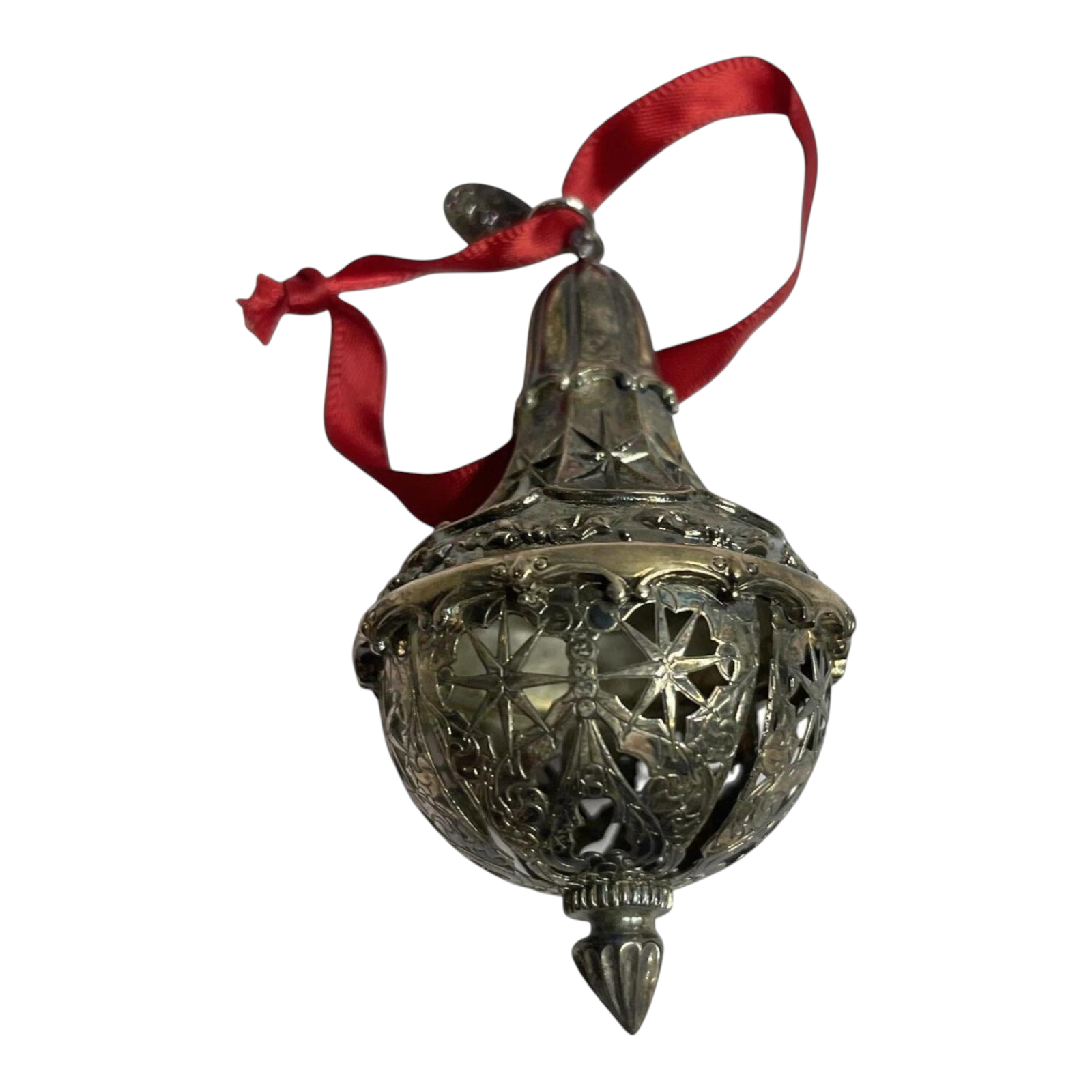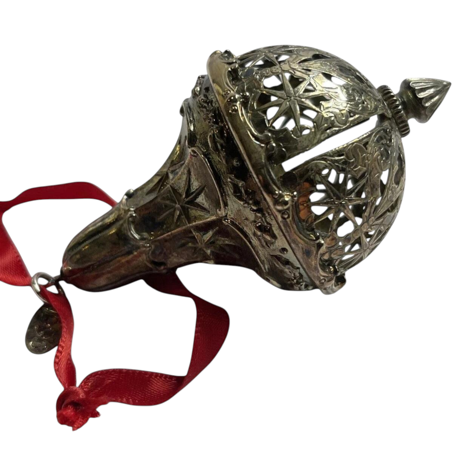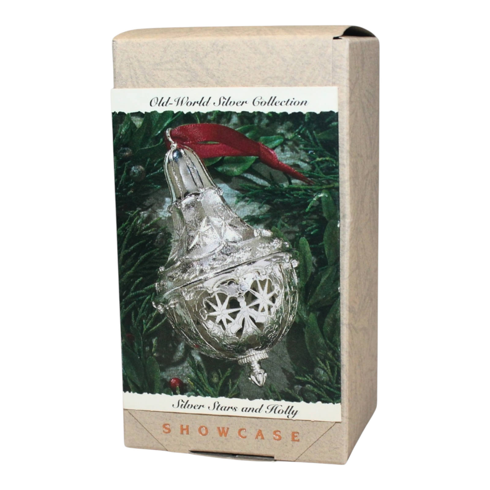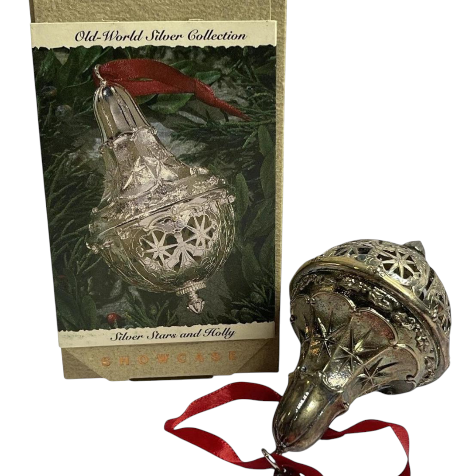 Adorn your tree with timeless elegance using the 1993 Silver Stars and Holly bell ornament from Hallmark's Old-World Silver collection. This exquisite piece features a bell-shaped metal form, intricately engraved with delicate stars and sprigs of holly—offering both refined design and nostalgic charm. Crafted in rich metallic tones, with a graceful loop for hanging, it's a keepsake that elevates any festive décor. The ornament comes with its original box and is ready to display—no power or accessories required.