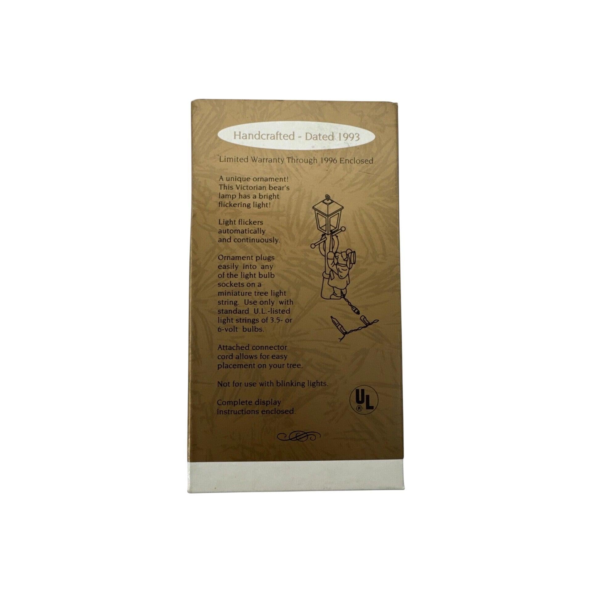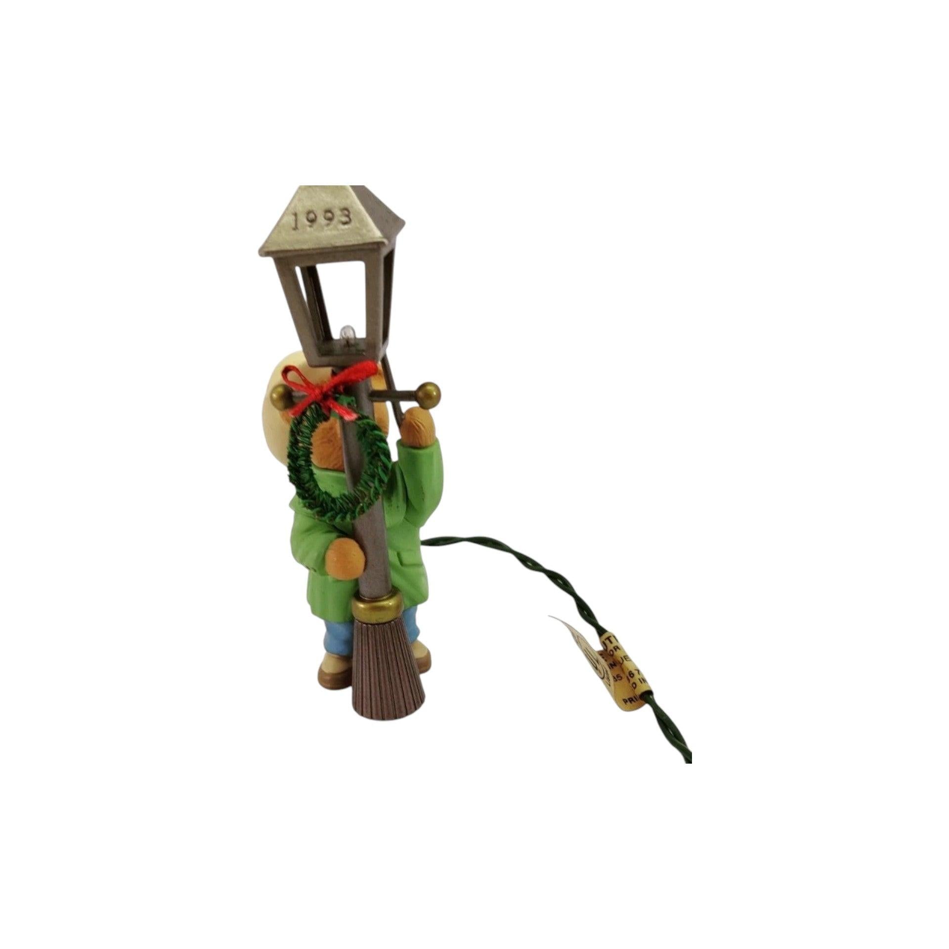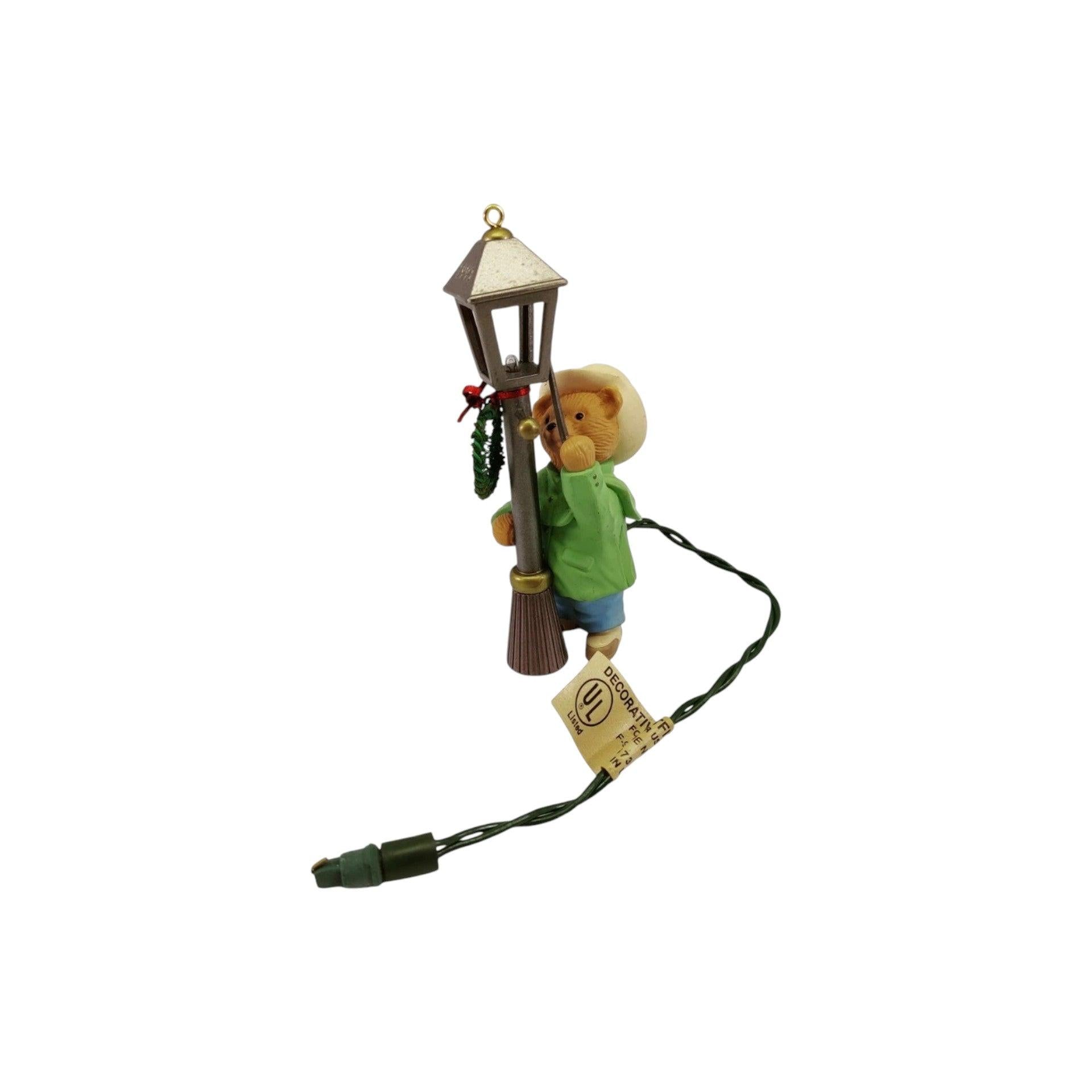 Light up your holidays with the charming 1993 The Lamplighter Keepsake ornament featuring an adorable teddy bear dressed in a green coat and top hat, lighting an old-fashioned streetlamp decorated with a festive wreath. This Magic ornament flickers when plugged into a miniature incandescent light string (do not use blinking lights). Included are the original keepsake box and hanging hook/tag. No batteries or power adapter needed—just plug into a light string to enjoy the warm glow.