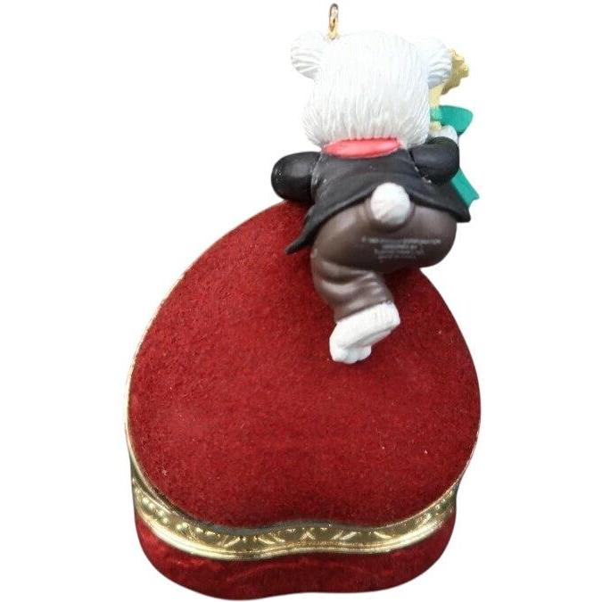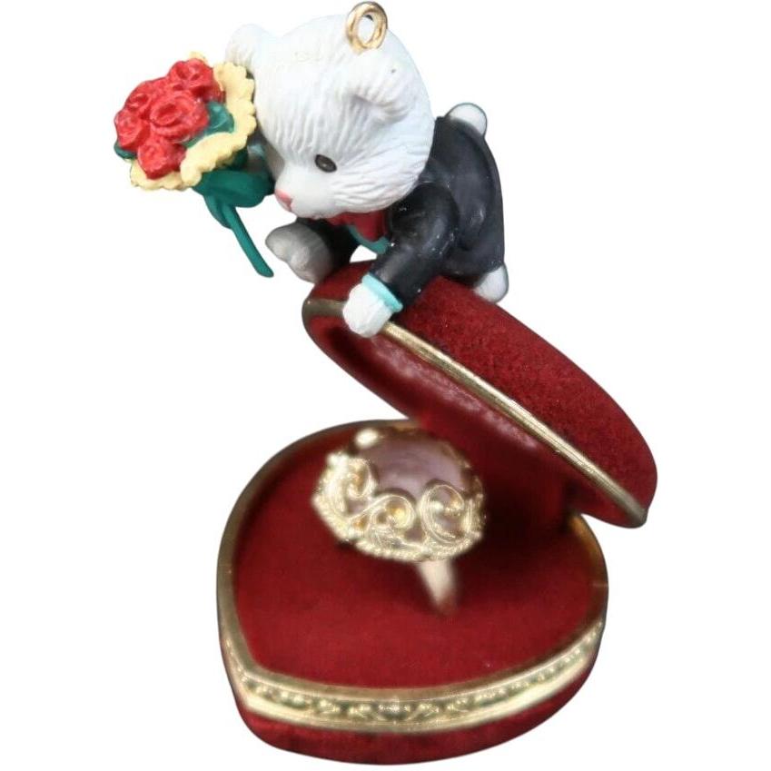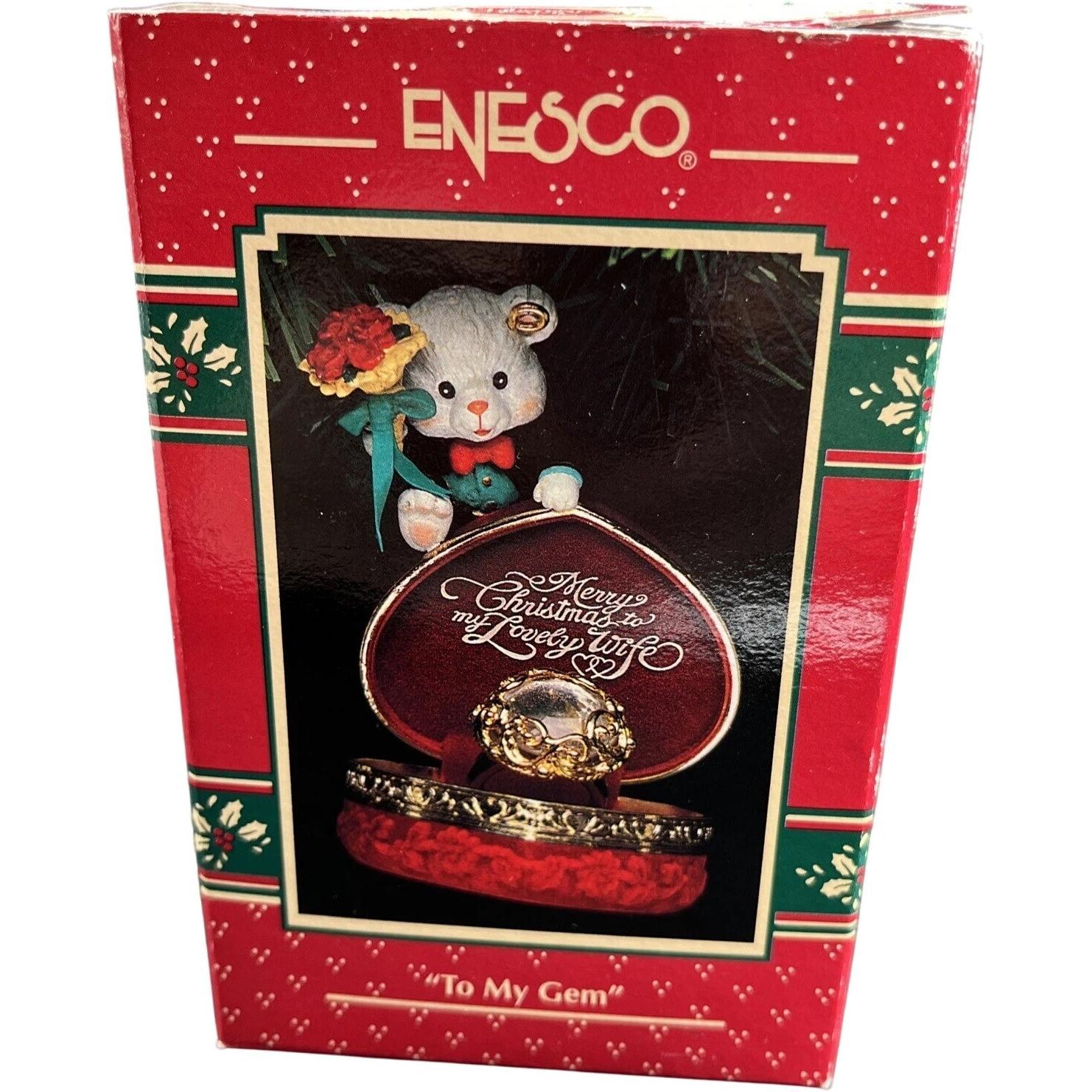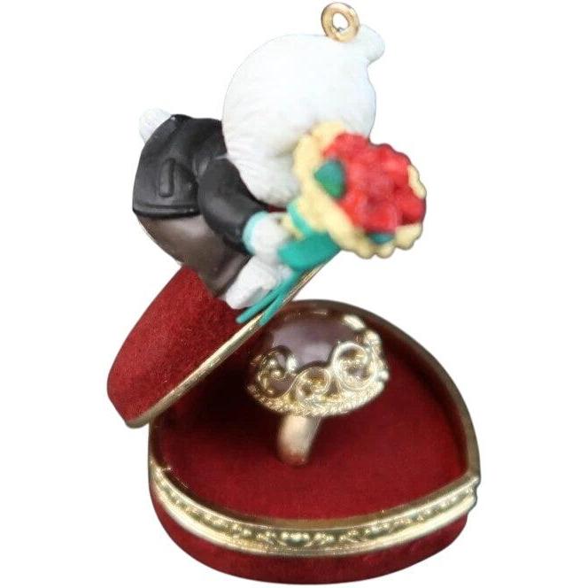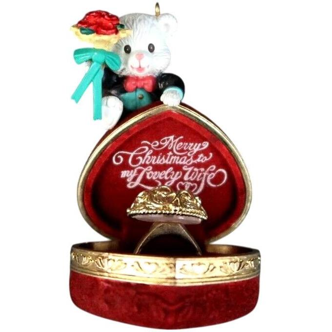 This romantic 1993 Enesco ornament captures a tender holiday moment: a heart-shaped ring-box design opens to reveal a teddy bear holding a bouquet of flowers and a faux ring — inscribed with “Merry Christmas to My Lovely Wife”. The design features textured sculpting, rich red and gold tones, and soft holiday styling that conveys both affection and festive cheer. Crafted with attention to detail and collectible quality, it’s an ideal keepsake for couples, anniversaries, and holiday décor collectors alike.