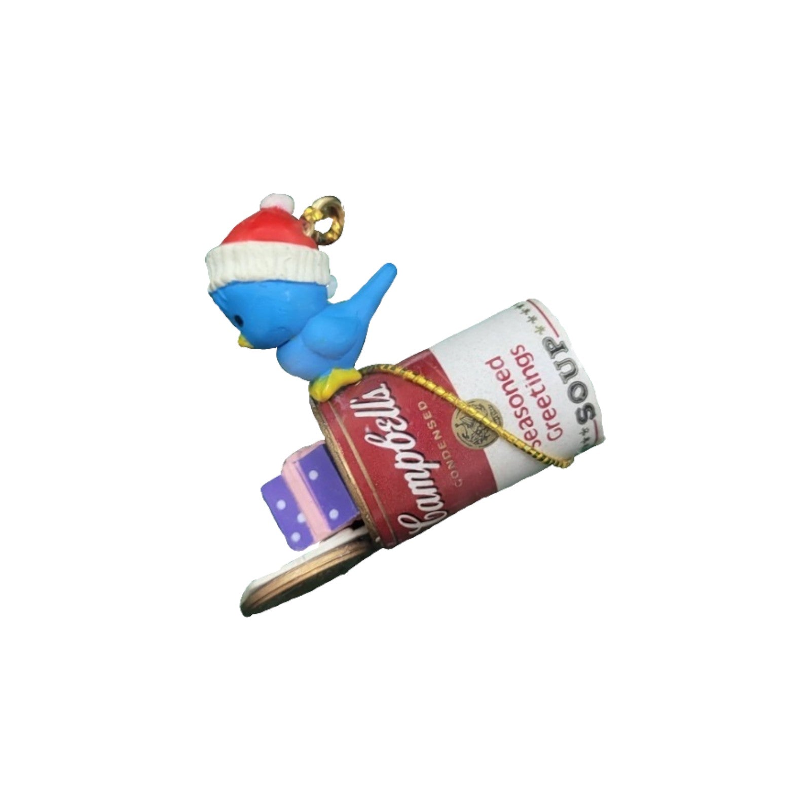 This playful 1994 ornament celebrates the iconic Campbell’s soup brand with a whimsical “small wonders” design from Enesco — featuring a miniature Campbell’s soup can (or related motif) being joyfully delivered or presented in holiday style. The compact size and bright, hand-painted finish make it a charming addition to any tree or themed collection. Perfect for both fans of branded holiday décor and collectors of novelty ornaments, the piece captures festive fun and brand nostalgia in one.