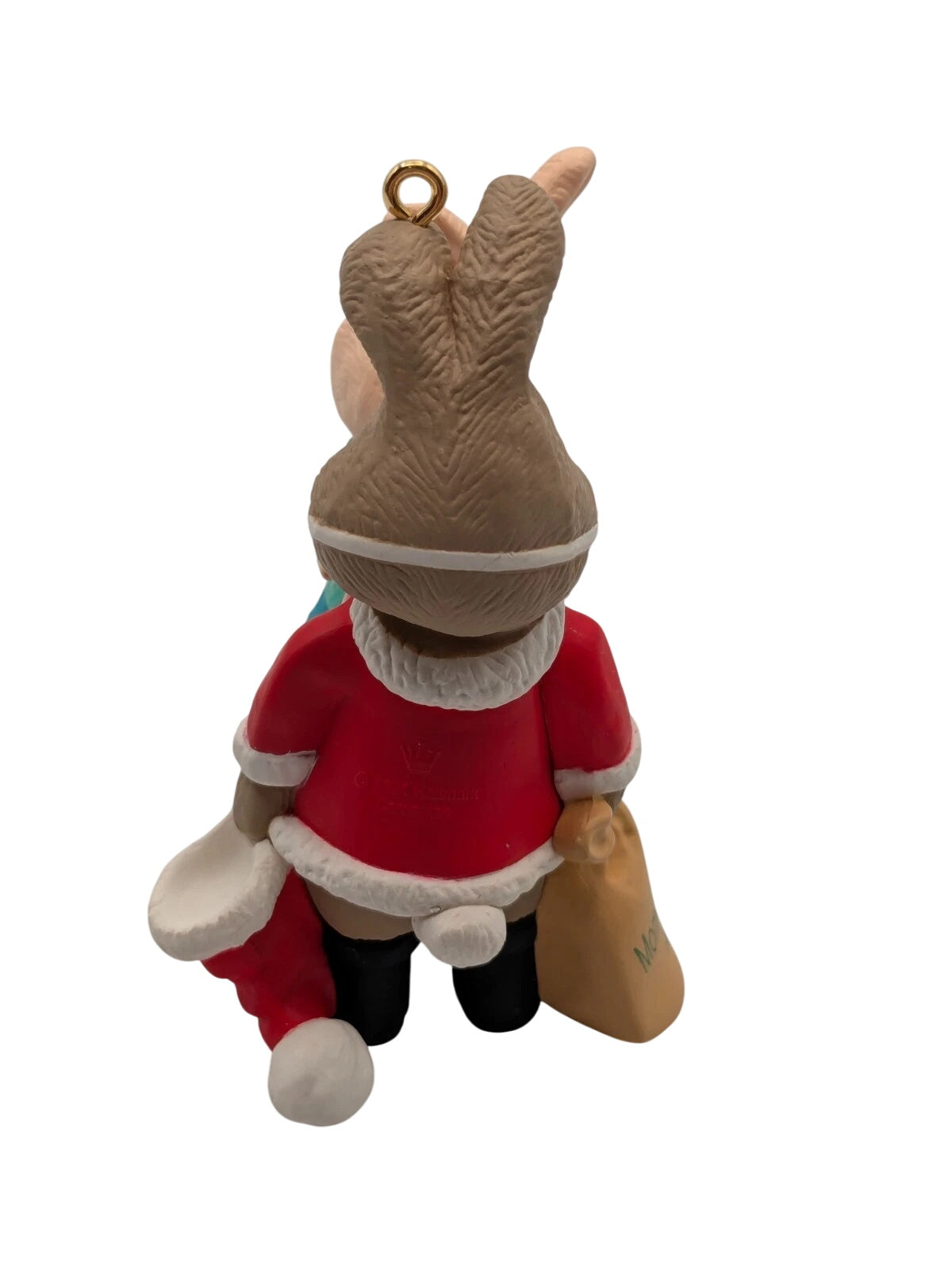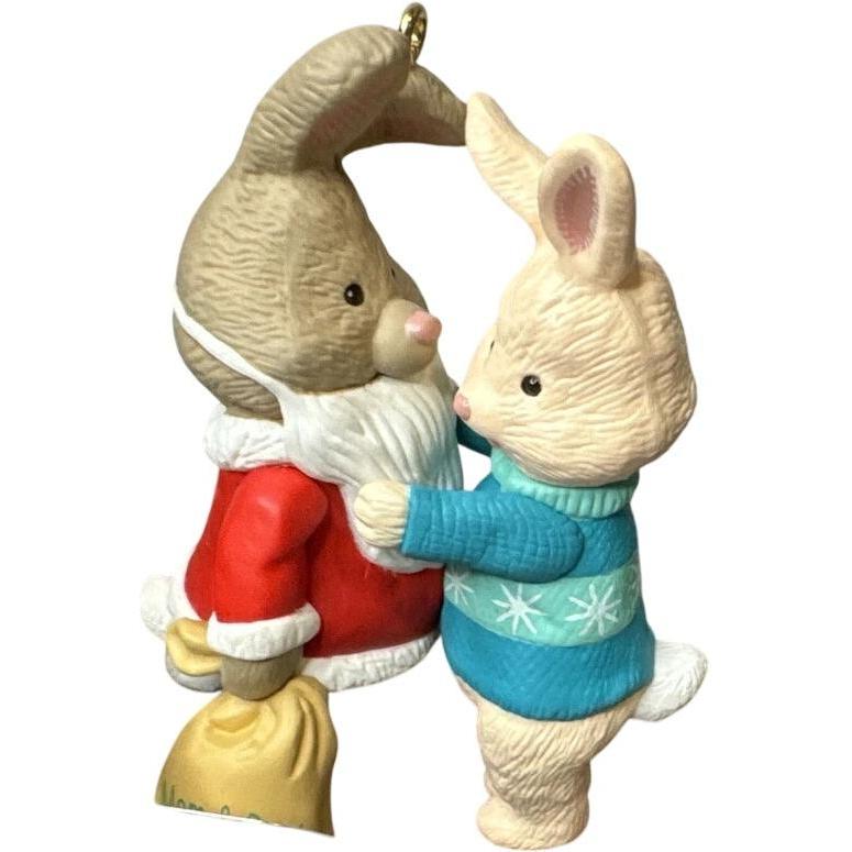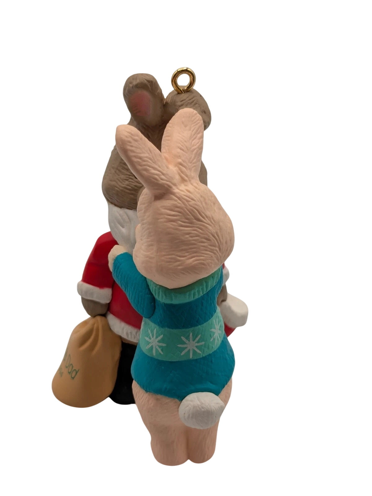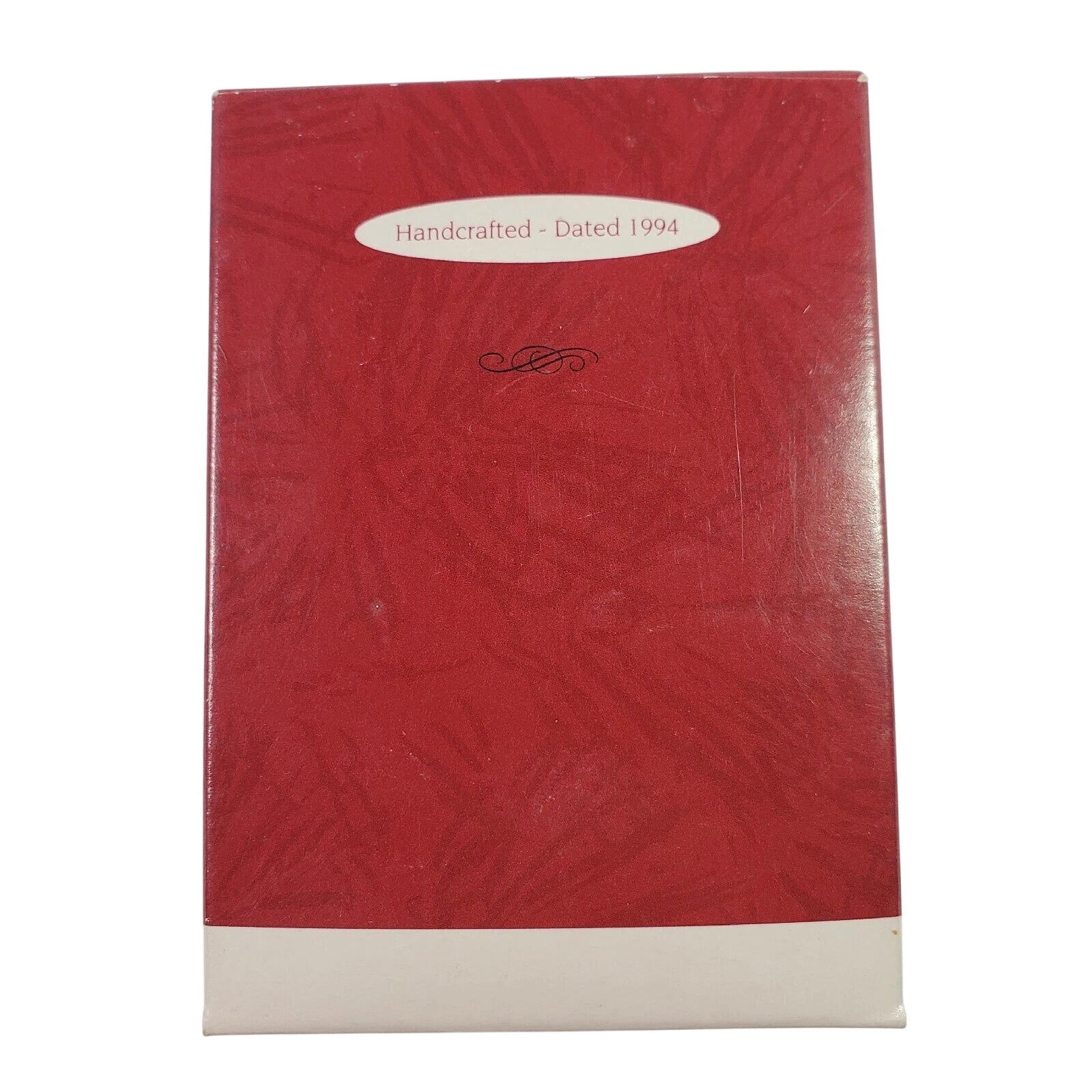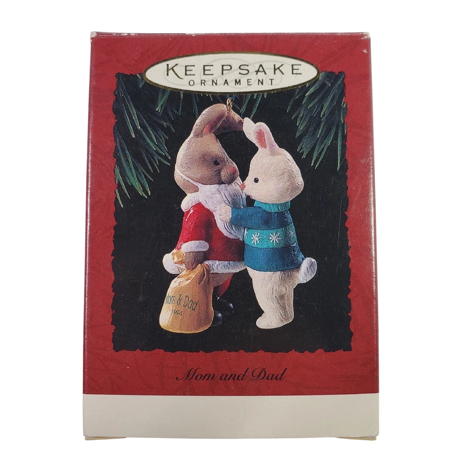 This heartwarming 1994 Enesco ornament features two adorable bears — a “Mom” and “Dad” figure — perched atop a frosted gingerbread-heart cookie inscribed “Merry Christmas Mom and Dad.” The rich sculpting and hand-painted finish capture charming details like holly accents, festive attire, and a lovingly crafted scene of togetherness. Crafted from durable ArtPlas (a mouldable resin-type medium) under Enesco’s “Treasury of Christmas” line, it blends sentimental family-theme appeal with collectible craftsmanship. A perfect tree-hanging keepsake for parents, grandparents or anyone looking to celebrate family togetherness during the holidays.