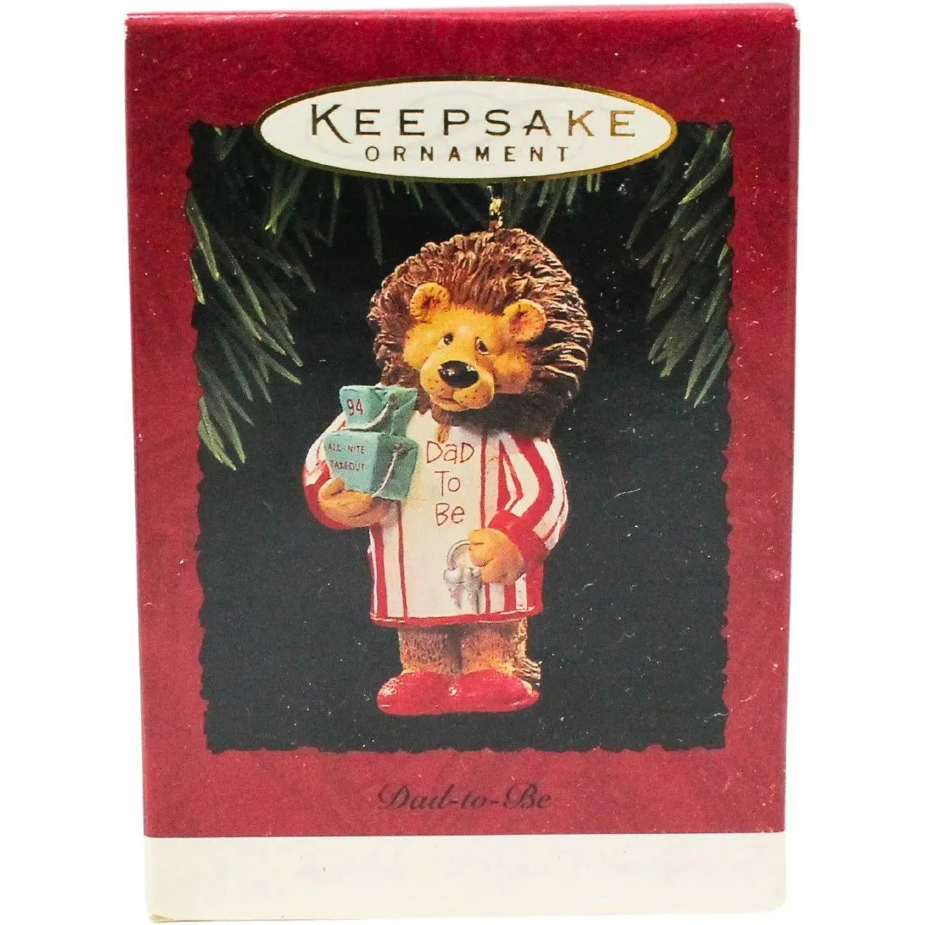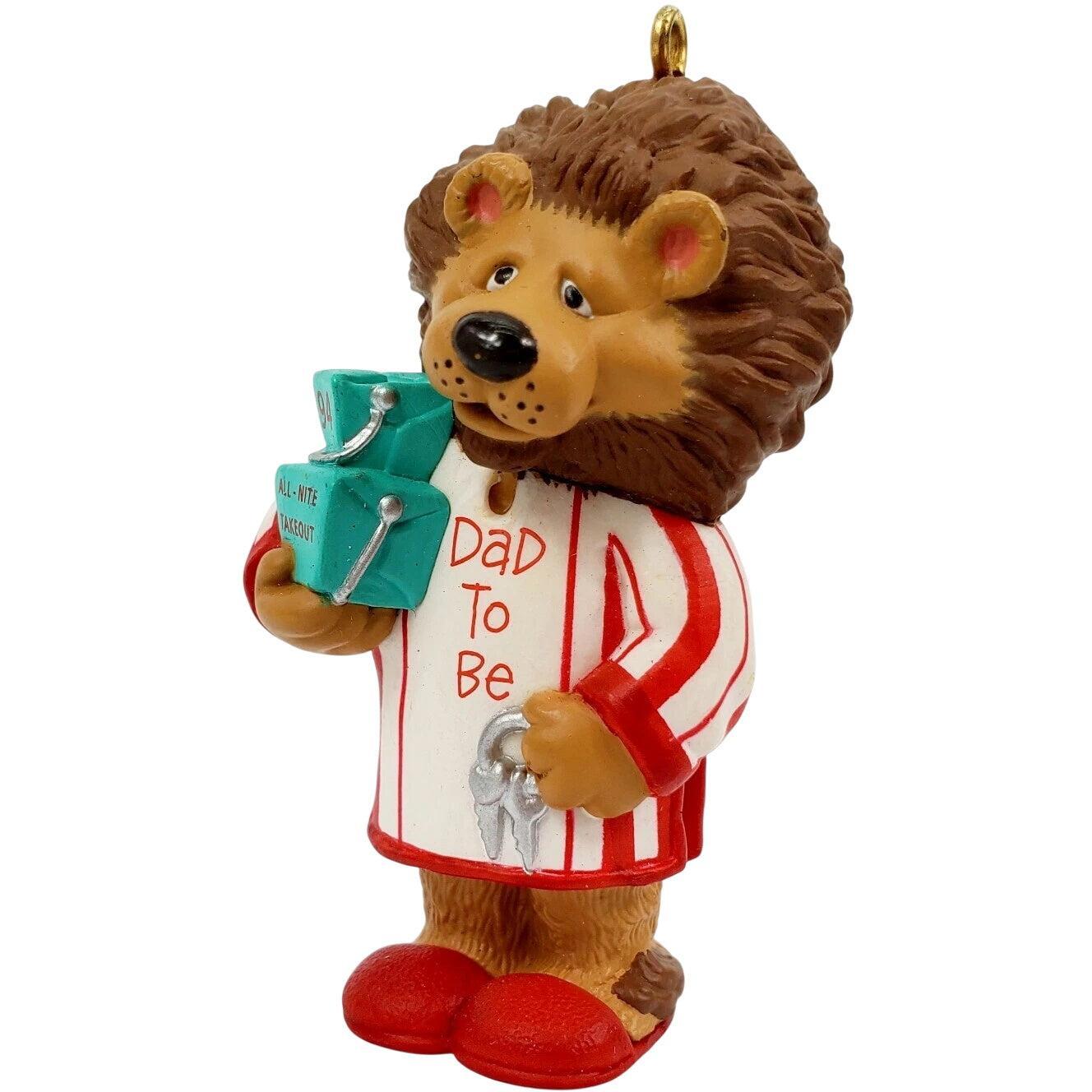 This collectible ornament features a humorous lion character in red-and-white striped pajamas marked “Dad-to-Be,” clutching a take-out container and a key ring in anticipation of his next chapter as a father. Designed by Sharon Pike and released in 1994, it blends playful imagery with the milestone theme of expecting fatherhood — a fun gift for a new dad and a suitable piece for an ornament collection focused on family milestones or animal motifs.