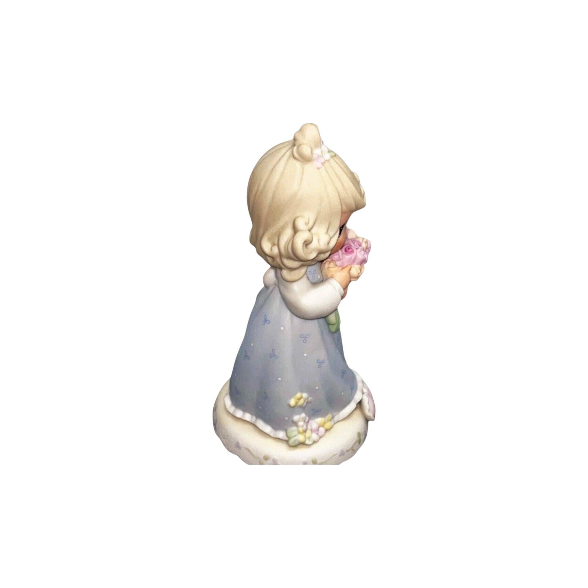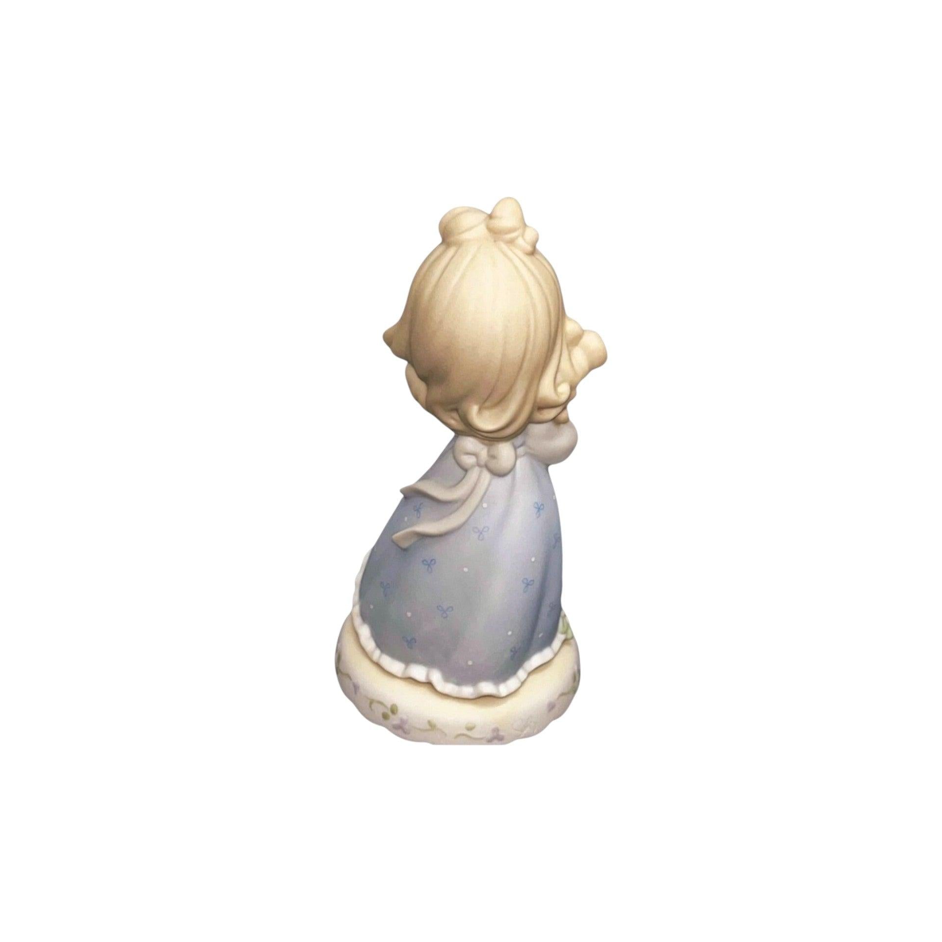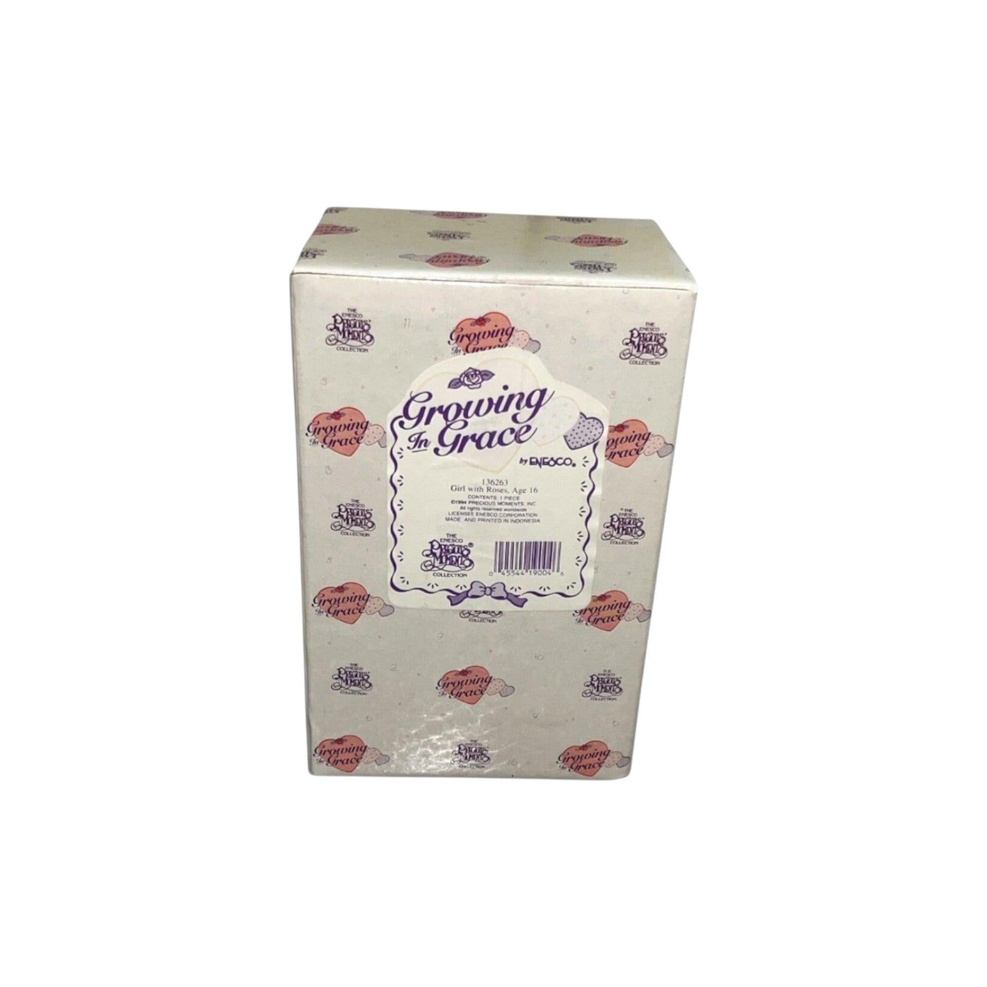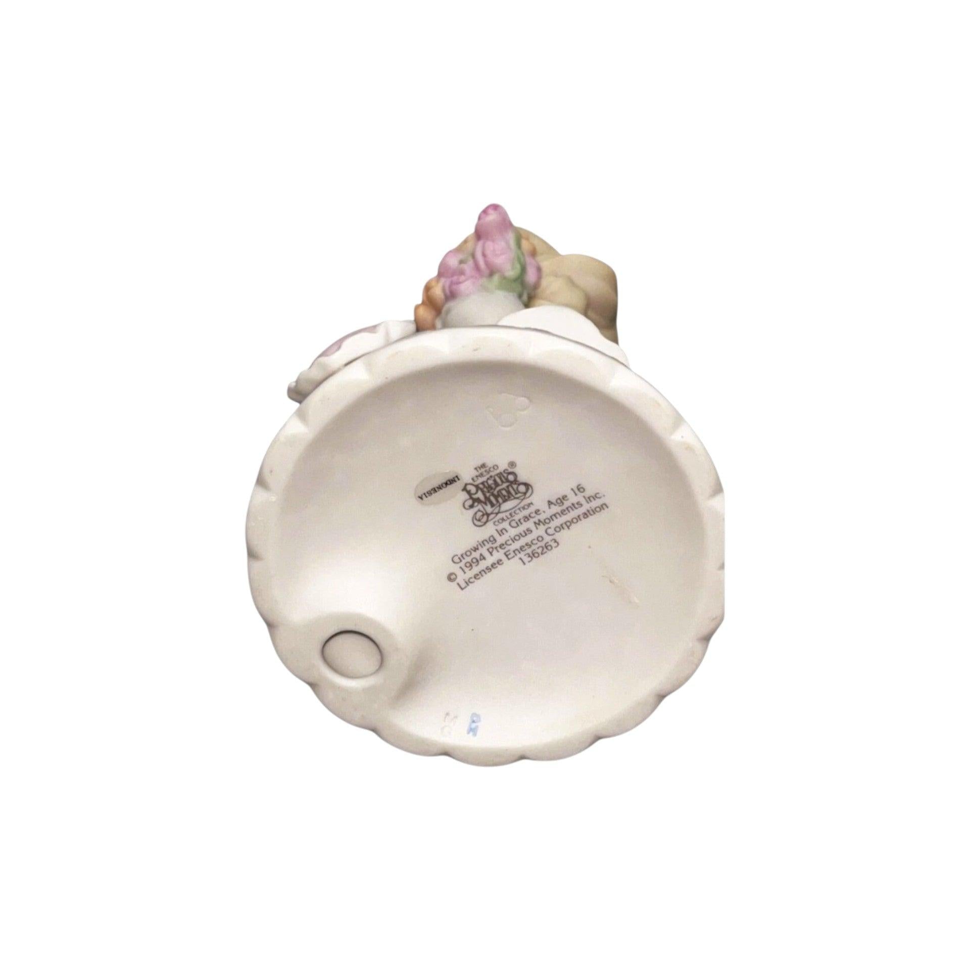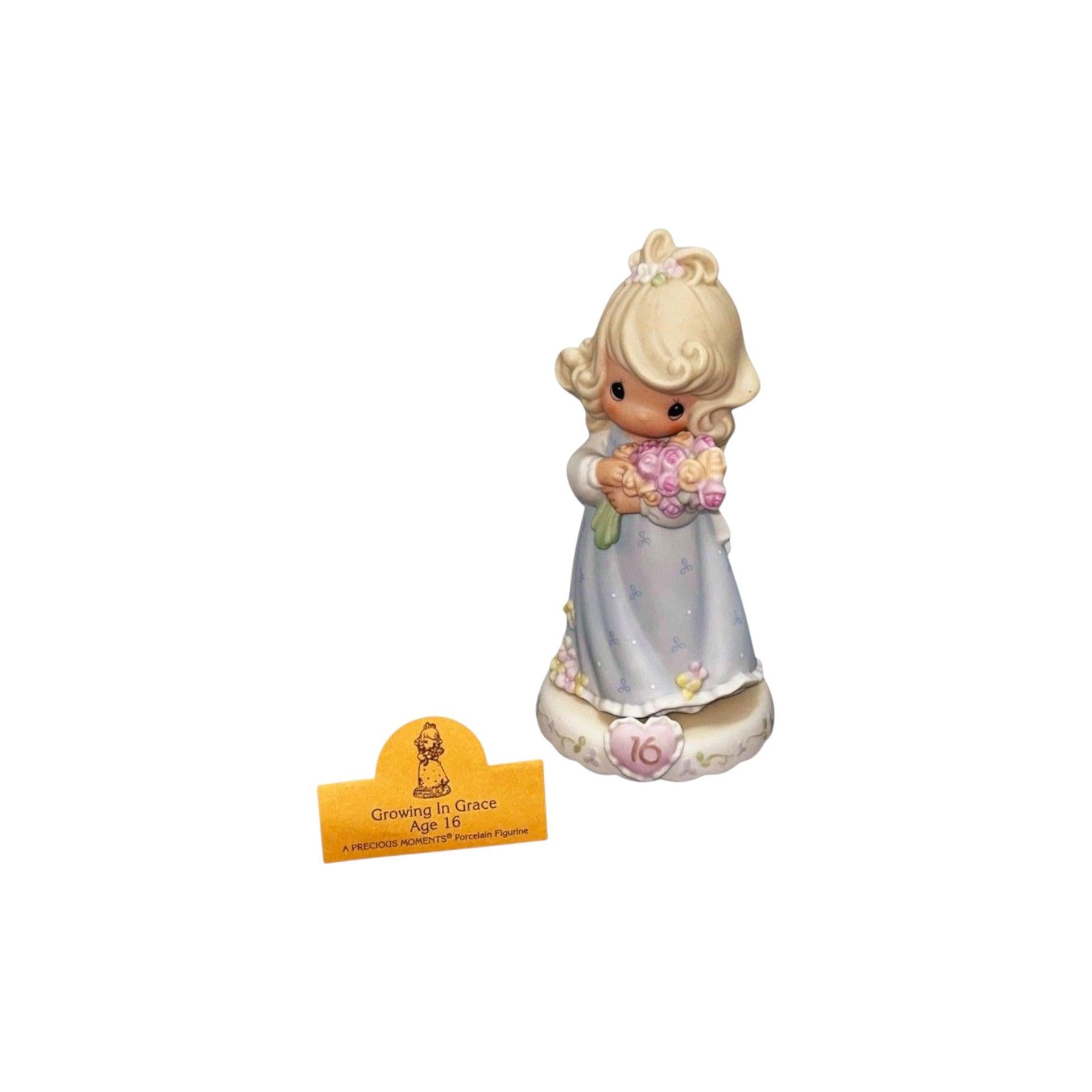 This charming Precious Moments porcelain figurine from Enesco’s Growing in Grace series celebrates a sweet sixteen milestone with a blonde-haired girl holding a bouquet of roses beside a heart-shaped base marked “16.” The hand-painted pastel design and tender expression capture the innocence and grace of youth, making it a lovely keepsake for birthdays or décor in teen-focused collections. The classic bisque porcelain and soft detail reflect the cherished Precious Moments style of the 1990s.