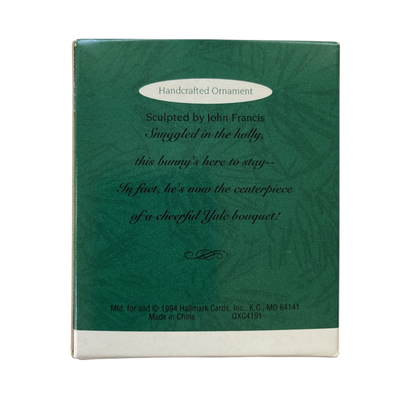 This miniature ornament features a charming bunny motif — the figure of a rabbit set inside what appears to be a bottle-cap-style medallion, creating a whimsical, vintage holiday feel. It was released in 1994 as a “miniature” Keepsake ornament under the SKU QXC4191. The piece appeals to collectors of minis, animal-theme decorations, and nostalgic Hallmark items. According to Hallmark’s listing: “Bottle Cap” size, artist John (Collin) Francis, approx 1″ H.