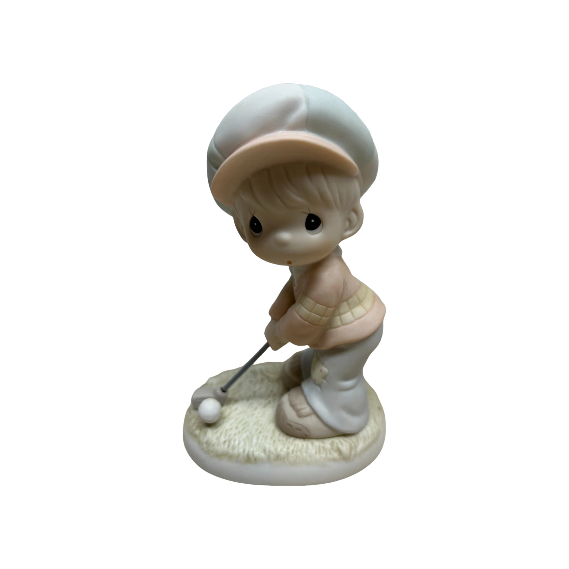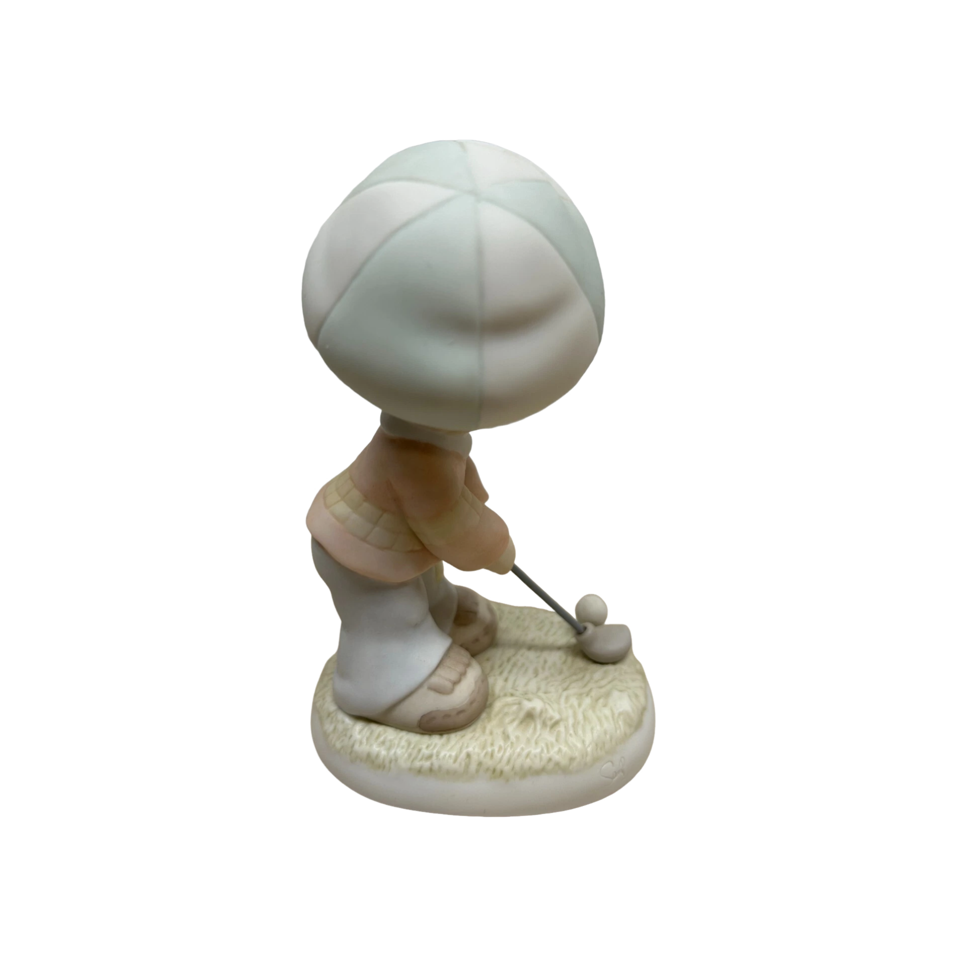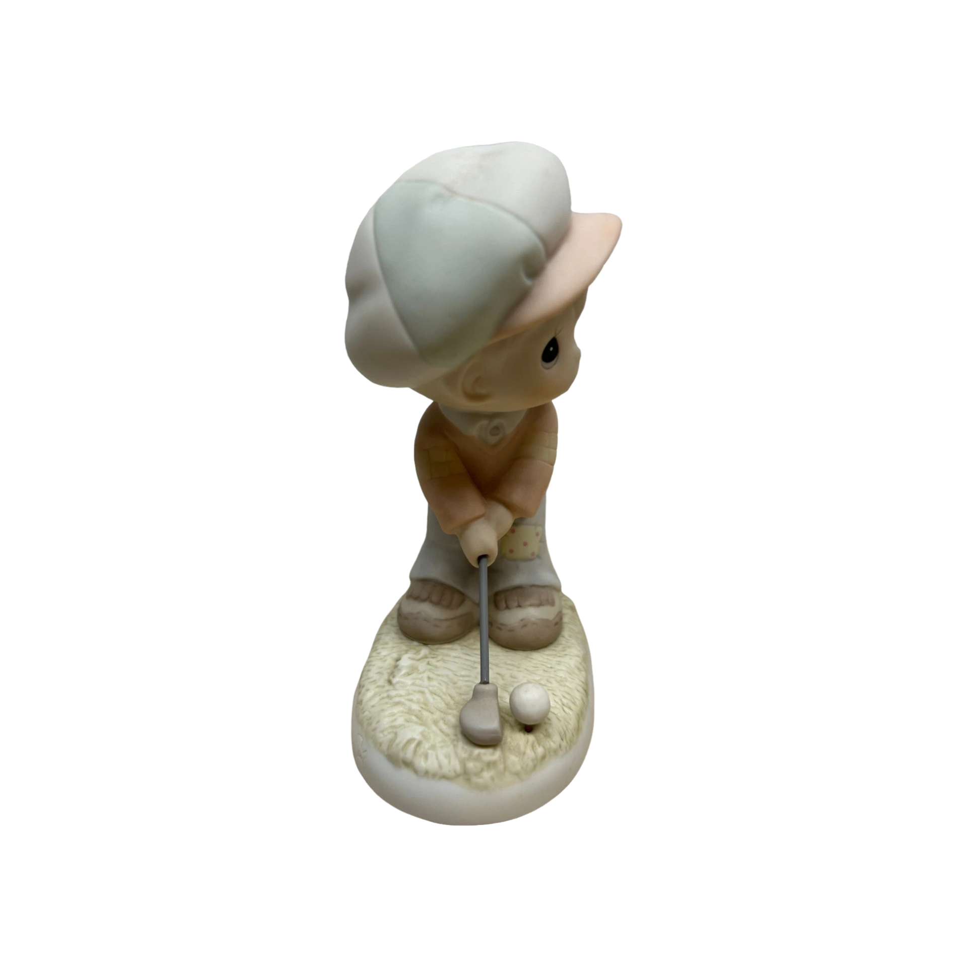 The 1994 Lord Help Me to Stay on Course figurine (item 532096) from Precious Moments — produced under Enesco — captures a charming scene of a young golfer pausing mid-swing, head bowed in a heartfelt moment of prayerful focus. Rendered in classic soft pastel tones and finished in matte porcelain/ceramic, the figure combines Precious Moments’ signature emotive style with a whimsical golf theme that’s both inspirational and relatable for collectors, sports fans, and those who appreciate meaningful sentiments.