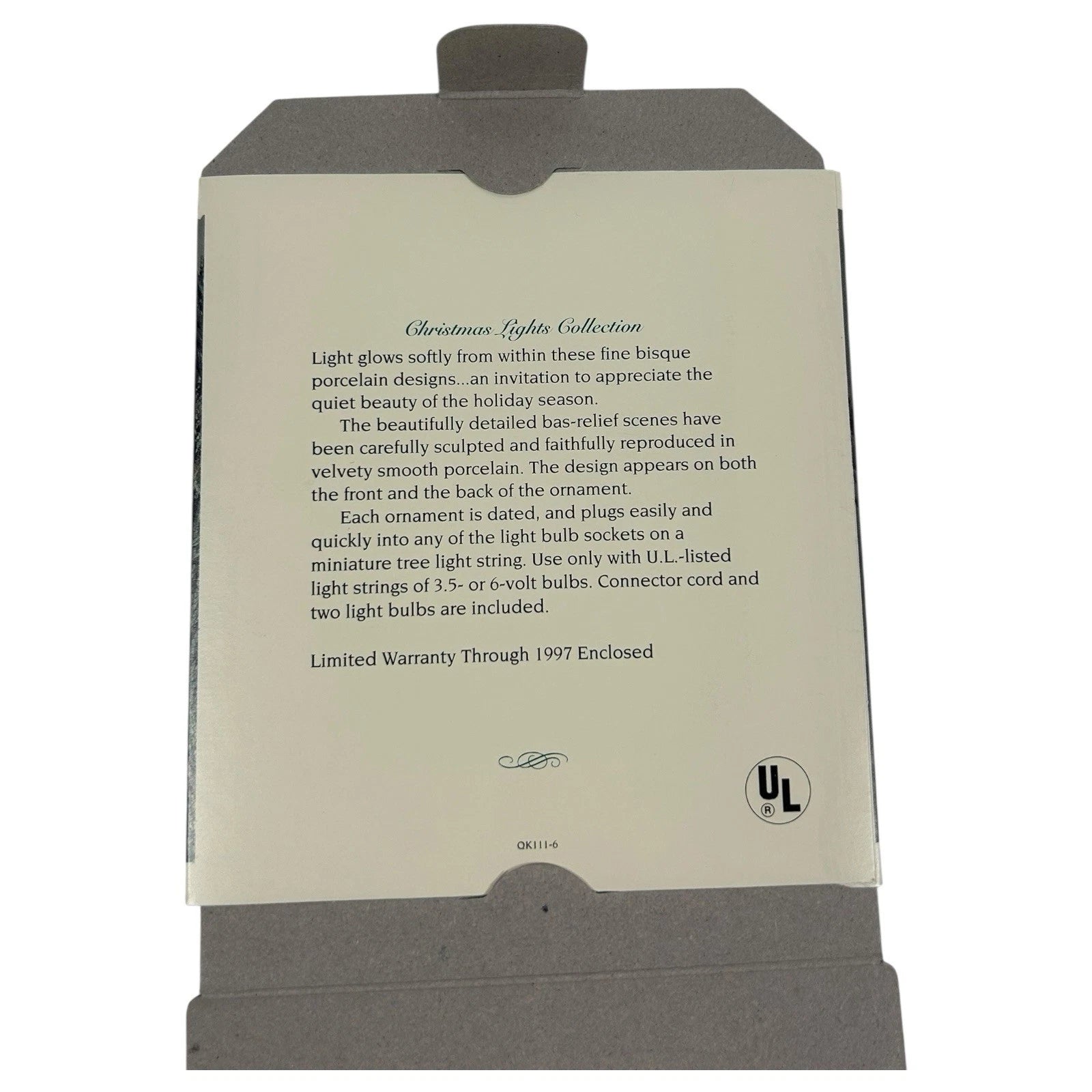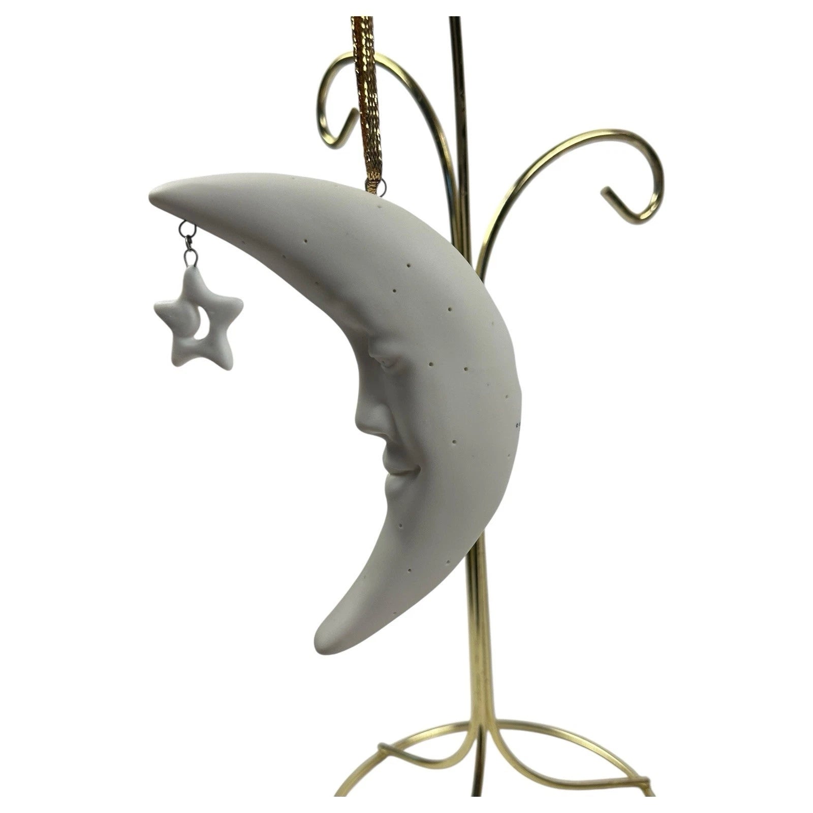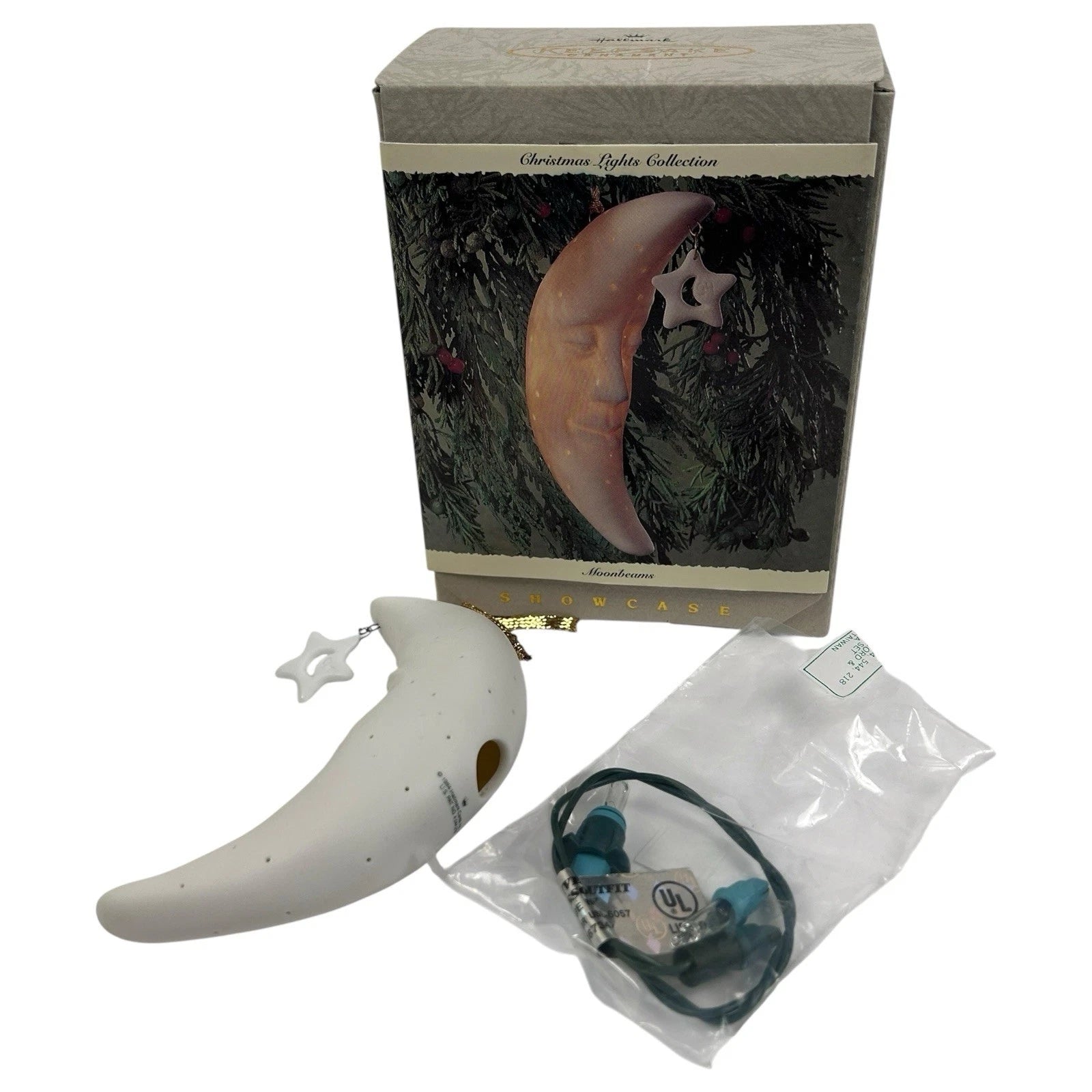 Illuminate your holiday decor with the 1994 Moonbeams ornament from Hallmark's Christmas Lights Collection. This delicate bisque porcelain ornament features a serene crescent moon with a gentle face and a dangling star, capturing the tranquil essence of a winter night. Designed by artist Patricia Andrews, it plugs into any standard miniature light string, casting a soft, glowing ambiance. The ornament comes in its original packaging, ensuring its pristine condition for collectors and gift-givers alike.