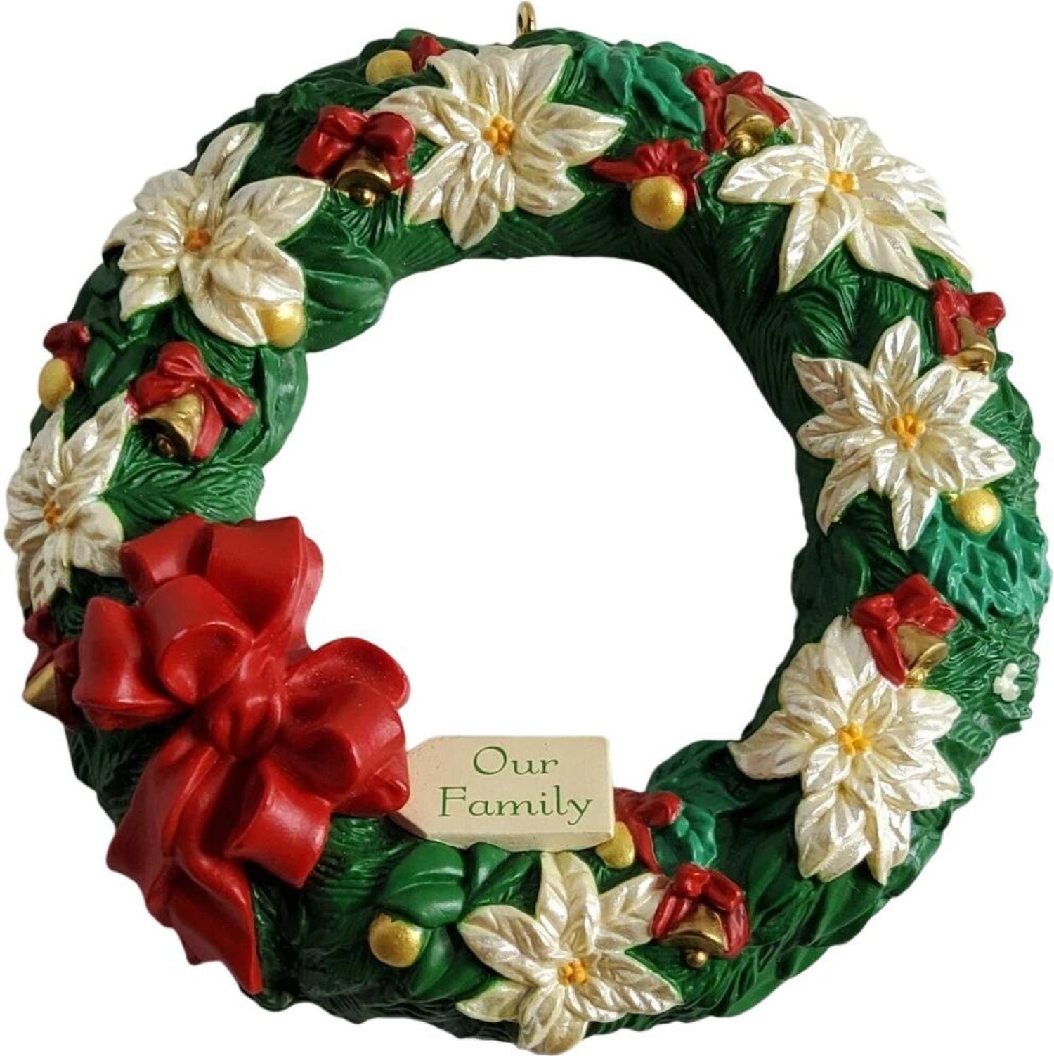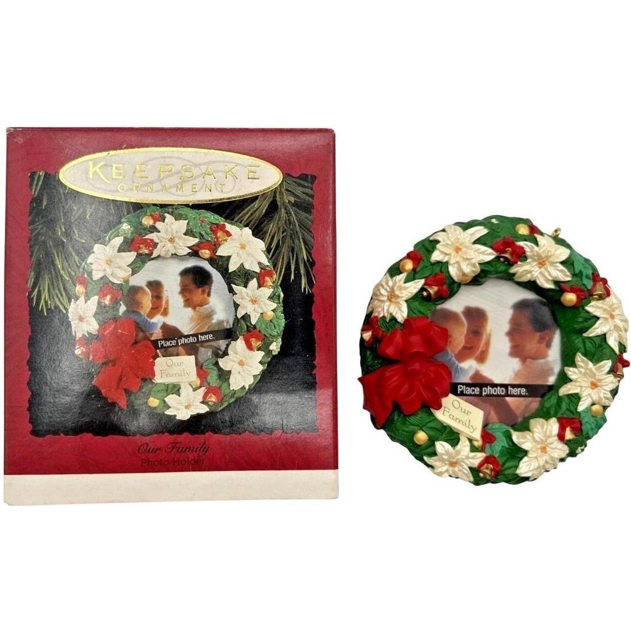 Celebrate the circle of family love with the elegant 1994 Our Family photo holder ornament. Crafted as a festive wreath adorned with poinsettias, golden bells, and a graceful bow, this ornament holds a cherished family photo at its center. On the back, the touching sentiment reads: “The wonderful meaning of Christmas is found in the circle of family love — 1994.” This keepsake arrives in its original box and hangs beautifully—no power or accessories required.