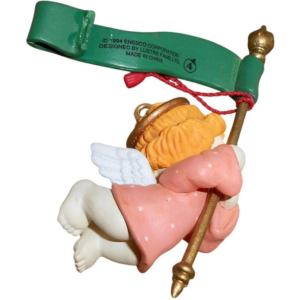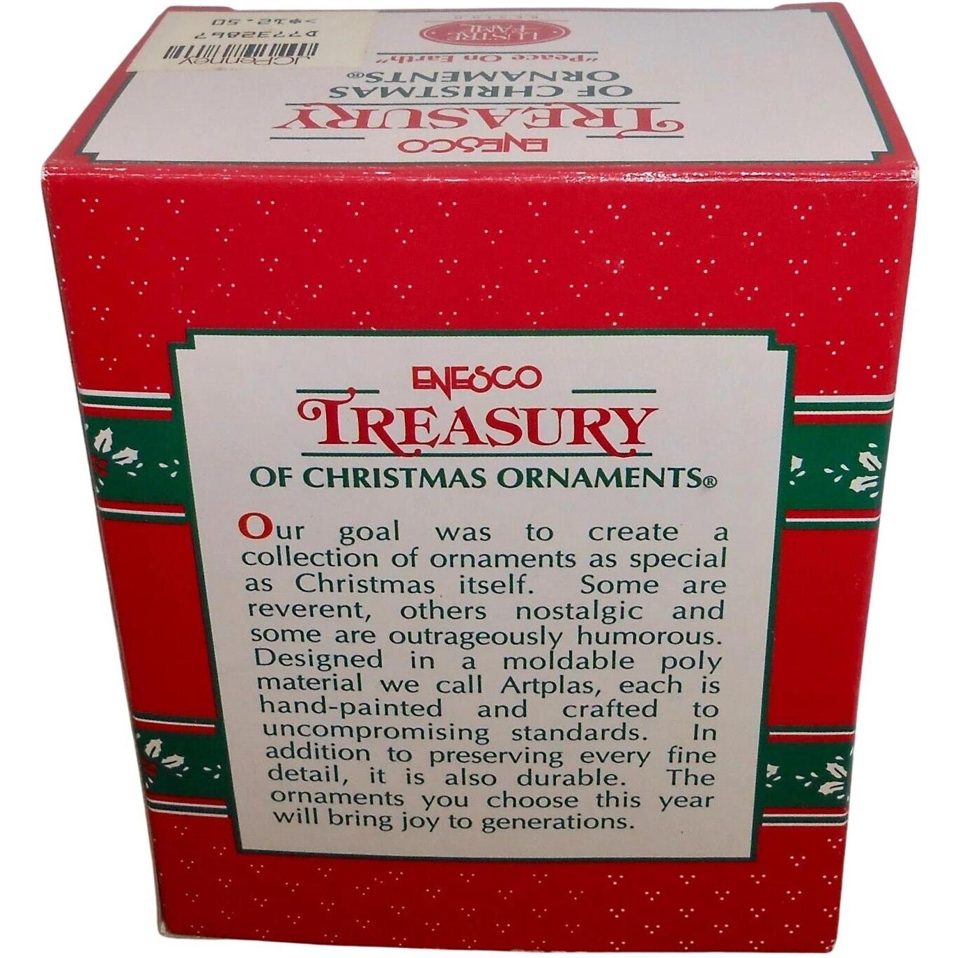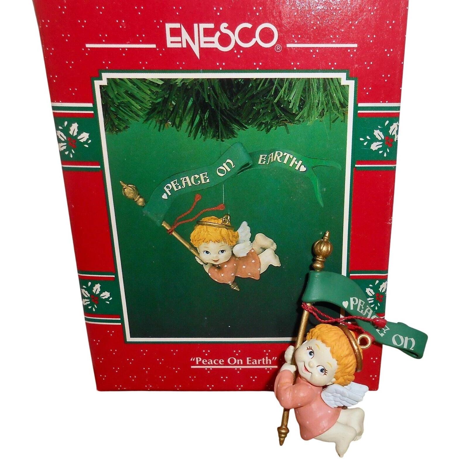 Embrace the serenity of the season with the 1994 Enesco “Peace on Earth” ornament. This elegant collectible features a graceful angel holding a golden dove, symbolizing love, hope, and harmony across the world. Hand-painted in soft pastels with delicate metallic accents, it showcases Enesco’s signature artistry and gentle craftsmanship. A timeless keepsake for collectors and a beautiful reminder of the true meaning of Christmas, this ornament radiates warmth, grace, and peace for all.