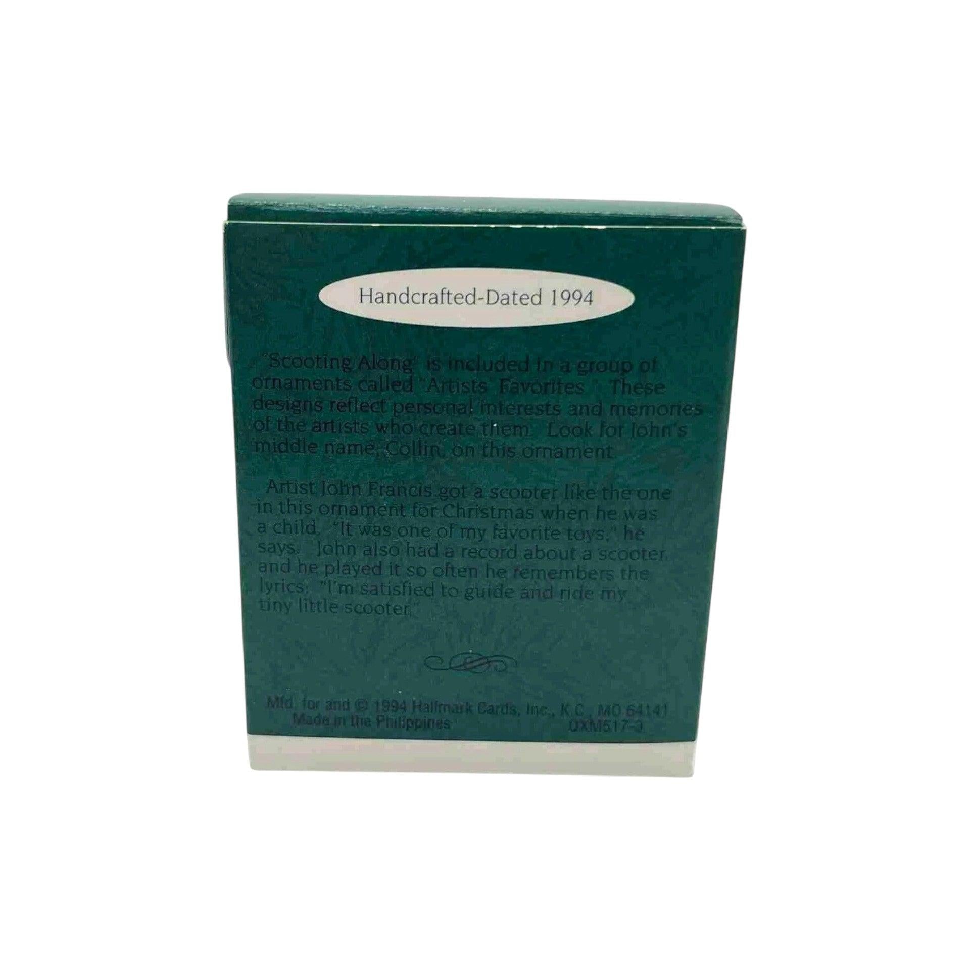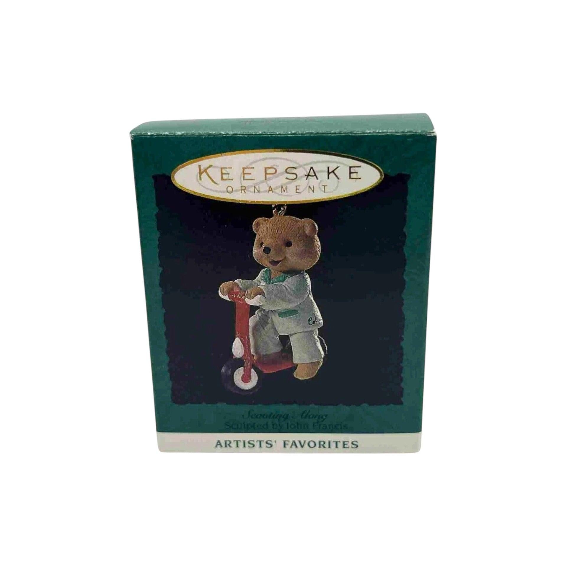 This 1994 ornament features an adorable teddy bear captured in a playful moment as it scoots along, conveying motion and childlike joy. The design typically shows the bear riding or sliding on a small wheeled or winter-themed object, reflecting Hallmark’s warm and whimsical teddy bear styling from the mid-1990s. Soft detailing and a friendly expression give the ornament classic appeal for bear lovers and collectors alike. The ornament usually comes packaged with its original Hallmark box and is intended for decorative display only. It does not include lights, sound, or motion features and therefore requires no batteries, cords, or light strings.