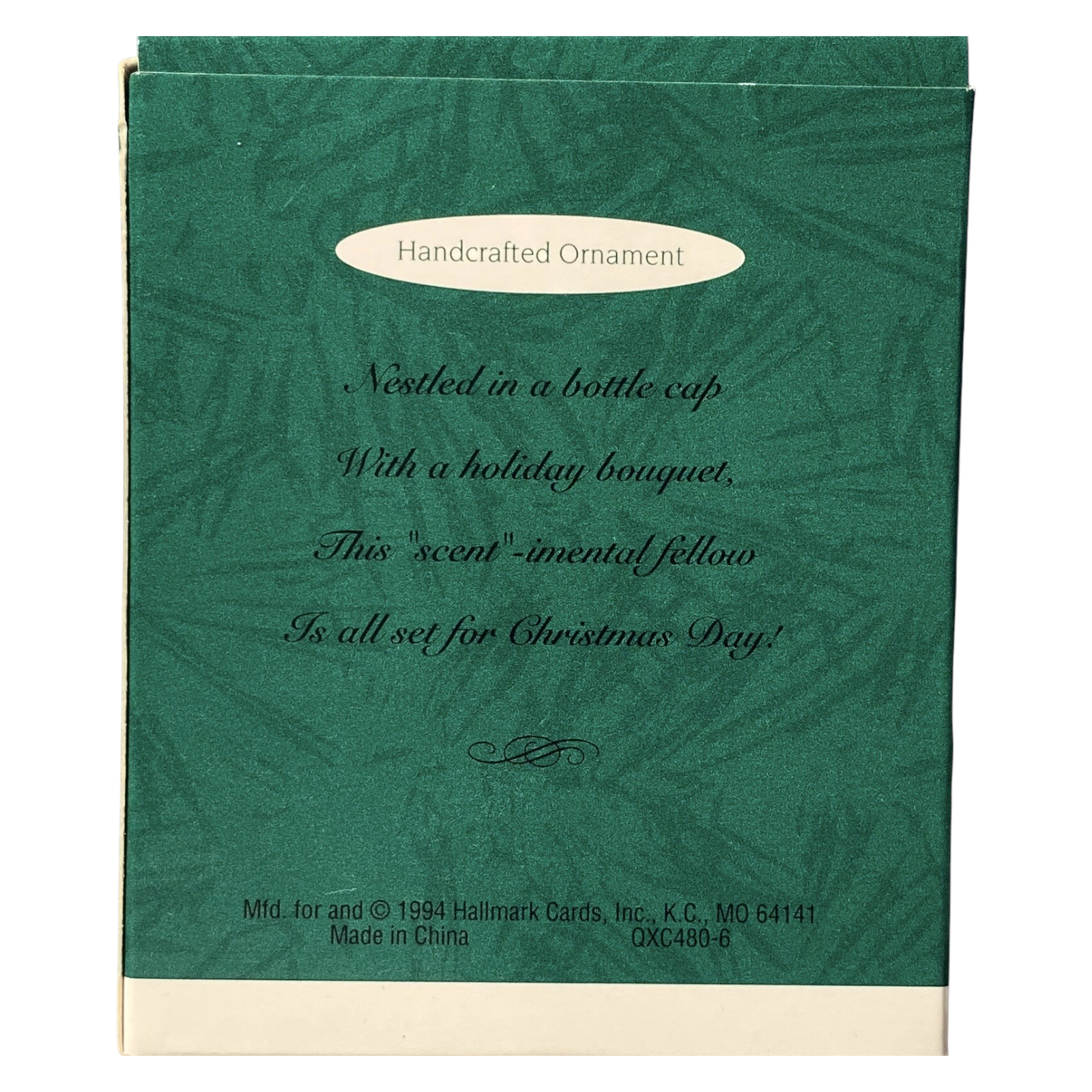 This miniature ornament from Hallmark Keepsake features a skunk character nestled in a bottle-cap style “bouquet” design, released in 1994 under the Collector’s Club/miniature line. The piece is extremely compact — only about 1.25″ high — and offers a charming animal motif with vintage appeal for collectors of Hallmark miniatures and whimsical holiday décor.