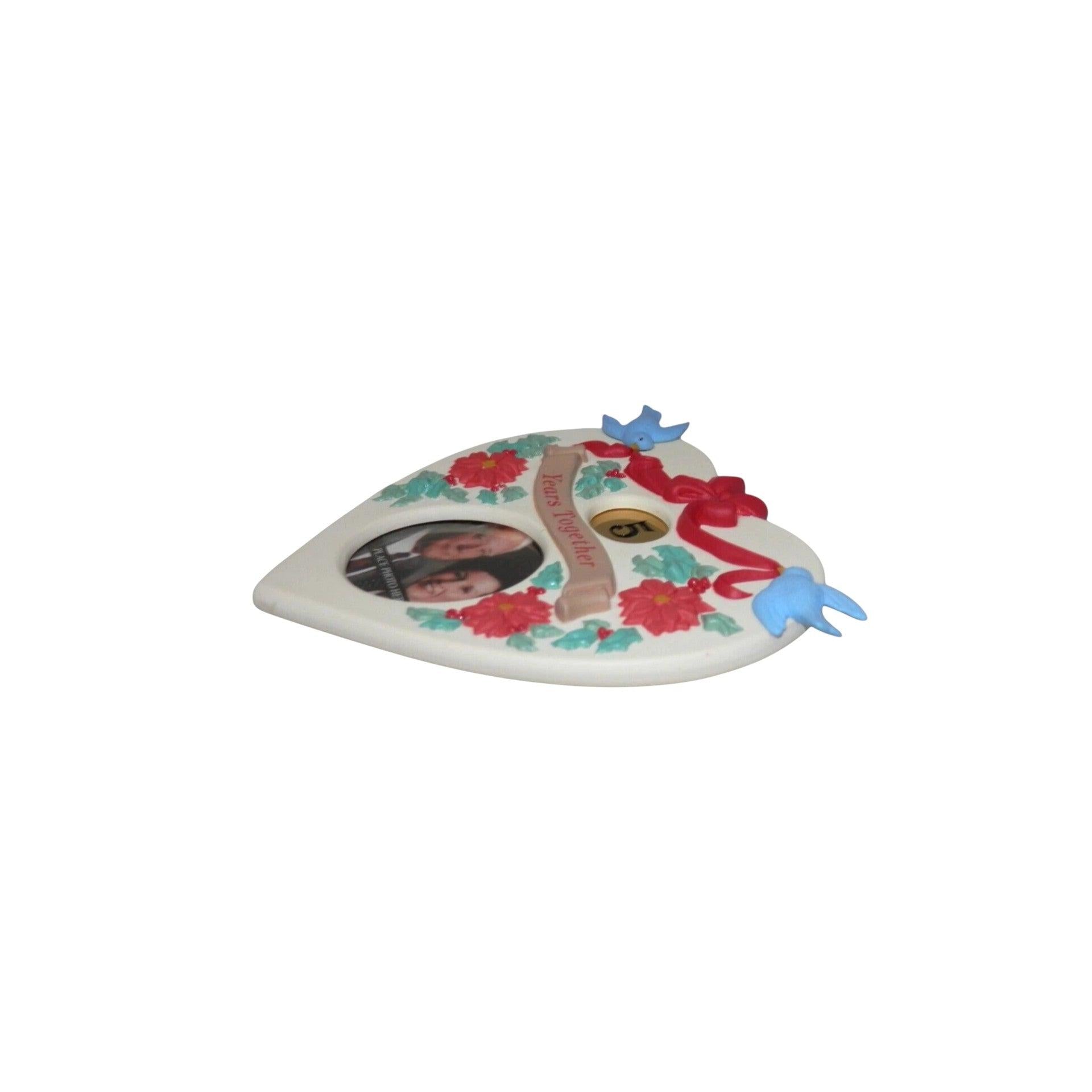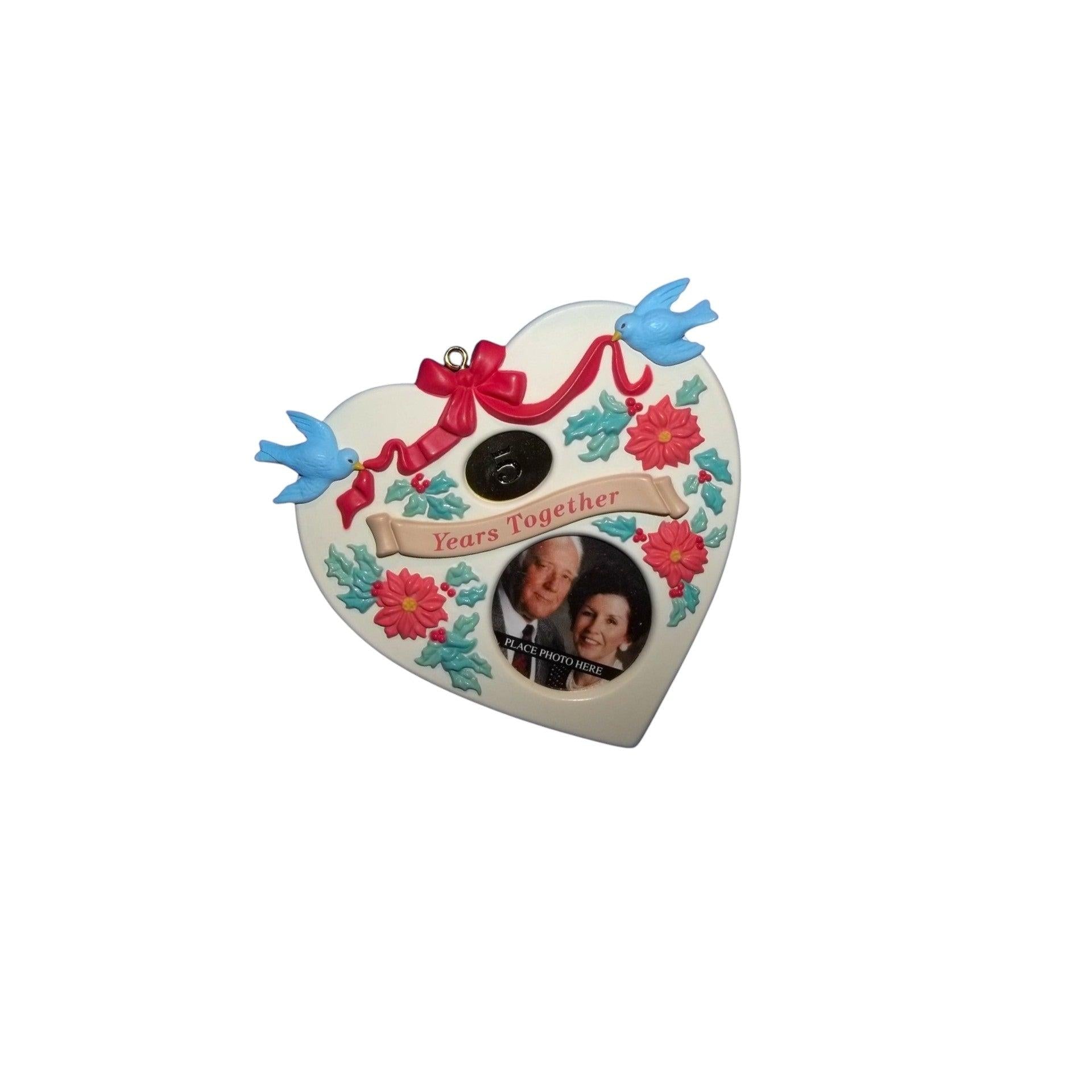 Celebrate a milestone with this 1995 Hallmark Keepsake ornament, “Anniversary Year – Photo Holder”. The ornament is designed as a heart-shaped frame, ready to hold a photo and includes year-insert plates (e.g., 5, 10, 20, 25 years) for personalising the moment. The mix of sentimental design and versatility makes this piece especially appropriate for anniversaries, weddings, or long-term couples collections. Crafted in 1995, it offers both decorative charm and a keepsake value.
