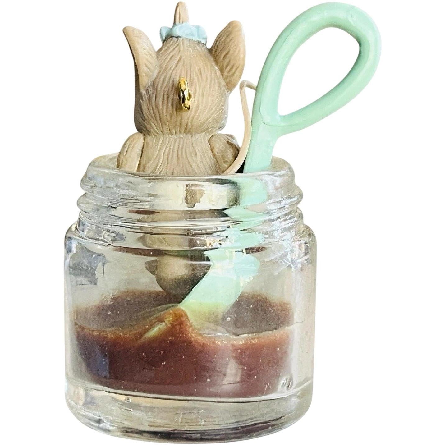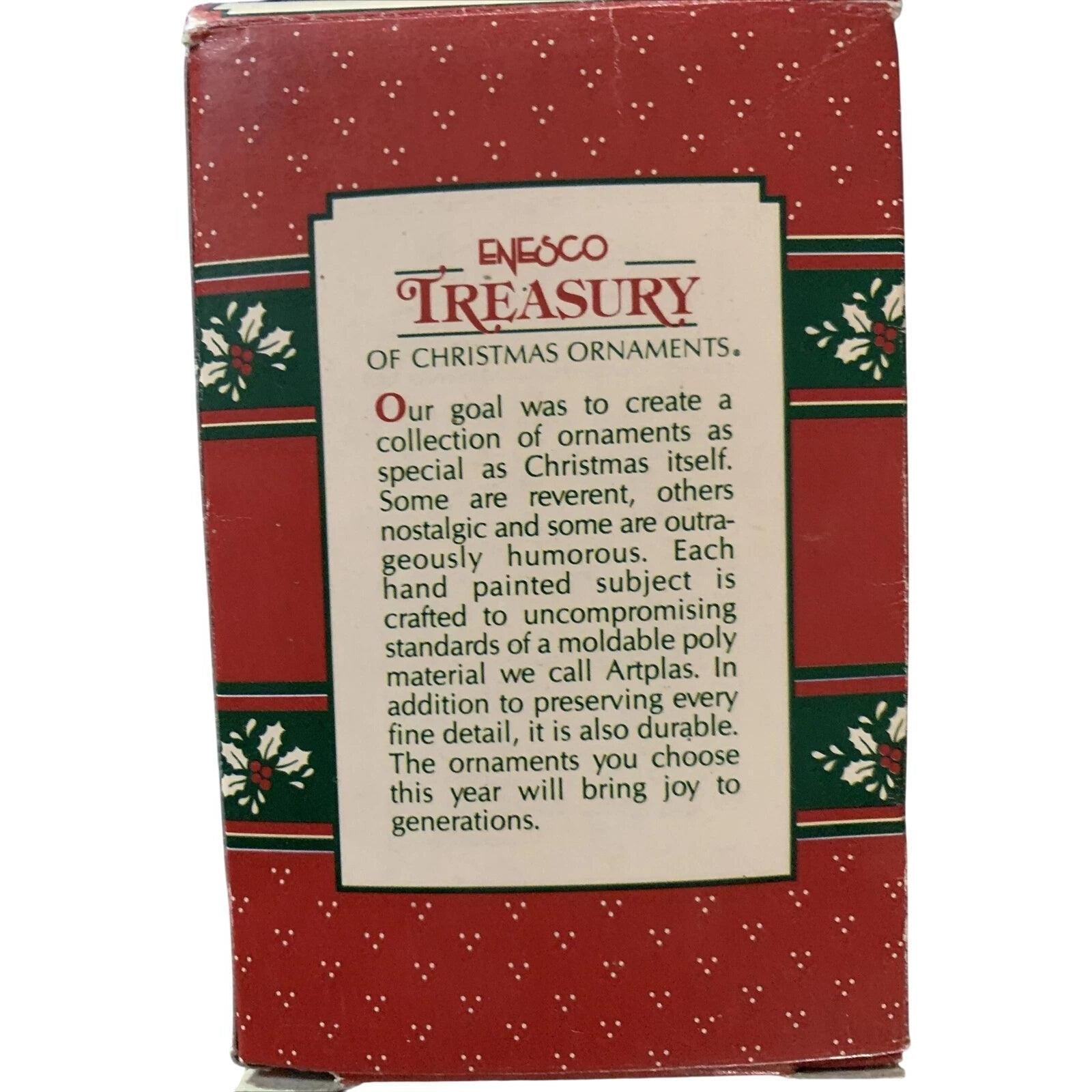 This delightful 1995 “Baby’s Sweet Feast” ornament features an adorable baby seated in a candy-cane high‐chair enjoying a festive treat—evoking the joy of a baby’s first holiday celebration. Crafted with molded plastic (or resin-style) and hand-painted in vivid holiday colours with textured holiday detailing, it brings warmth and whimsy to any Christmas décor. A standout for new-parent gifts or collector shelves, it combines sentimentality with collectible charm. It is noted as the third issue in its “Baby” series.