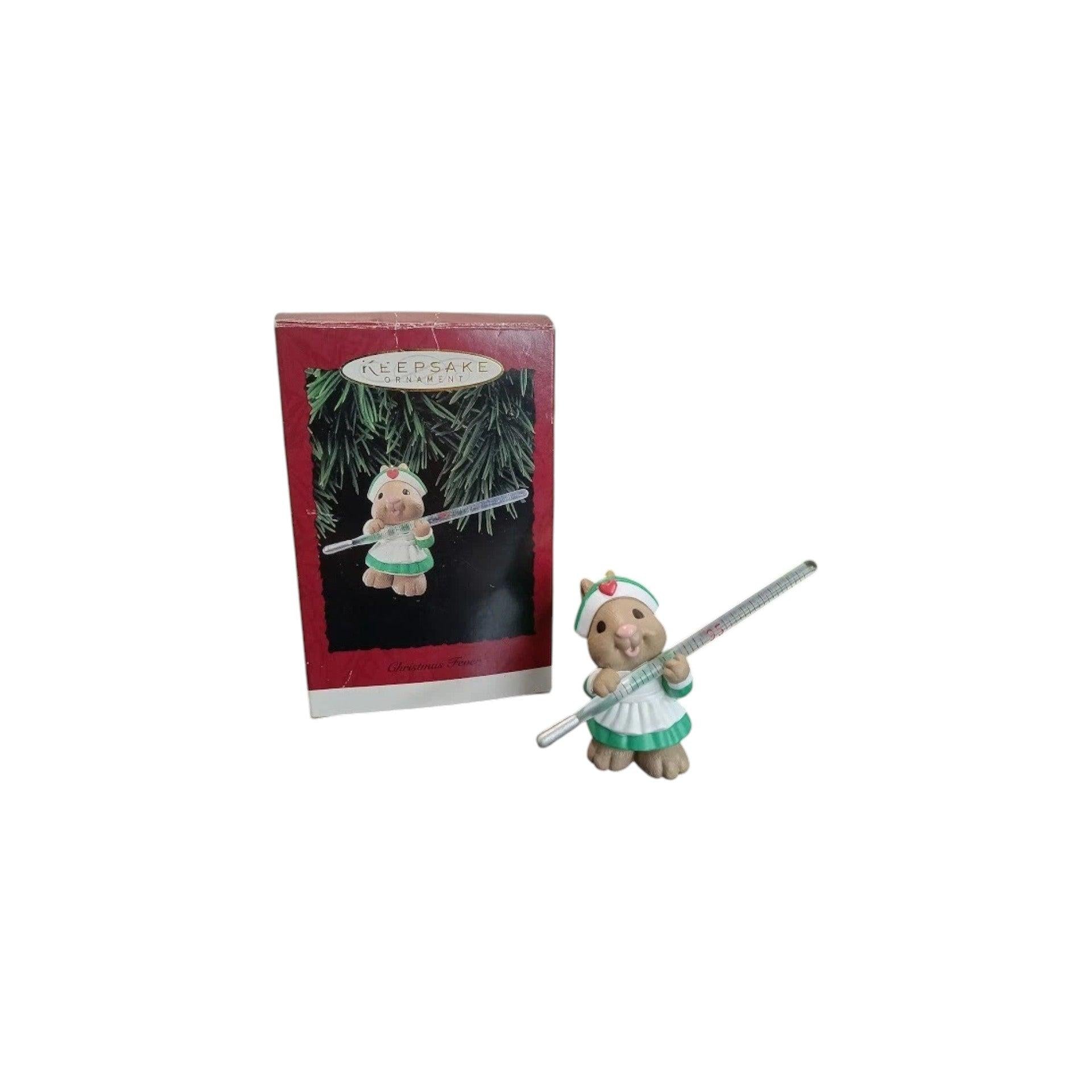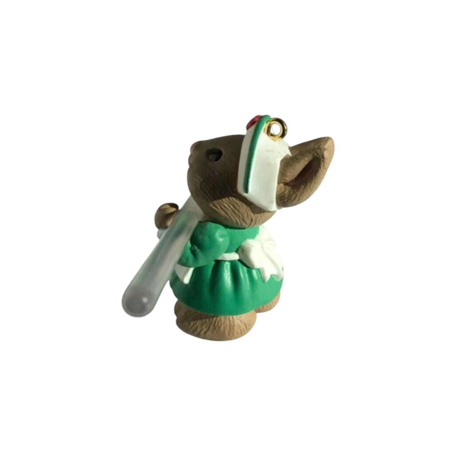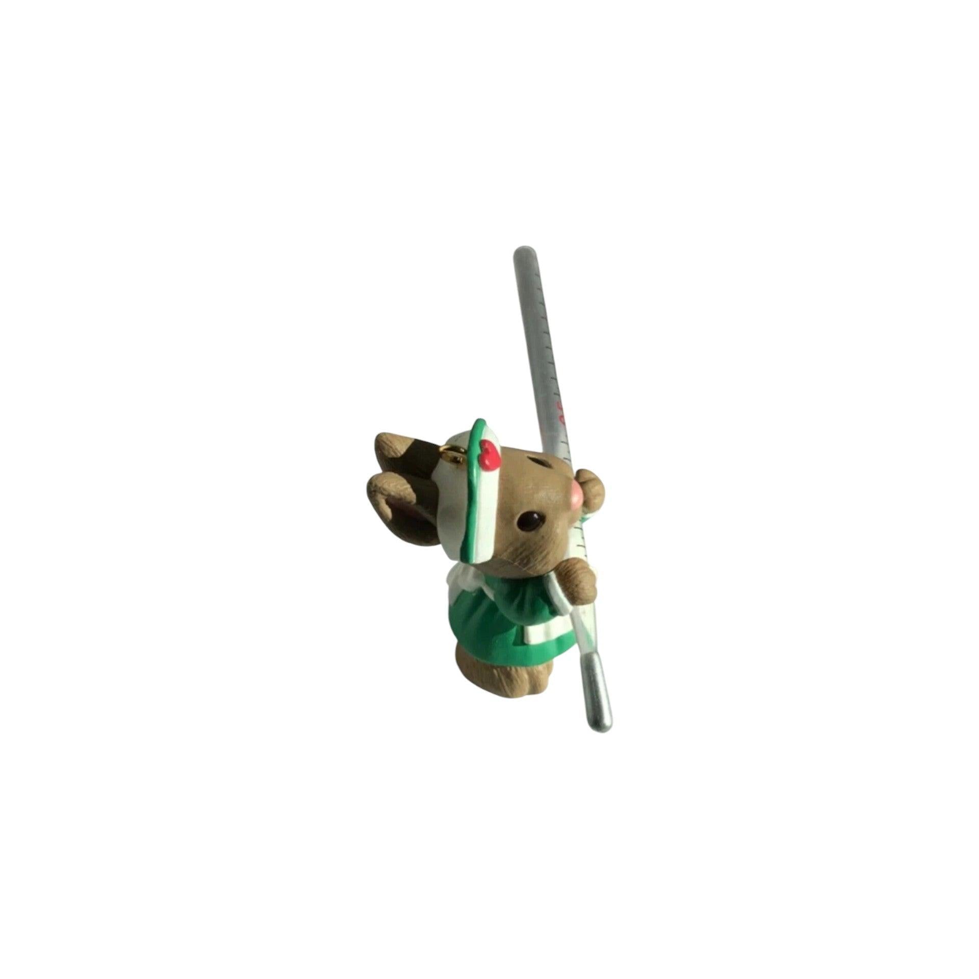 This 1995 “Christmas Fever” Nurse ornament from Hallmark features a mouse nurse character holding a thermometer. The thermometer is dated “95” to mark the year. The piece is hand-painted in festive colors and captures a sweet, whimsical vibe. The ornament comes with the metal hanging loop and in mint-in-box versions includes its original box and Hallmark tag. It is purely decorative—no batteries, lights, cords, or moving parts required.