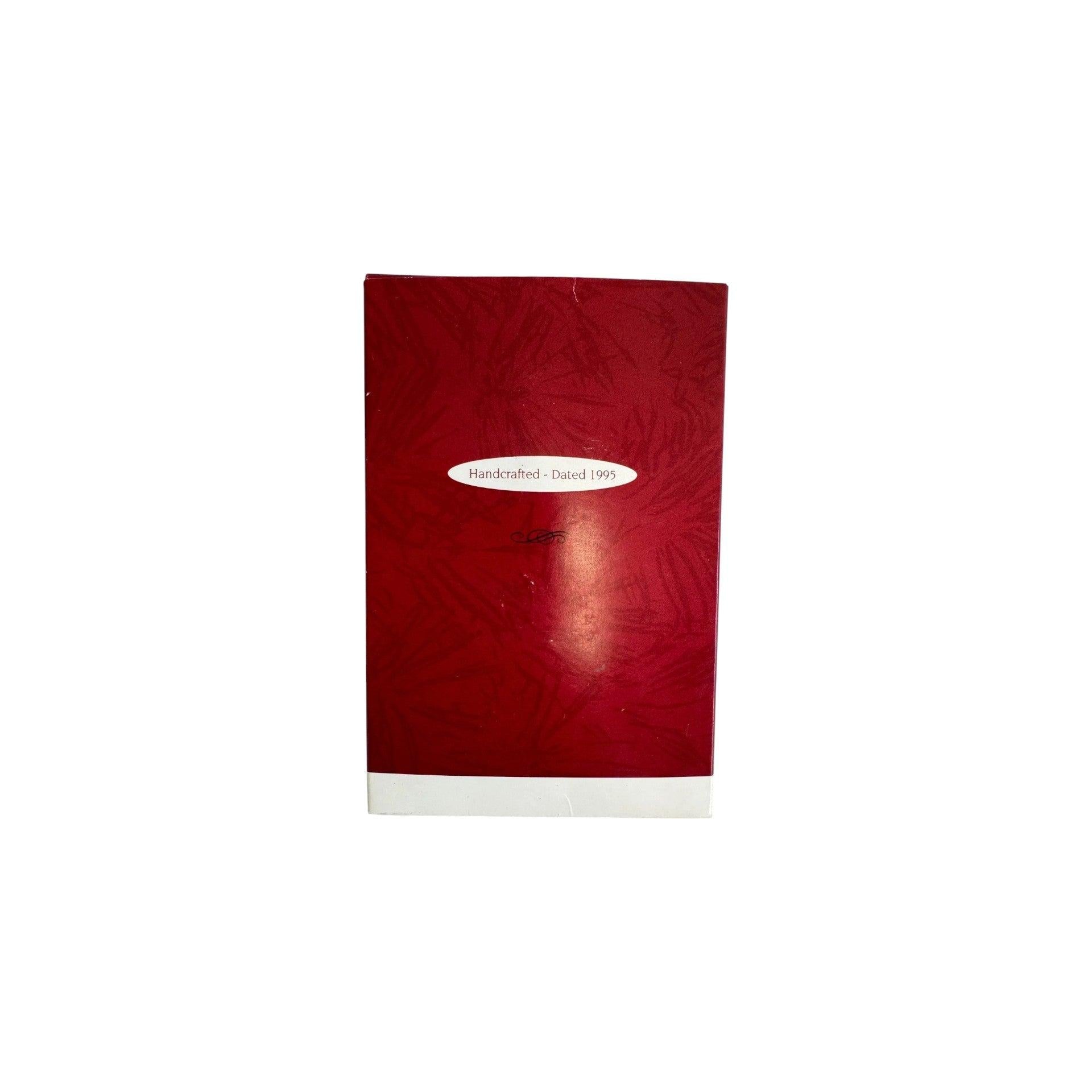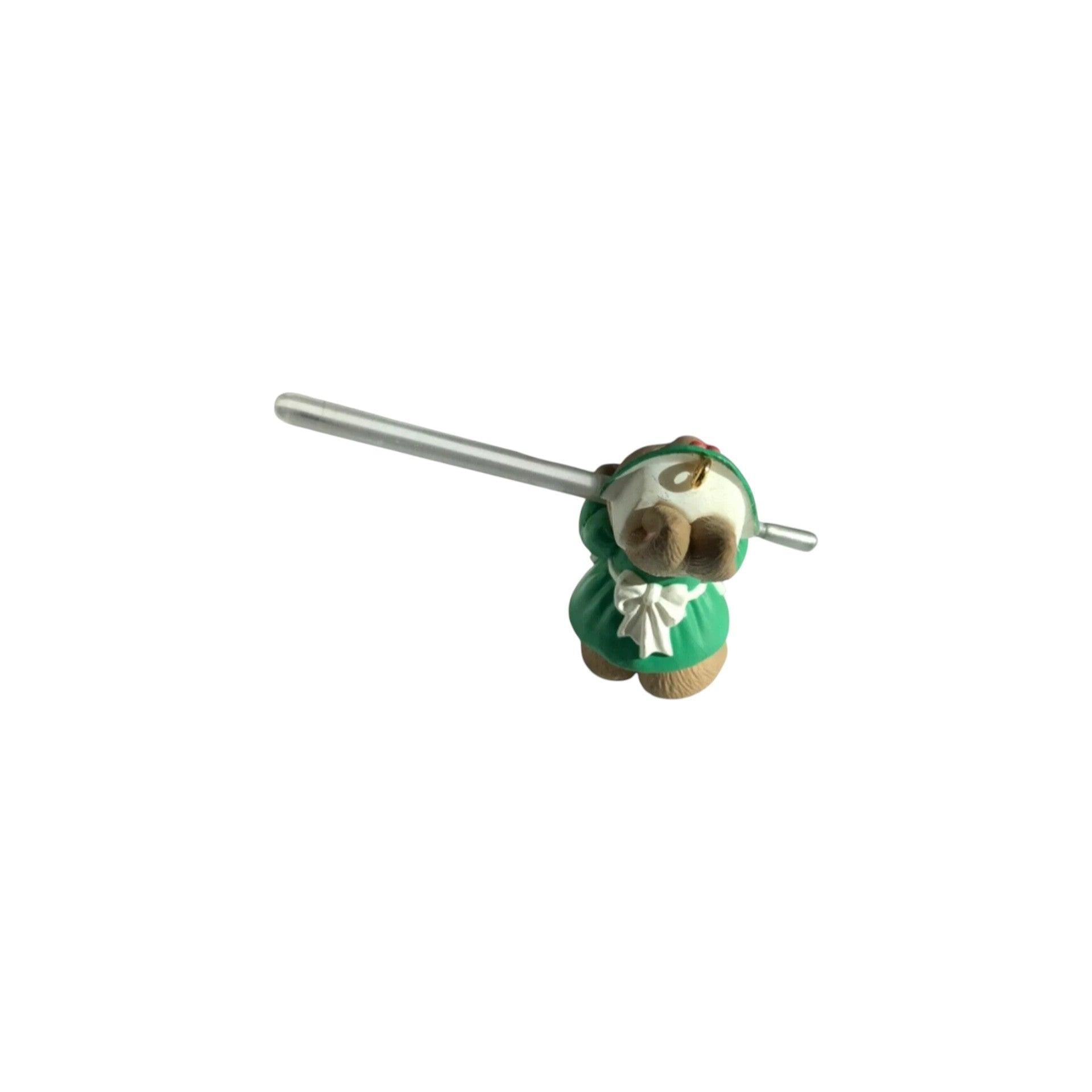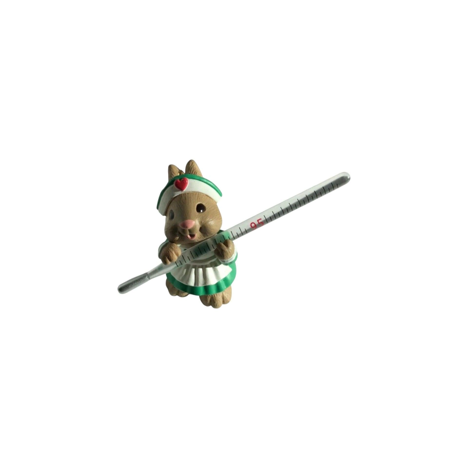 This 1995 “Christmas Fever” Nurse ornament from Hallmark features a mouse nurse character holding a thermometer. The thermometer is dated “95” to mark the year. The piece is hand-painted in festive colors and captures a sweet, whimsical vibe. The ornament comes with the metal hanging loop and in mint-in-box versions includes its original box and Hallmark tag. It is purely decorative—no batteries, lights, cords, or moving parts required.