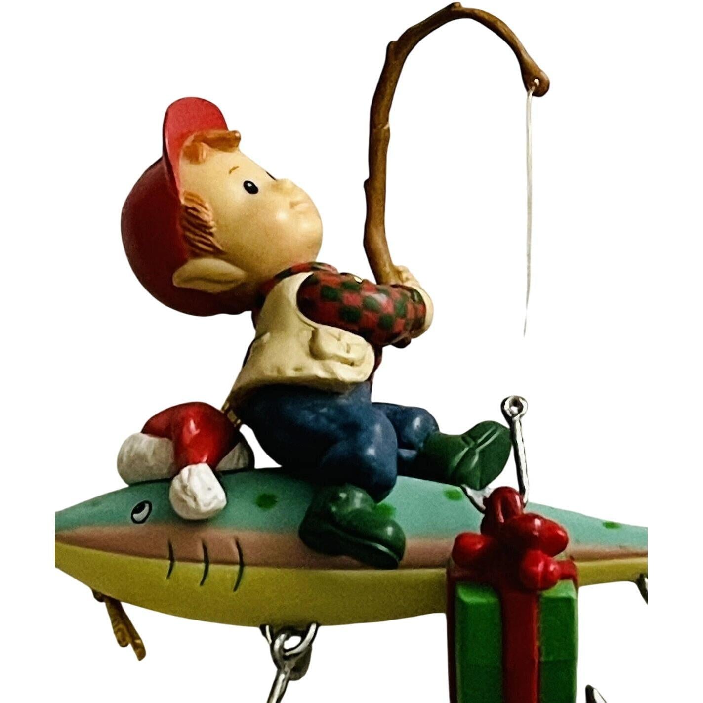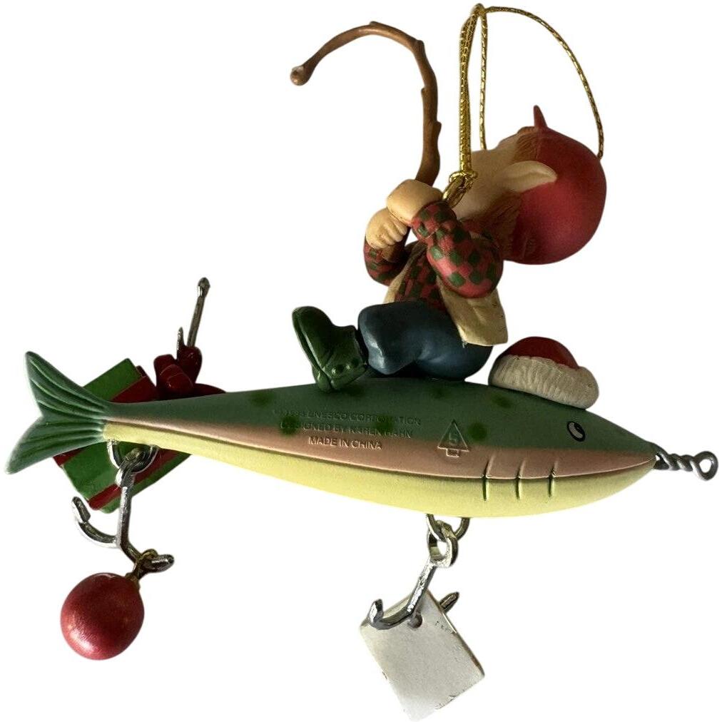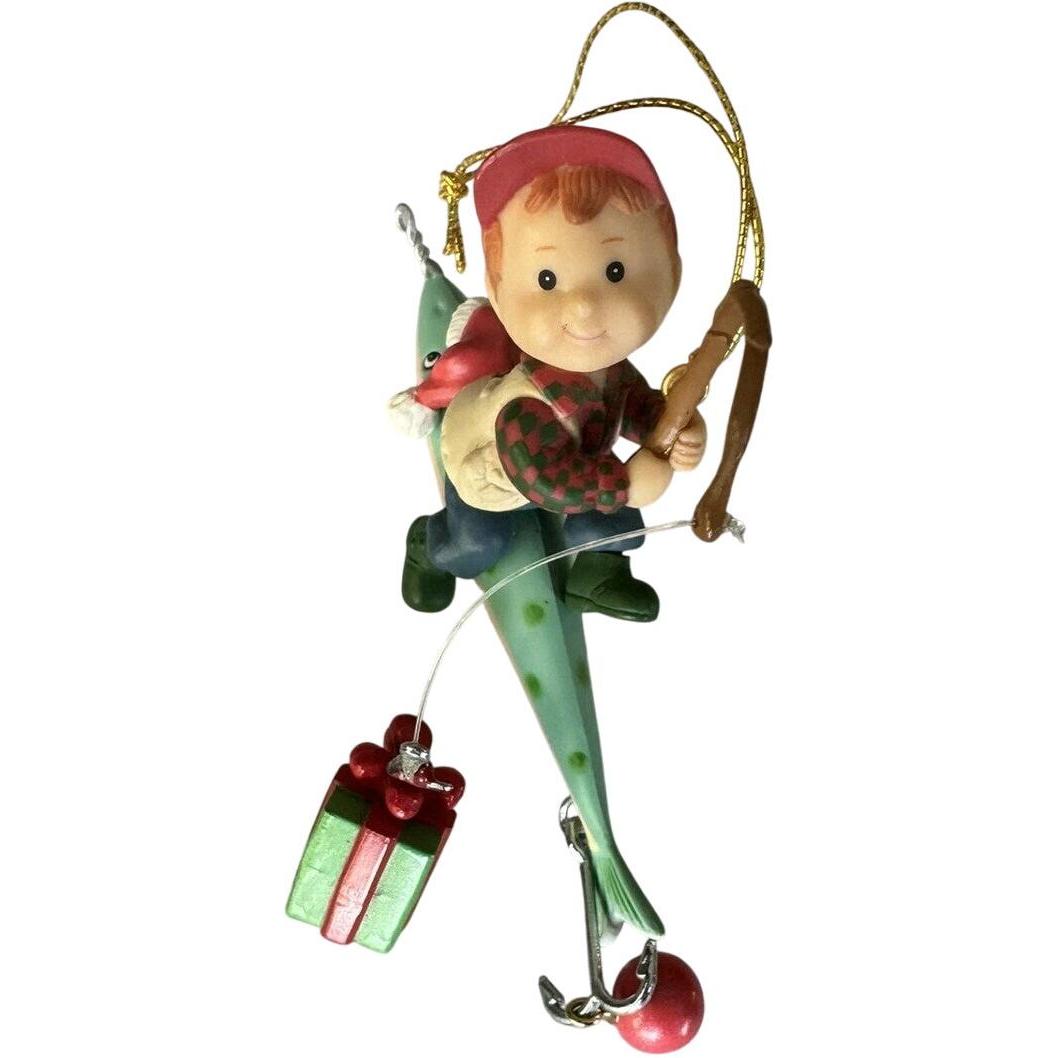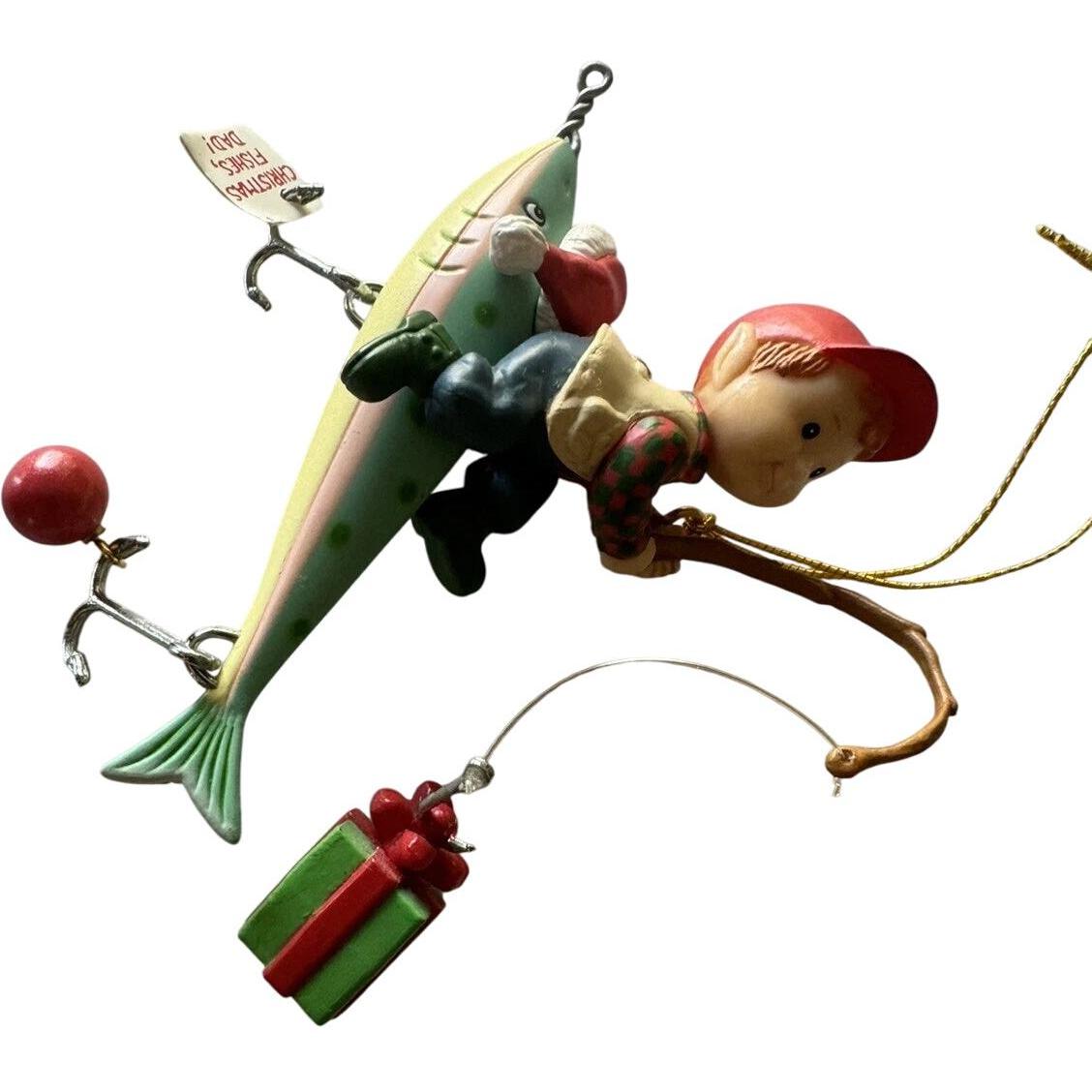 Celebrate the spirit of father-and-son (or dad-and-child) bonding with this charming 1995 “Christmas Fishes, Dad” ornament. The design features a young fisherman (or child in fishing attire) perched atop a large colourful lure, casting a small gift in place of a typical hook-and-bait setup. Crafted from ArtPlas (a durable moldable poly material) and hand-painted in rich holiday colours, this piece offers both playful storytelling and nostalgic charm. Its fishing-theme motif makes it a perfect keepsake for dads who love to fish, family-themed collections, and vintage holiday décor enthusiasts.