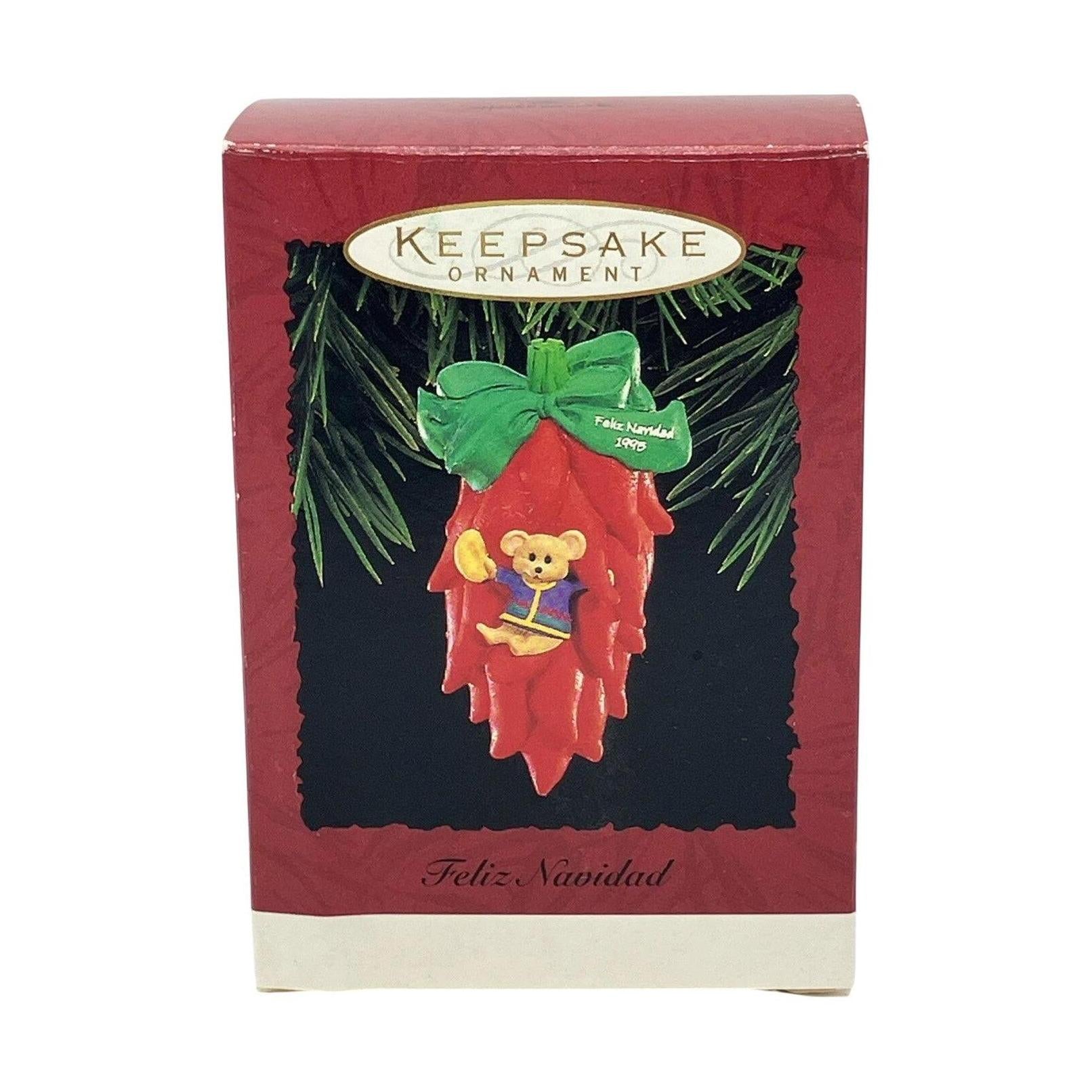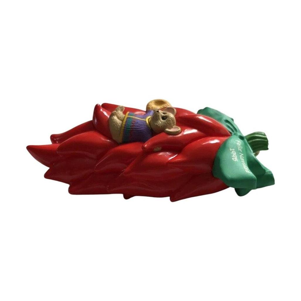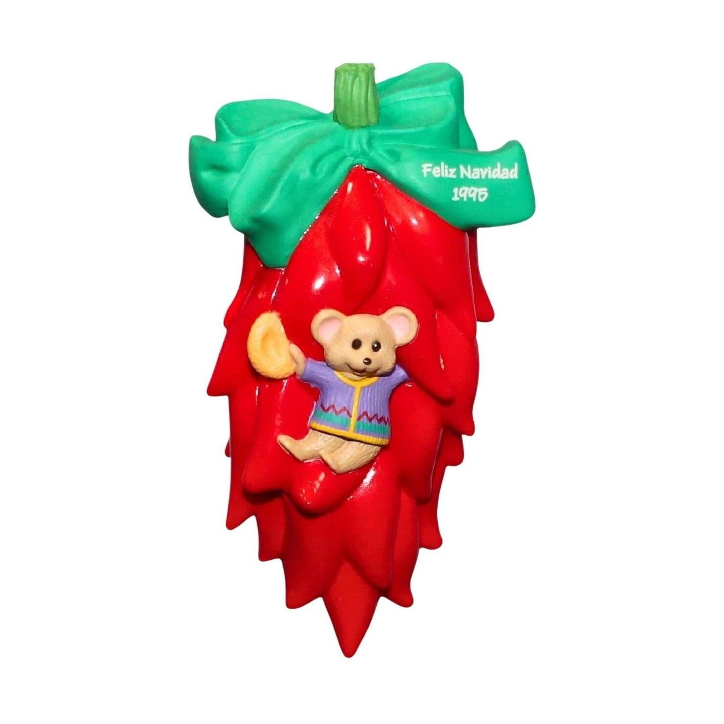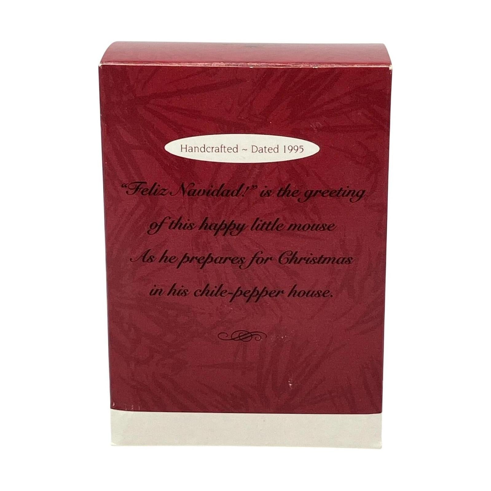 Add a dash of heartwarming charm to your holiday collection with the 1995 Feliz Navidad ornament, featuring a cheerful mouse nestled inside a red chili-pepper shell, topped with a green bow that reads “Feliz Navidad 1995.” This playful piece captures festive spirit through cultural flair and endearing design. Crafted by artist Dill Rhodus, the ornament arrives mint-in-box with its original tag and requires no batteries, cords, or lights—just joyful nostalgia and collector appeal.
