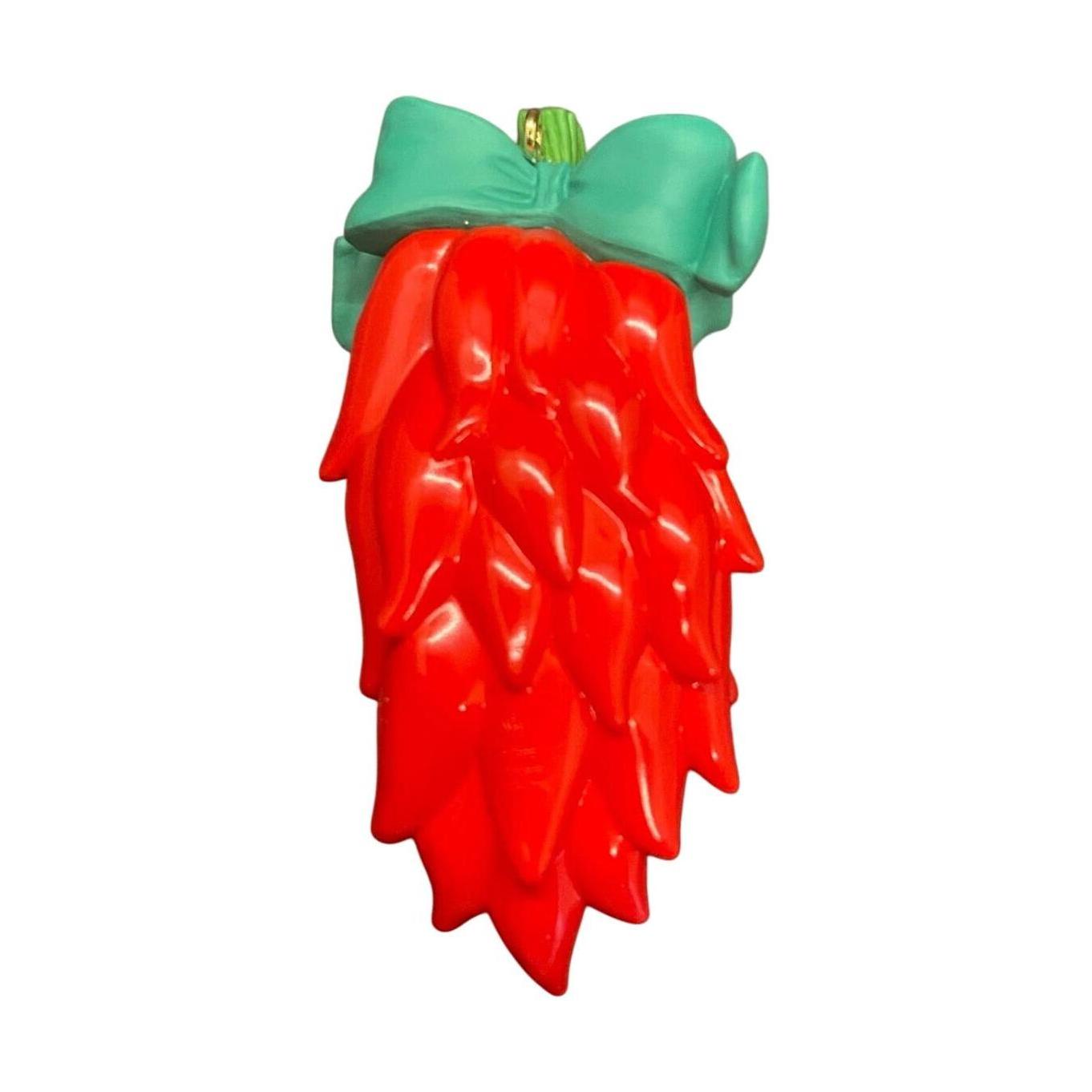 Materials: Mixed materials — bright red resin/plastic chili pepper with a detailed mouse interior and festive green bow