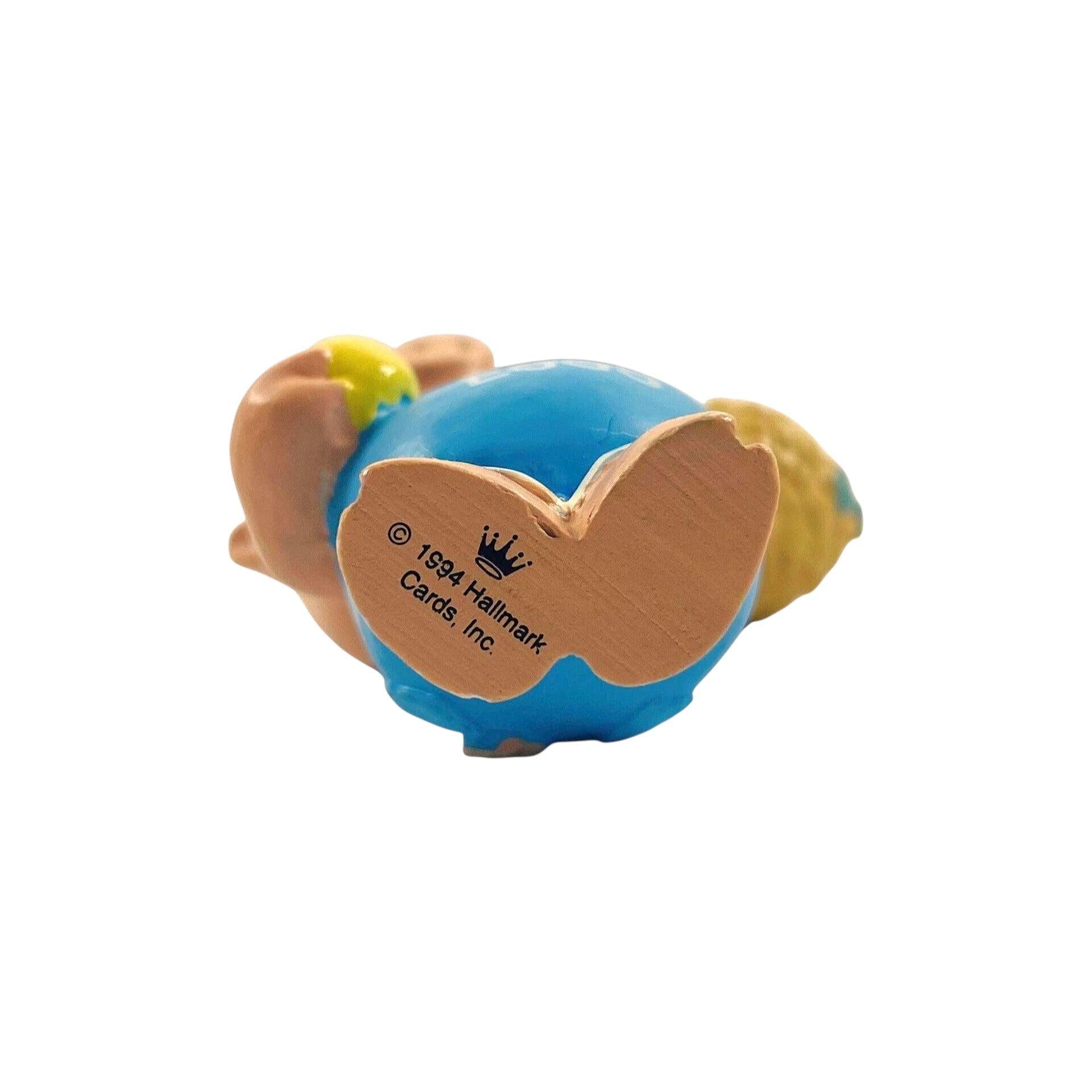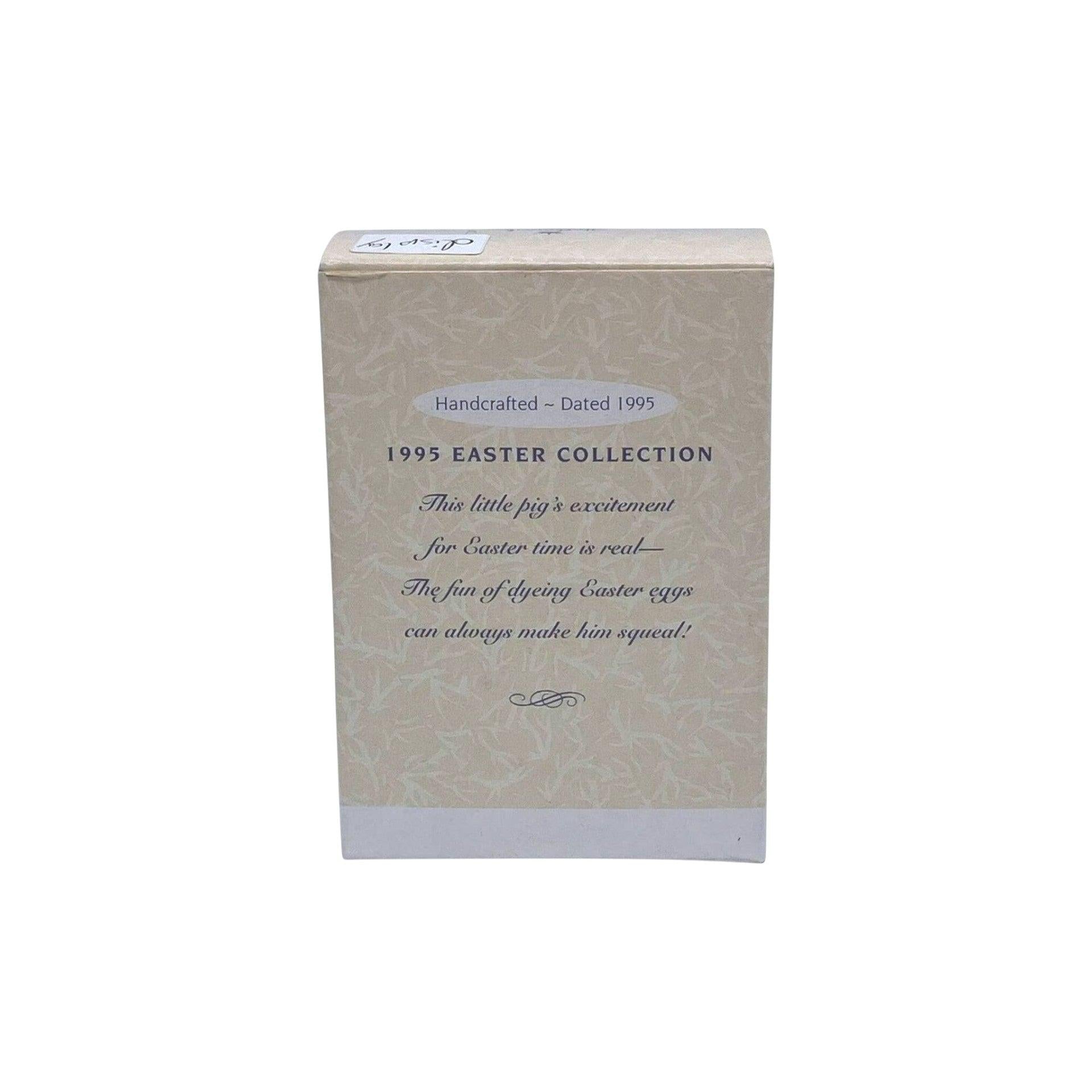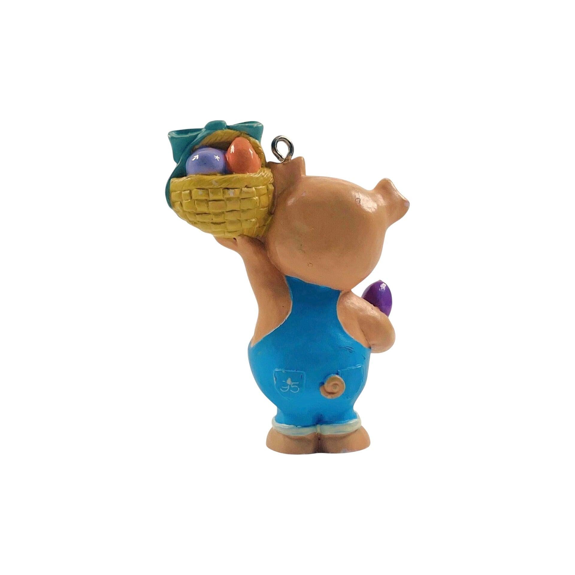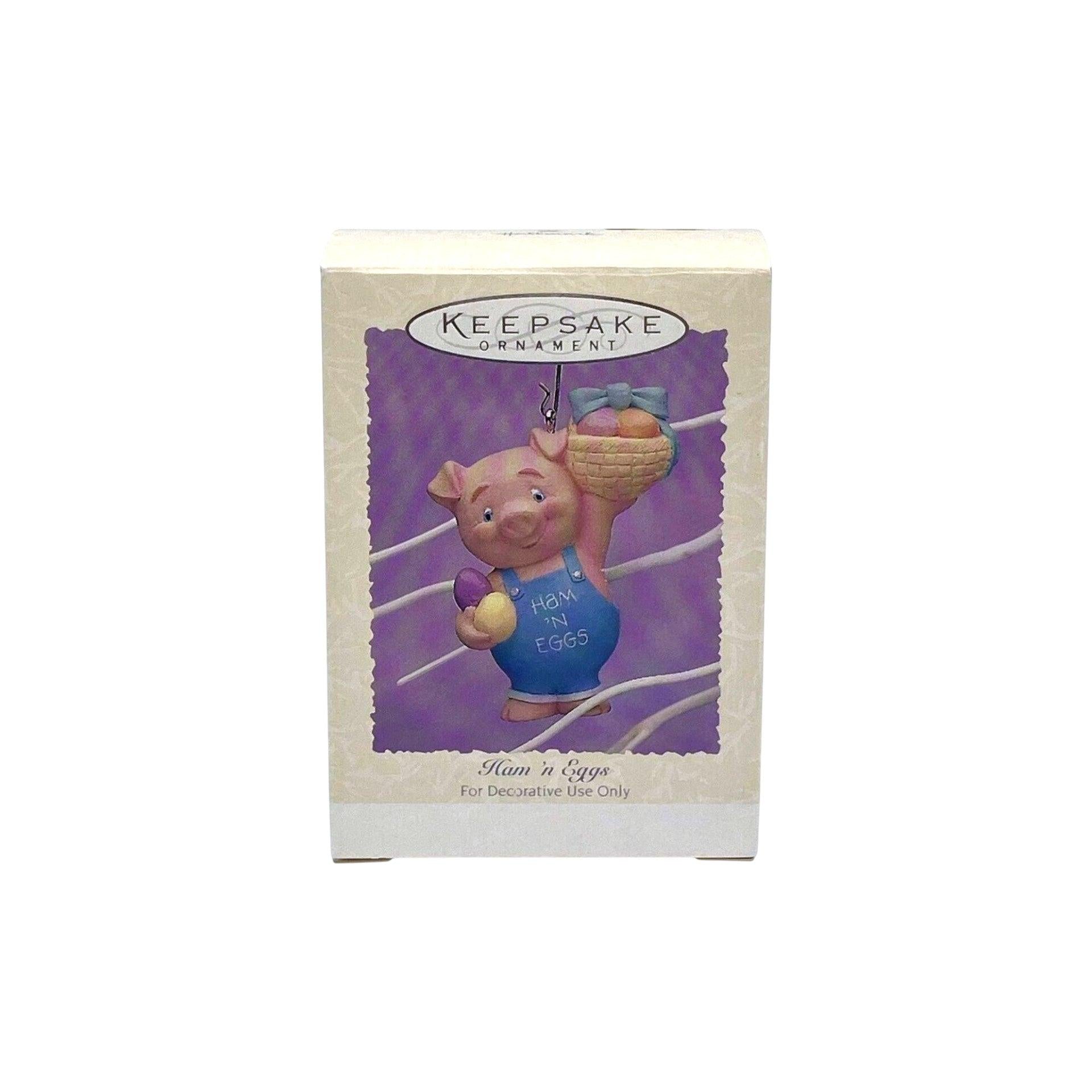 This ornament features a cheerful pig wearing blue overalls emblazoned with the phrase “Ham N Eggs,” holding a basket filled with pastel-colored eggs and extra eggs in his other hand. The piece was released in 1995 as part of the Hallmark Keepsake Easter/Spring collection (model QEO8277) and was sculpted by artist Robert Chad. The quirky pig-and-eggs motif gives it a playful twist suitable for Easter décor or collectors of whimsical animal-themed ornaments.