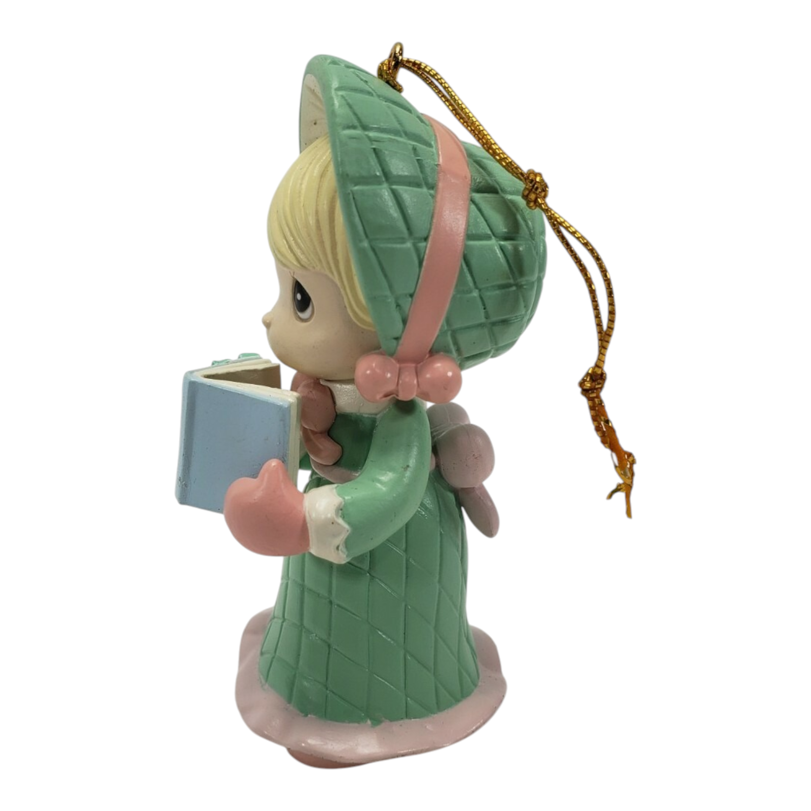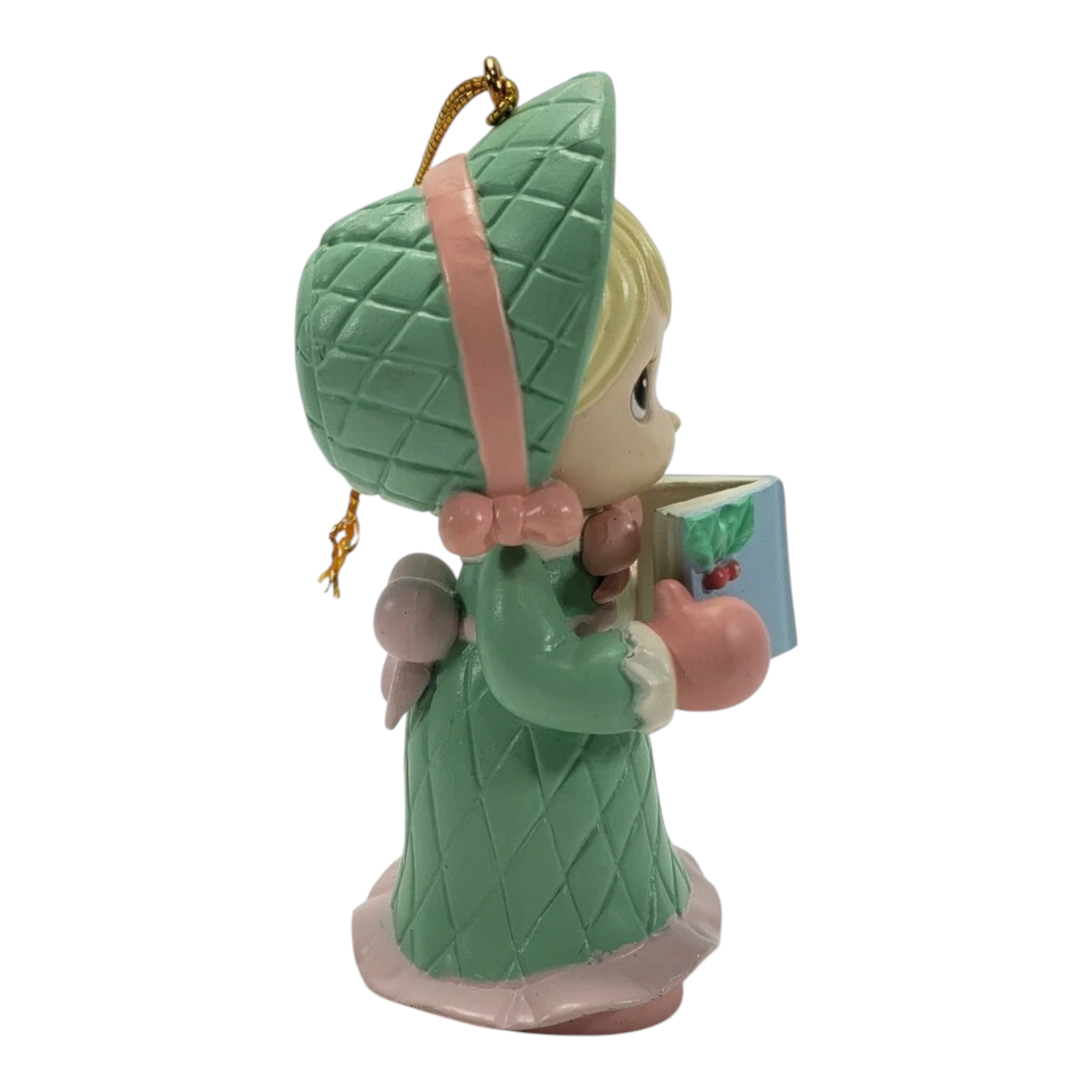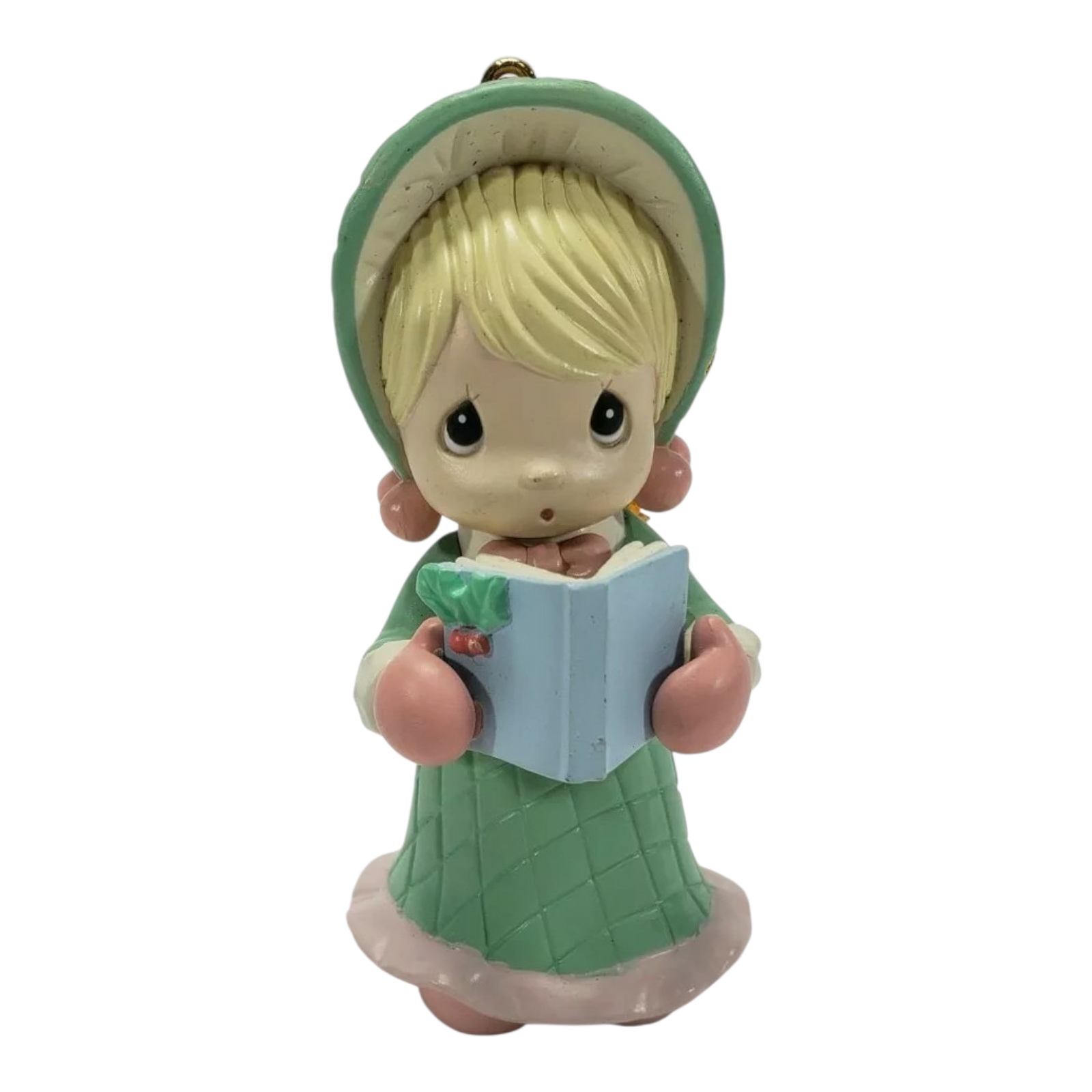 This charming 1995 piece from the Home for the Holidays collection features a sweet Precious Moments figure – whether a little boy riding a sled or a little girl caroling, depending on version – dressed for winter, framed by a festive wreath or seasonal motif that evokes the warmth and joy of returning home for the holidays.