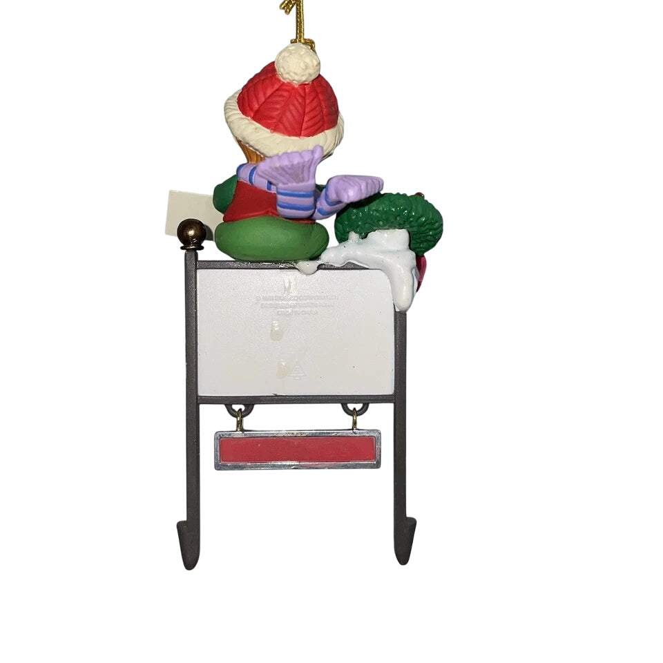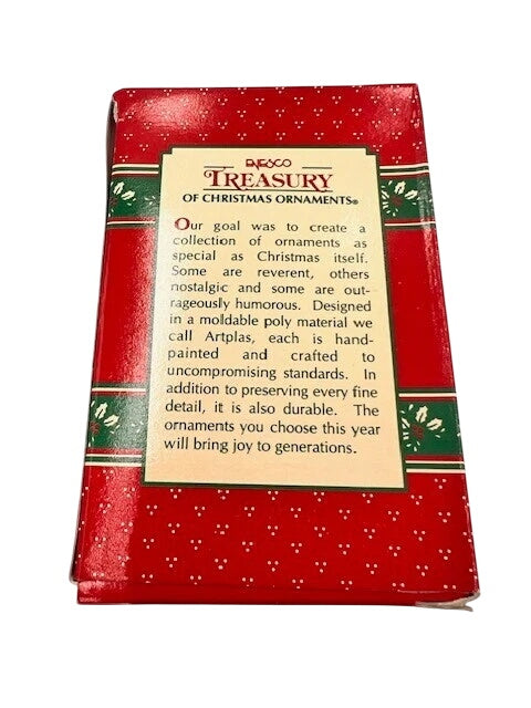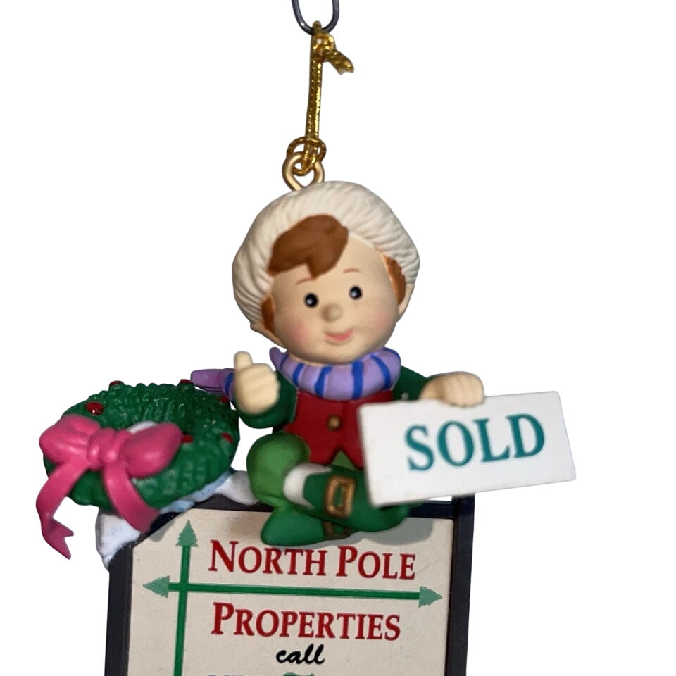 Celebrate the season with a whimsical twist thanks to this charming 1995 Enesco ornament titled “On The Move At Christmas”. This piece features a cheerful holiday elf perched atop a “North Pole Properties” sign, proudly holding a “SOLD” placard and the message “ASK FOR SANTA” beneath — blending festive décor with a playful real-estate theme. Crafted in hand-painted resin/plastic, with vivid colours and fine detailing, it’s a standout ornament for collectors of novelty holiday décor, real-estate themed gifts, or Enesco fans seeking unique pieces. The design by Karen Hahn adds collectible appeal.