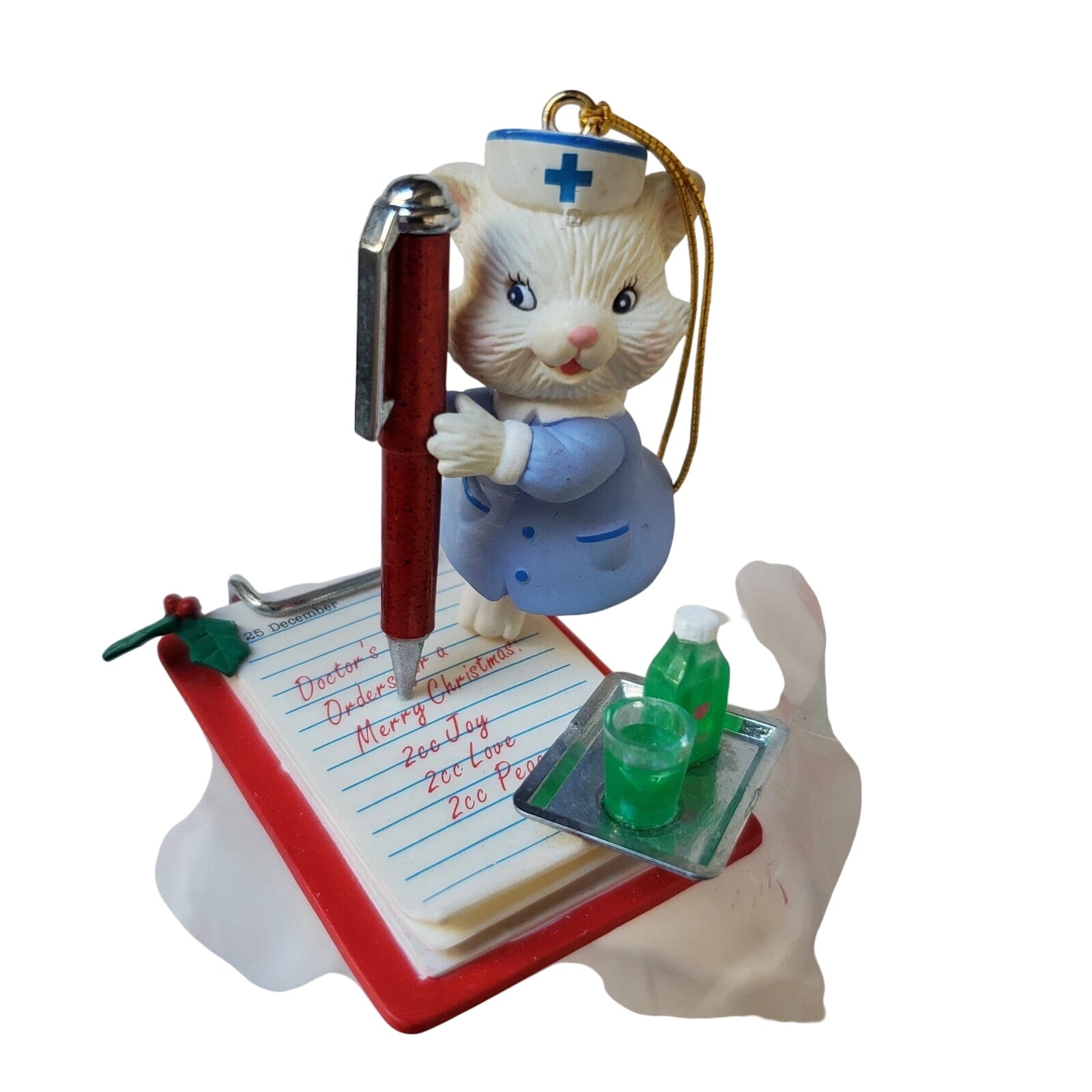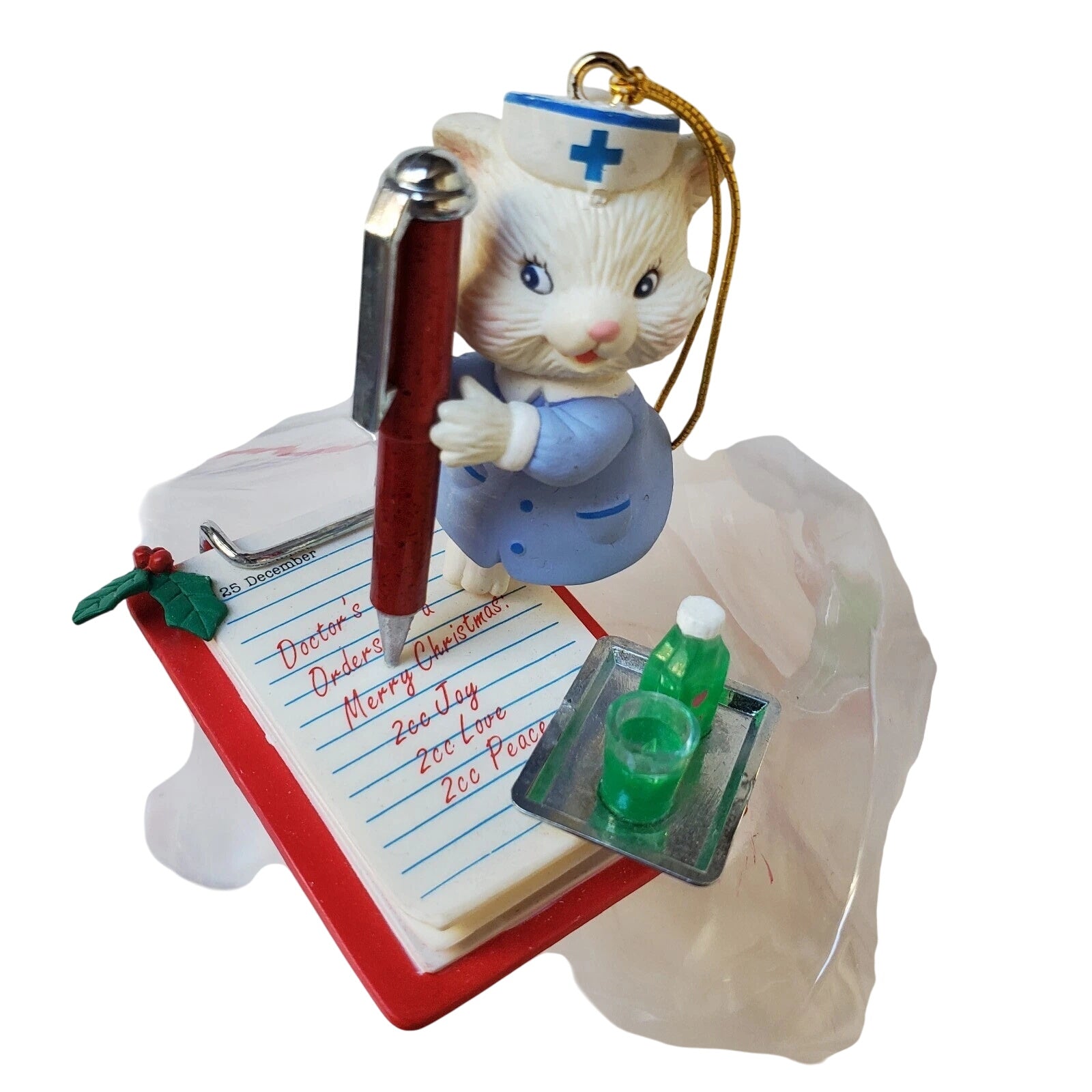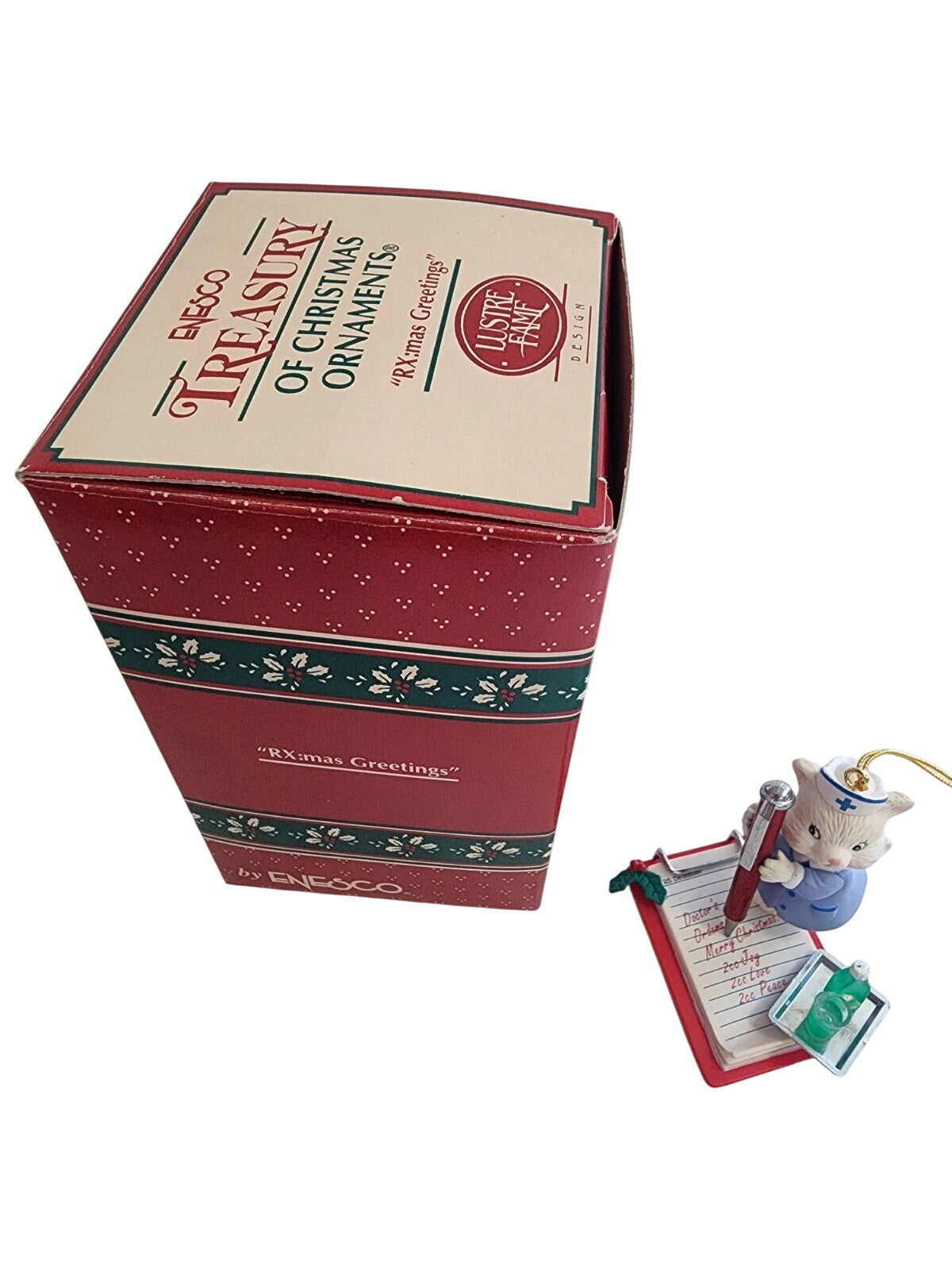 Celebrate the holiday season with a touch of whimsy and care—this 1995 “RX:mas Greetings” ornament features a cheerful kitten dressed as a nurse, holding a prescription pad that spells out holiday joy. Crafted in durable ArtPlas-style molded plastic with a hand-painted finish, its playful medical motif makes it a standout for collectors of theme-novelty ornaments, cat-lovers, healthcare professionals, and anyone seeking a unique Christmas décor piece. With its vintage charm and collectible appeal, it’s ideal for gifting or display in a curated holiday collection.