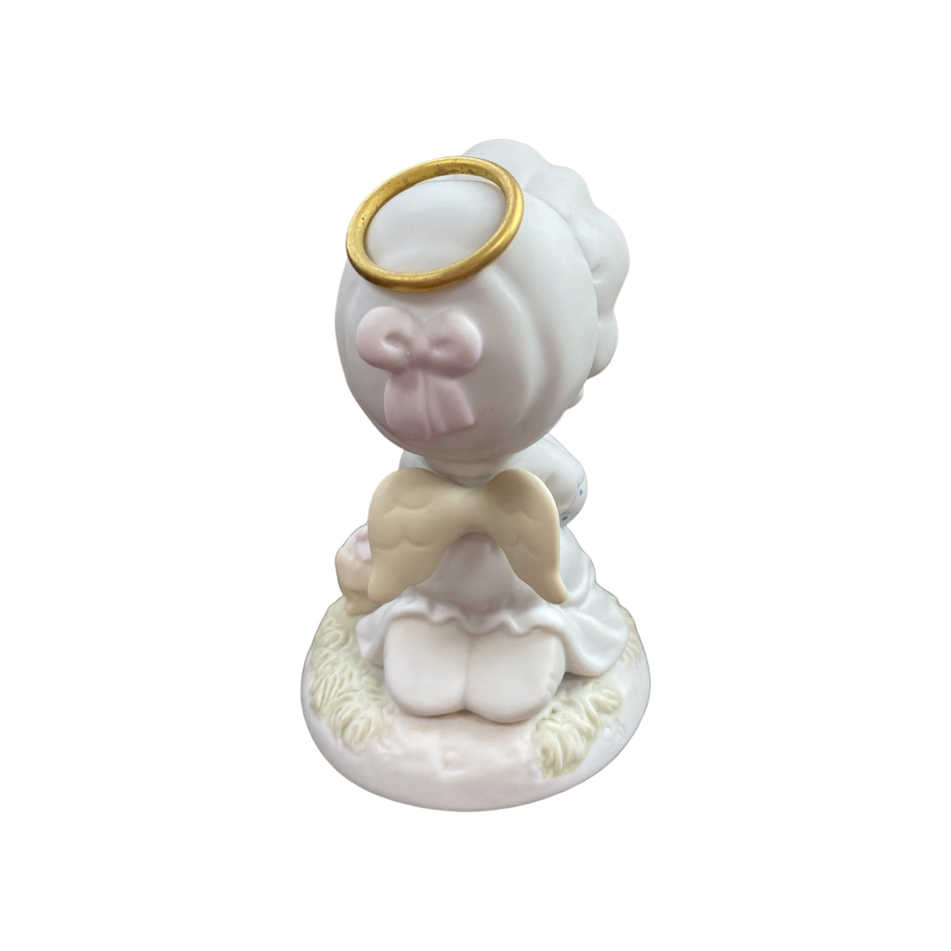 This heartfelt 1995 Precious Moments figurine depicts a gentle angelic child figure kneeling as she “sows seeds of kindness,” holding a small bag of seeds with a hopeful expression that embodies the brand’s signature themes of compassion and encouragement. Crafted from fine porcelain with a matte, hand-painted finish and pastel tones, it’s a meaningful piece that celebrates kindness and makes a touching gift or display item for collectors and loved ones alike.