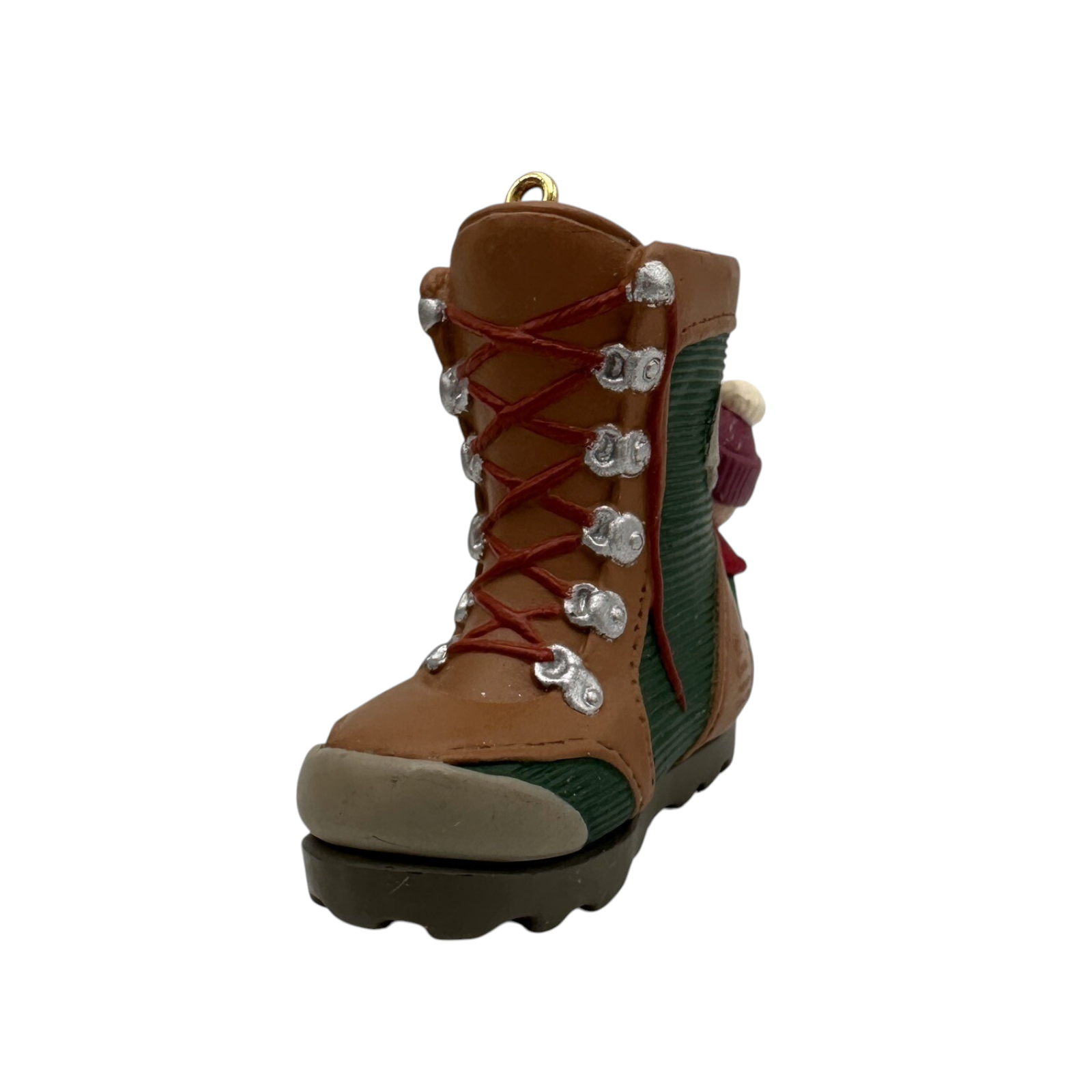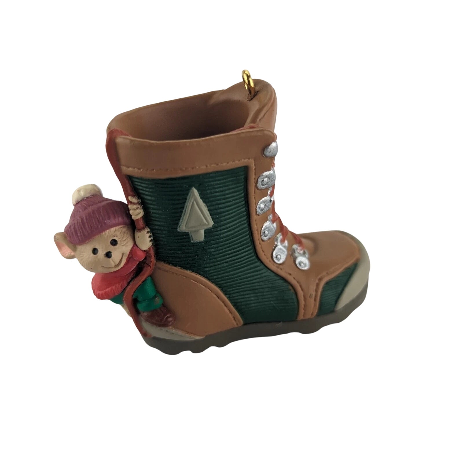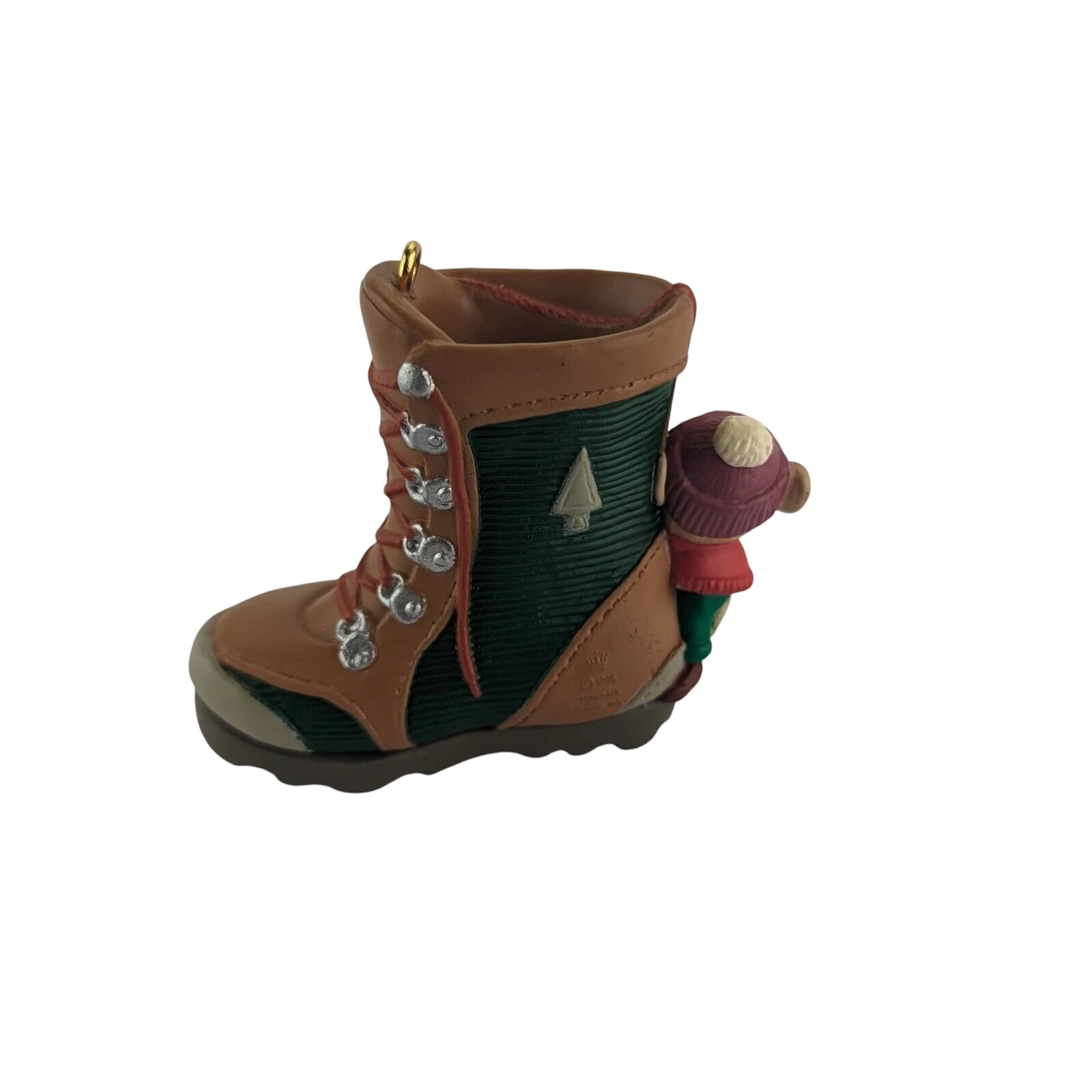 Embark on a whimsical journey with the 1995 "Takin' a Hike" ornament. This charming piece features a playful mouse hitching a ride on a detailed green and brown hiking boot, complete with a tree emblem and silver laces. Crafted with care, it's a delightful addition to any Christmas tree or collection. The ornament comes in its original Hallmark box, ensuring its preservation for years to come. No batteries or cords are needed—simply hang and enjoy the festive spirit it brings.
