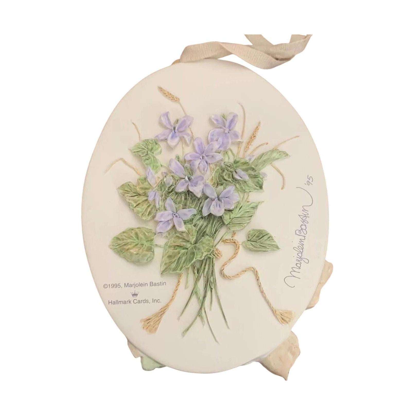 Bring a breath of garden serenity to your holiday décor with Violets and Butterflies, a 1995 premium Keepsake ornament from Hallmark’s Nature’s Sketchbook series. Designed by Marjolein Bastin and sculpted by artist Joyce Lyle, this elegant piece features a woven basket filled with purple violets, delicately accented by several fluttering orange butterflies against a lightly shaded background.