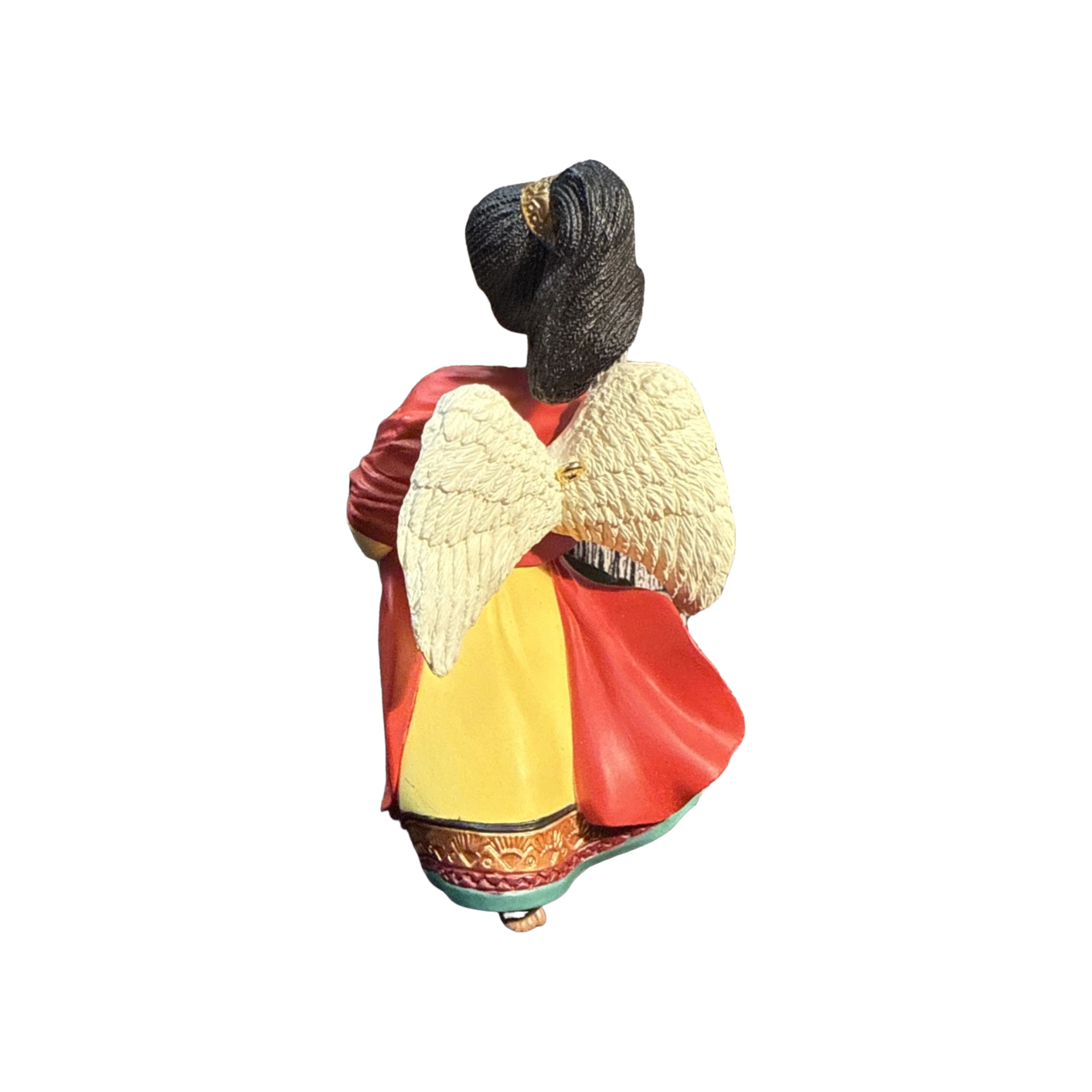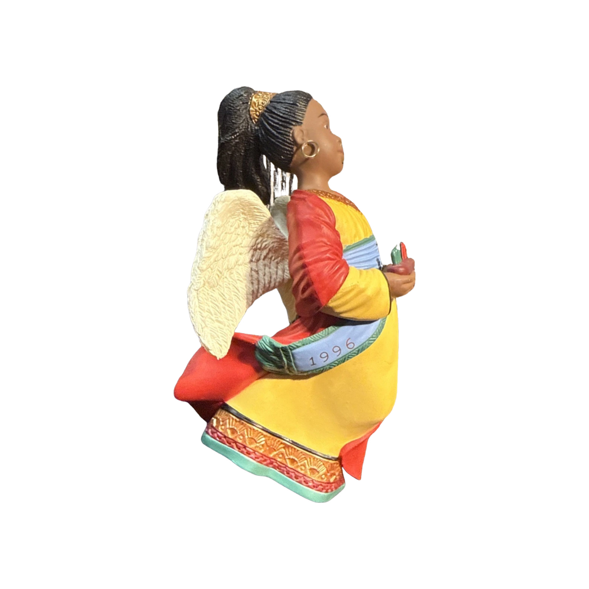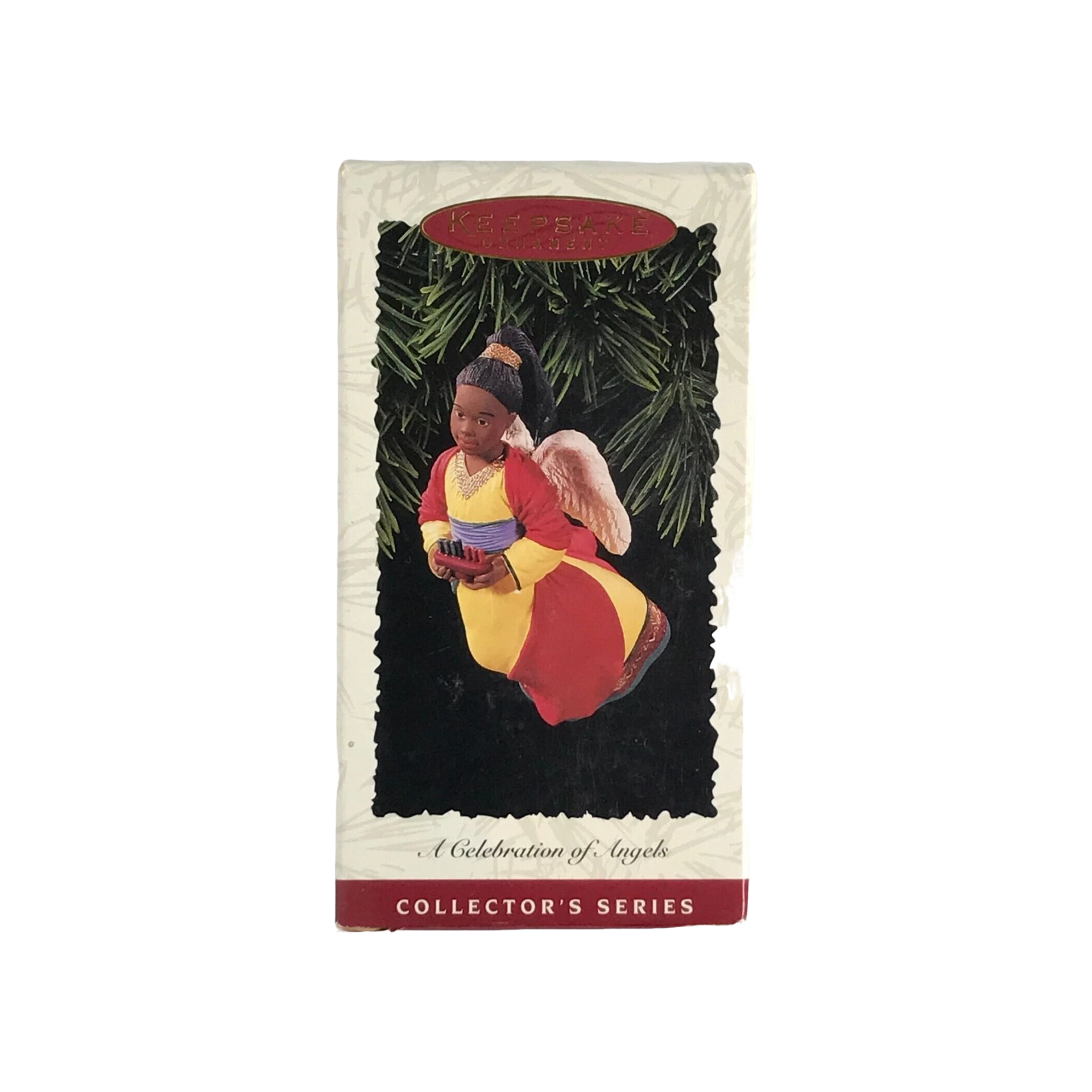 The 1996 A Celebration of Angels Hallmark ornament features a graceful angel in flowing robes, holding a golden horn as she descends with serene elegance. Sculpted with classic mid-90s Hallmark detailing, the ornament showcases soft pastel tones, gold accents, and delicate textures that enhance its heavenly design. This item typically comes with its original Hallmark box and protective packaging insert. No cords, batteries, or external power are required—this ornament displays beautifully on any holiday tree without additional components.