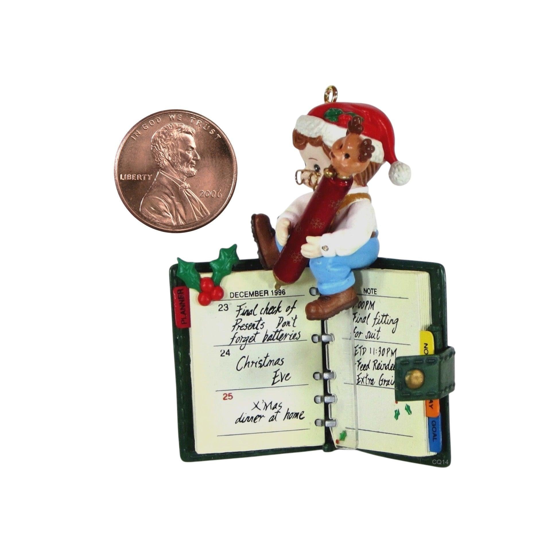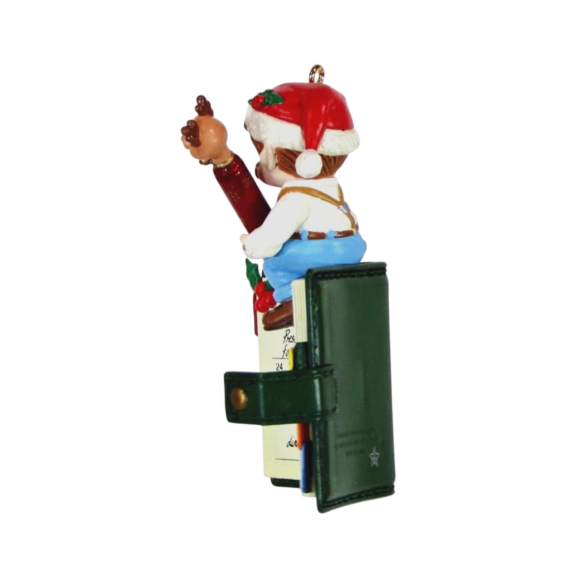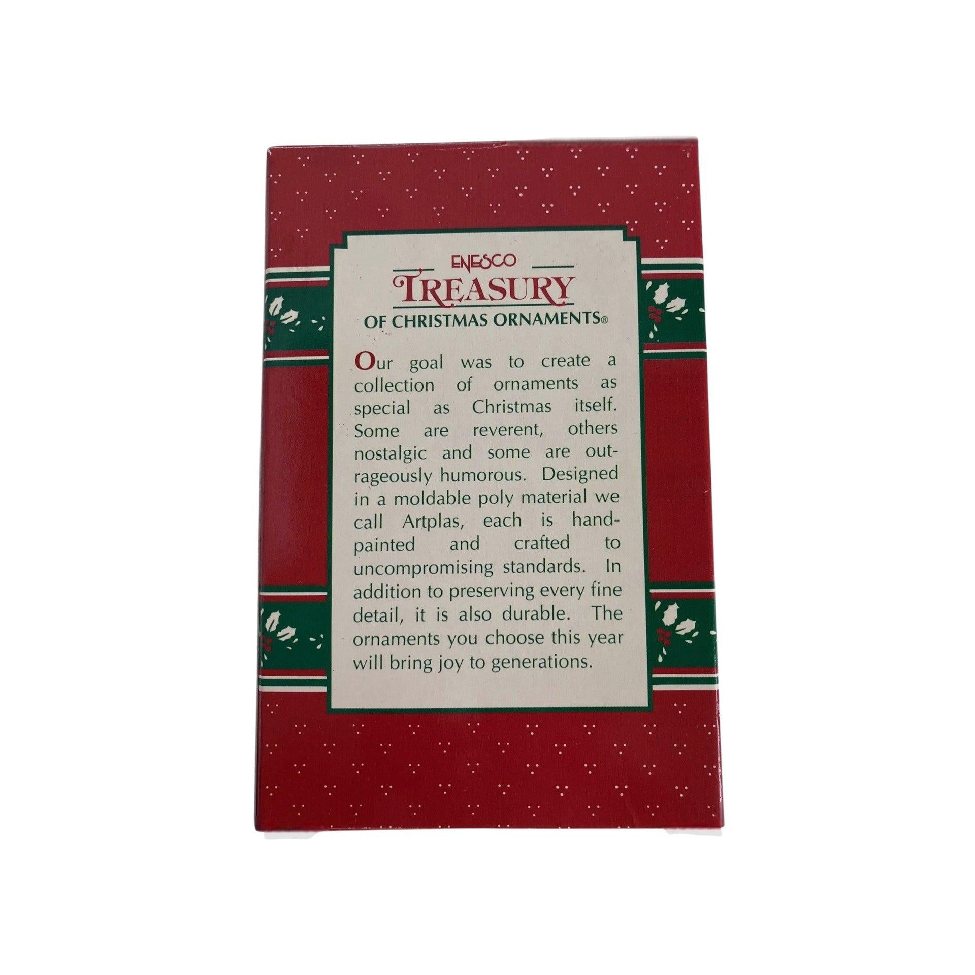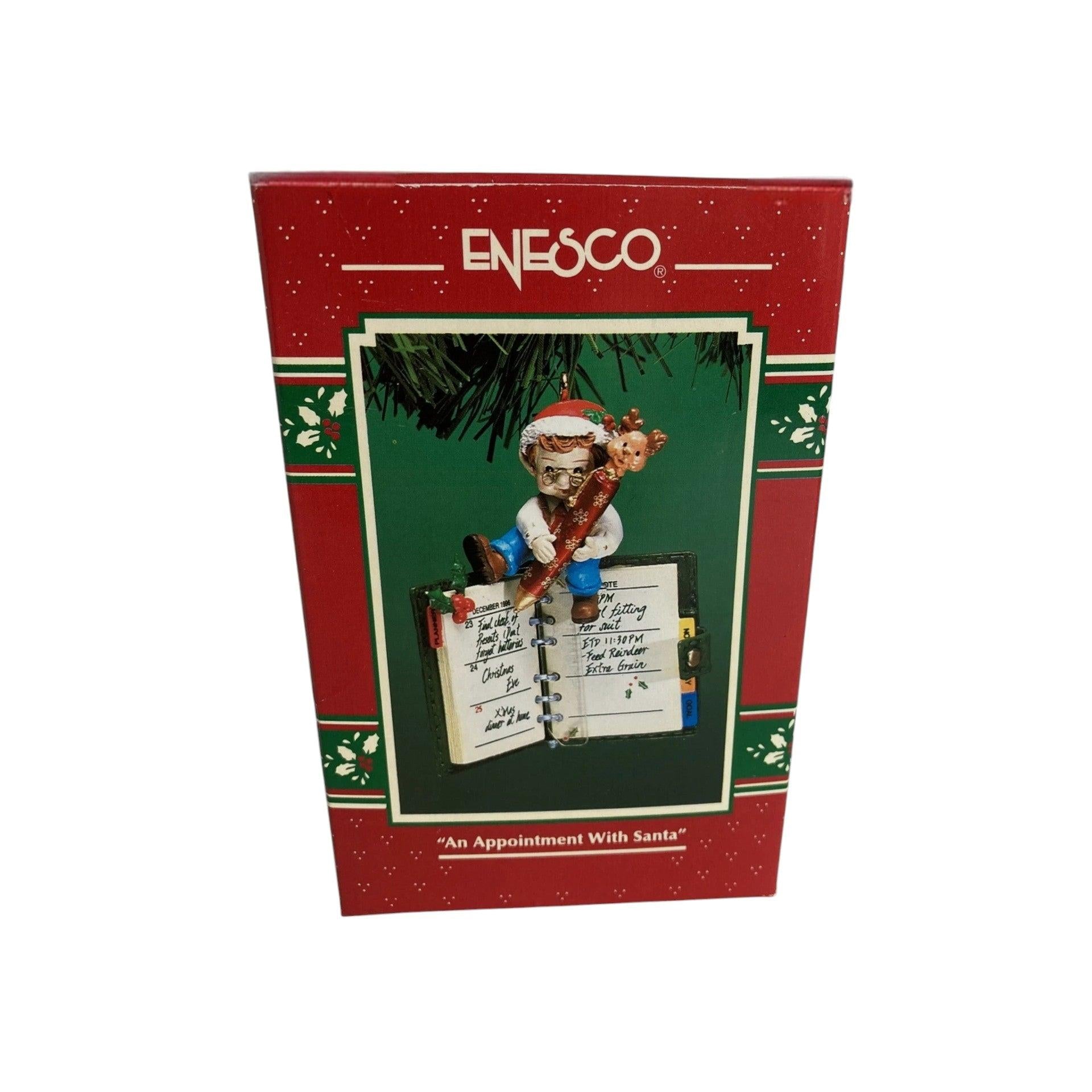 This 1996 “An Appointment With Santa” ornament features a whimsical elf character holding an appointment book—capturing the humour of holiday scheduling with a playful twist. The design blends bright festive colours, textured resin and plastic materials, and sculptural detail in the elf’s attire and book-prop, giving it a charming, collectible feel. As part of Enesco’s “Treasury of Christmas” line, it stands out for its lighthearted theme and display-friendly size, making it a delight for holiday decorators and ornament enthusiasts alike. Its blend of organisation-themed humour and seasonal charm makes it a memorable piece for collectors who enjoy the quirky side of holiday décor.