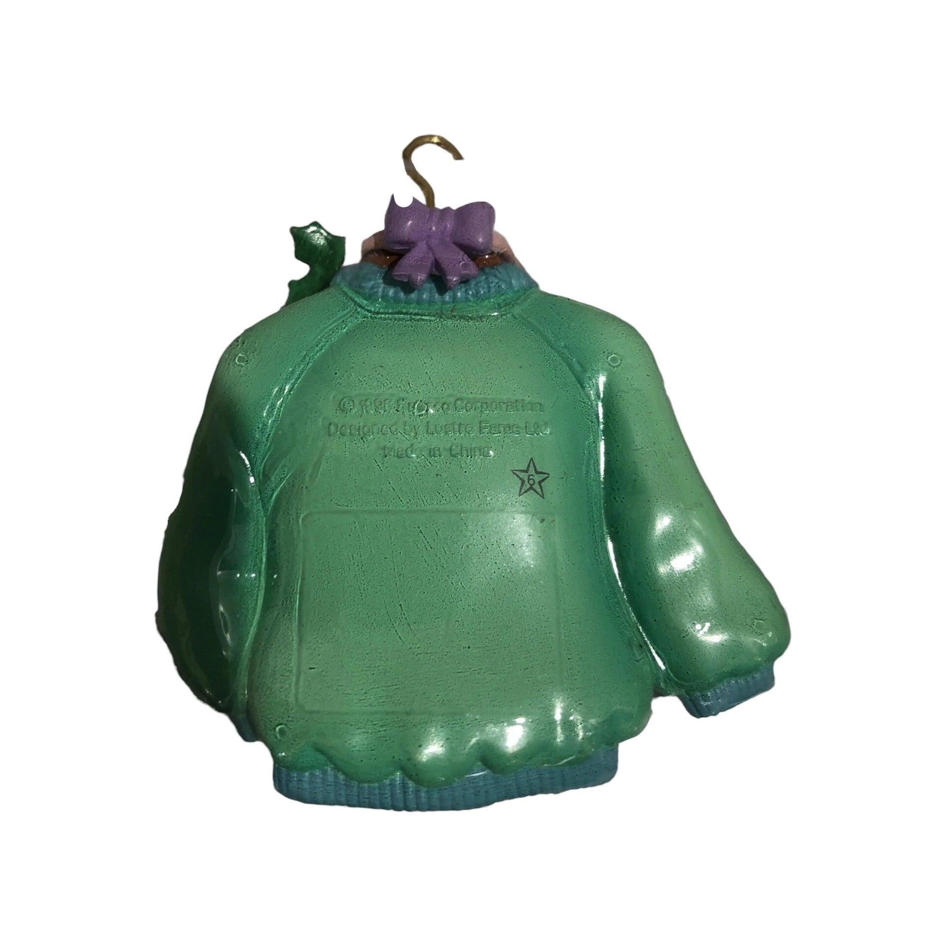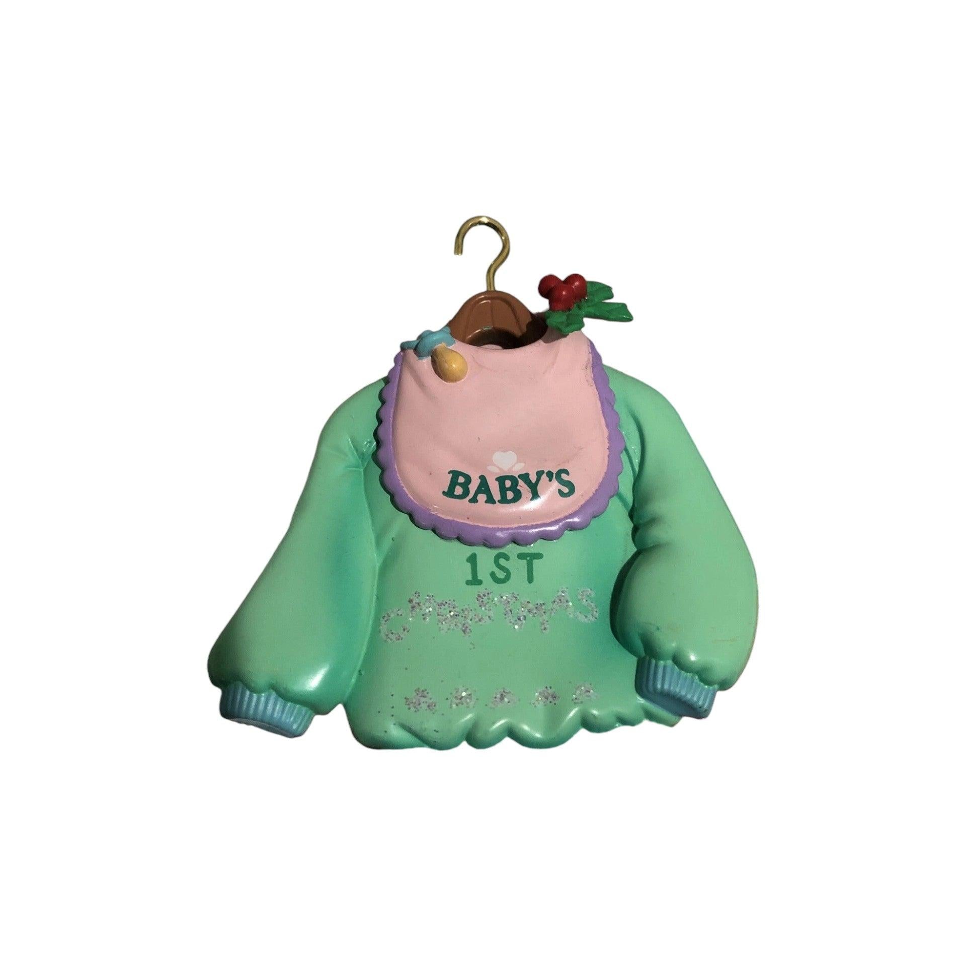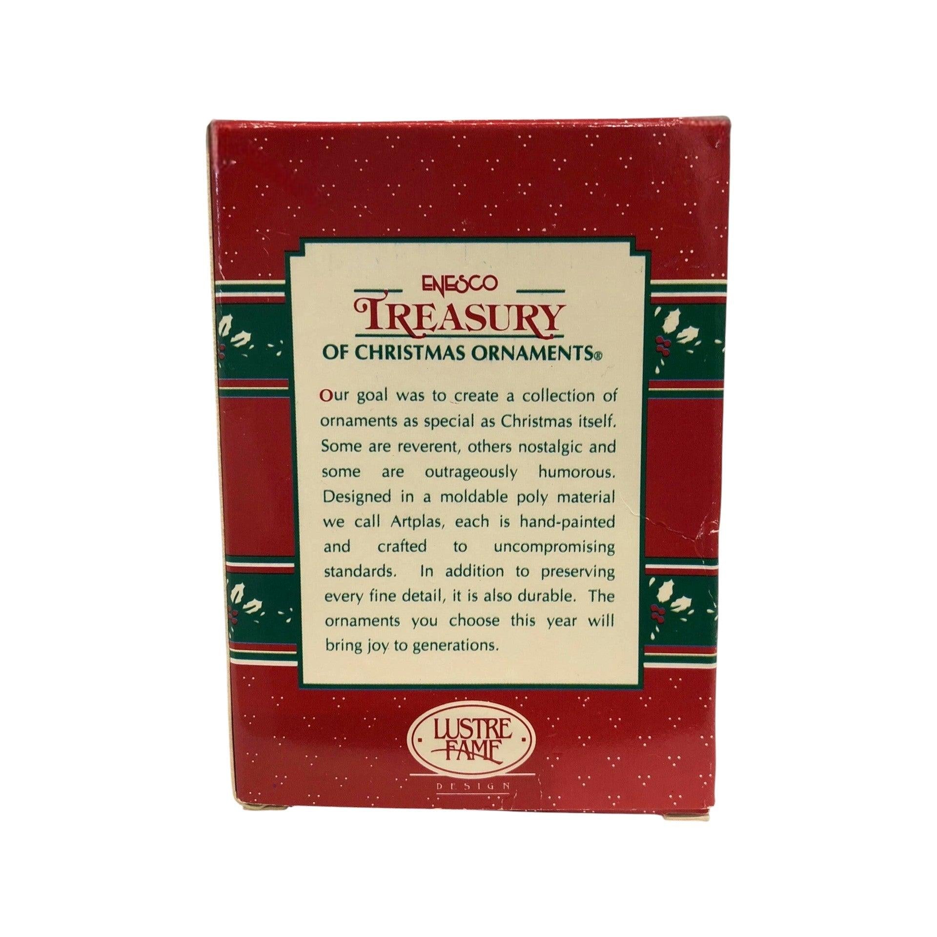 Commemorate a special holiday milestone with this charming 1996 Enesco ornament! Shaped as a cozy miniature sweater bearing the inscription “Baby’s First Christmas,” it’s crafted in durable moulded plastic with hand-painted detail and rich holiday touches. The compact size makes it ideal for first-year trees, baby rooms, or as a keepsake gift for new parents and grandparents. With its timeless design and collector appeal, this piece strikes the perfect balance of sentiment and craftsmanship.